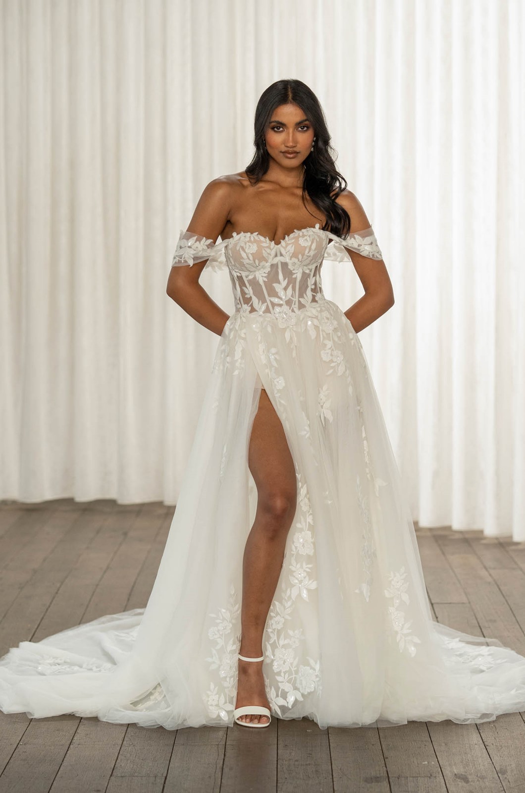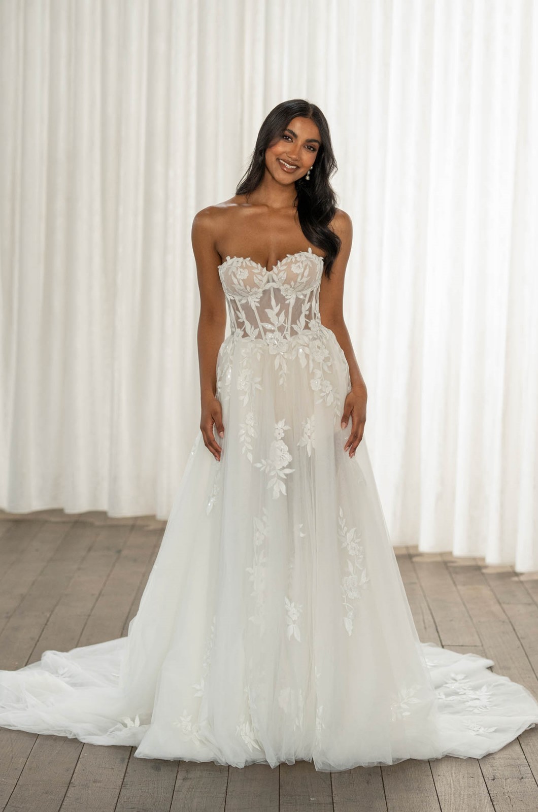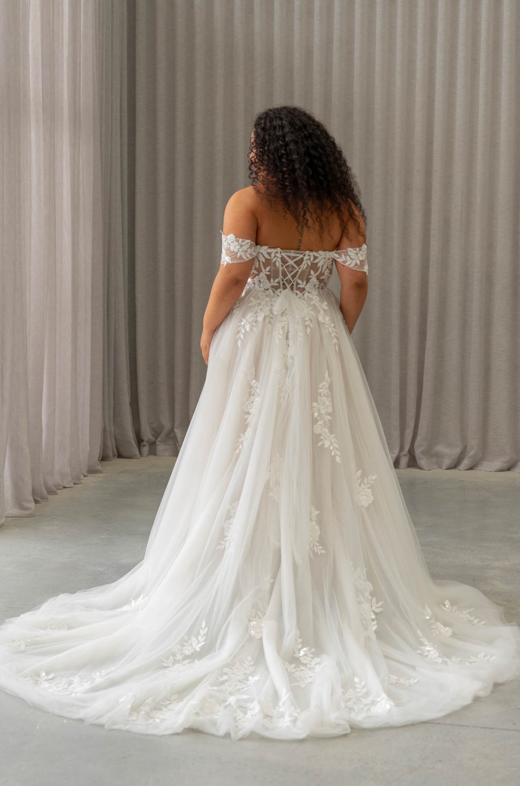 Her sweetheart neckline frames the illusion bodice, supported by exquisite exposed boning, and laced at the back for a secure fit from size 2 through to our curve sizes up to 28.