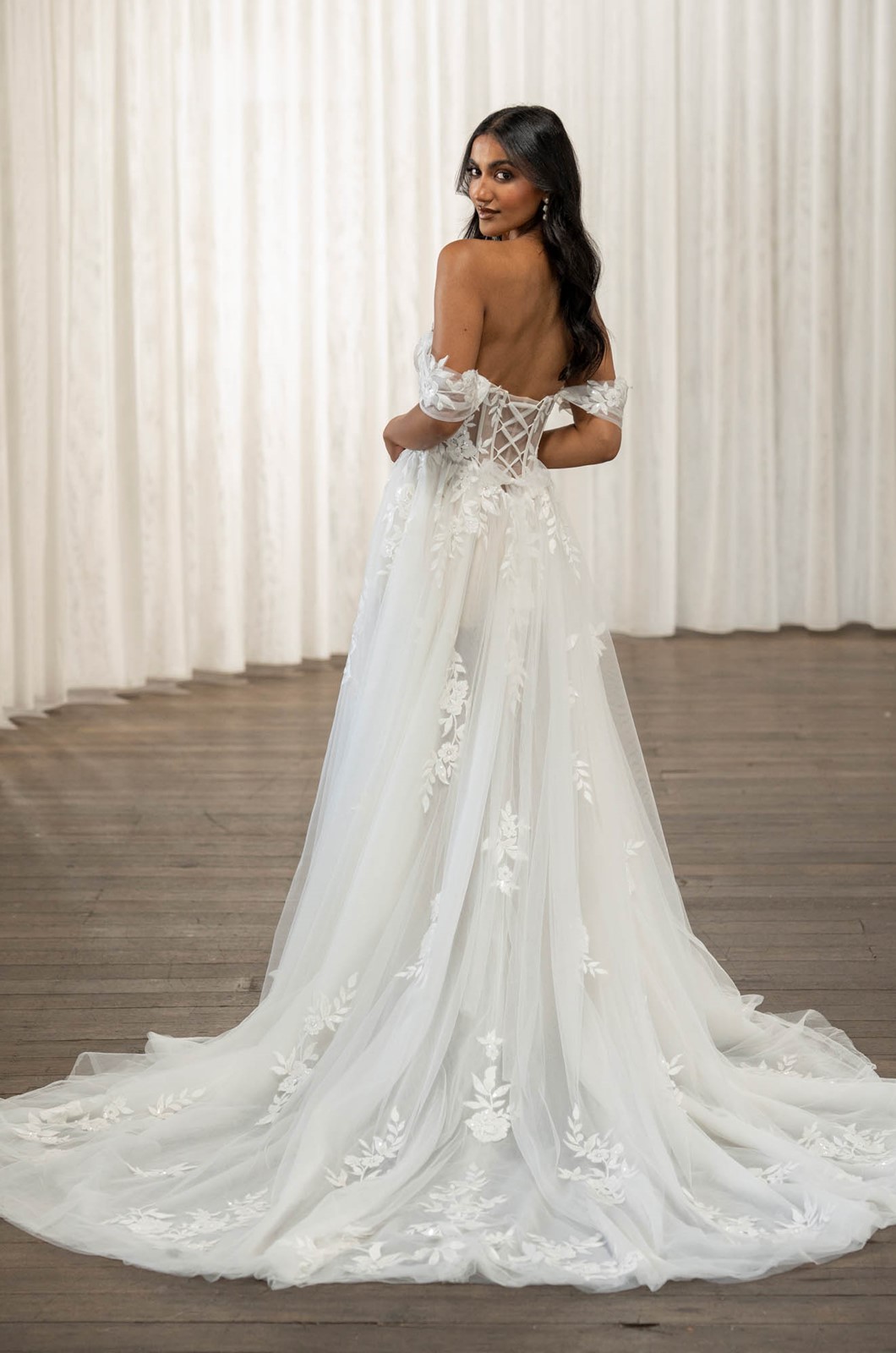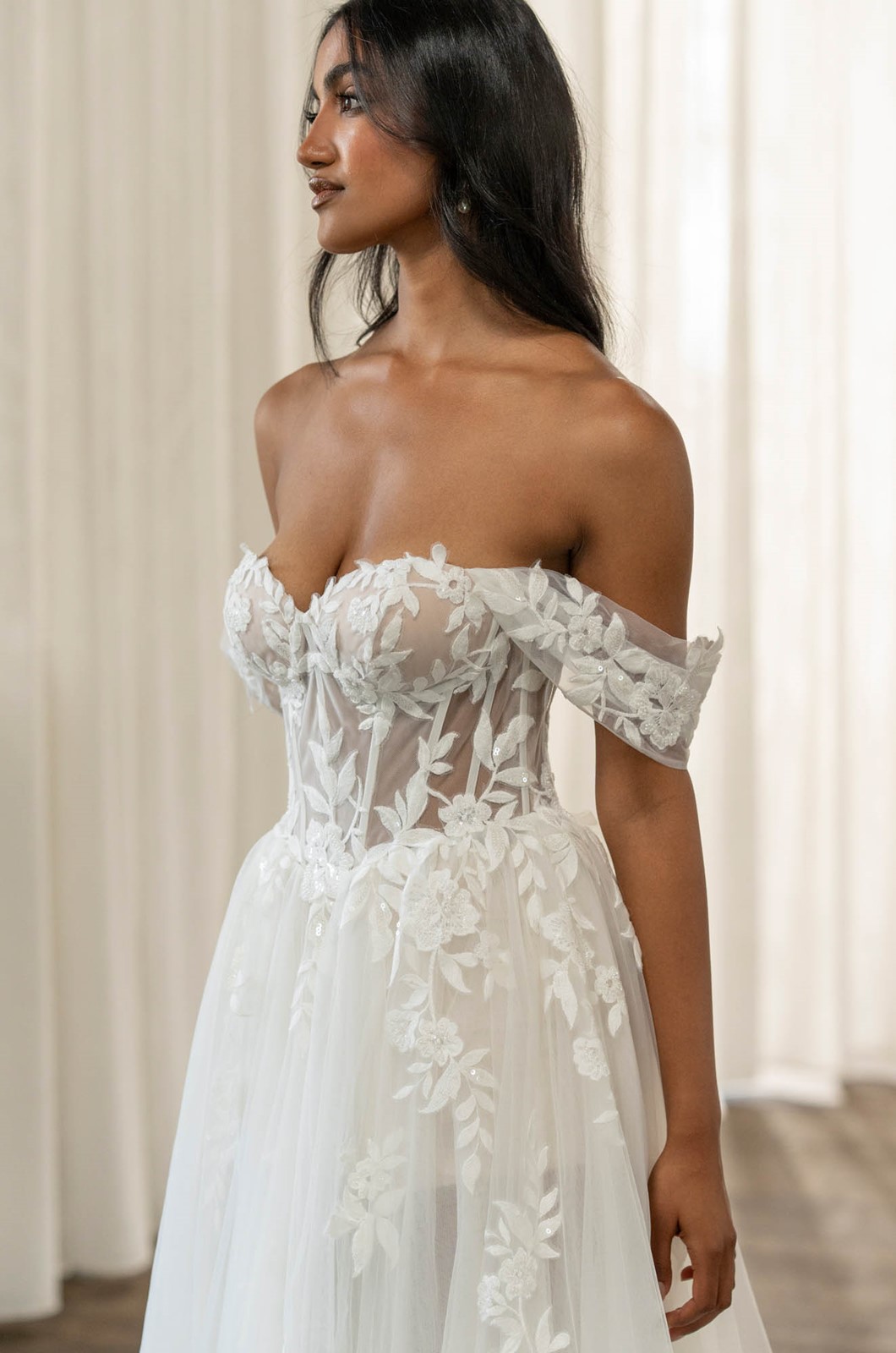 Her full lace A-line wedding dress has a light and ethereal quality with delicate botanical-inspired lace detail, flower motifs and a touch of sequin sparkle.