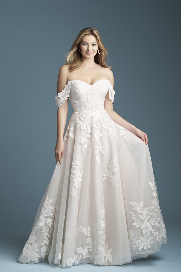 This A-line wedding dress features a romantic sweetheart neckline and off-the-shoulder sleeves, crafted from airy sparkle tulle. Bold, oversized lace appliques add striking texture and a fresh, modern twist on a classic silhouette.