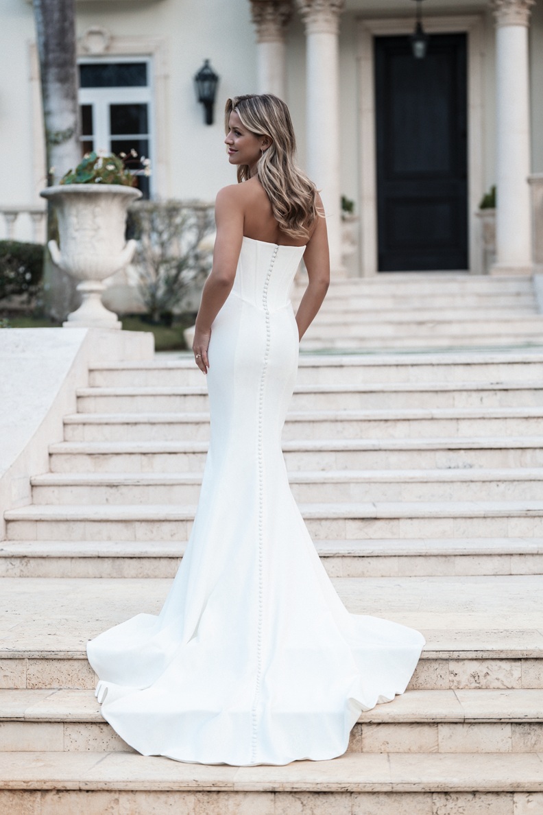 This sleek crepe sheath gown stuns with a corset-style bodice, featuring a draped sweetheart neckline and off-the-shoulder sleeves. A subtle Basque waistline adds sculpting, while covered buttons trail down the back of the train for a refined finish.