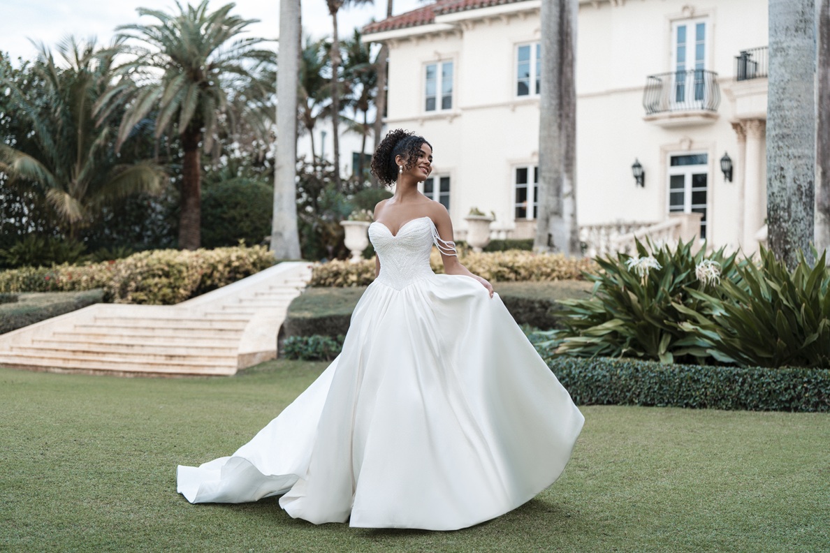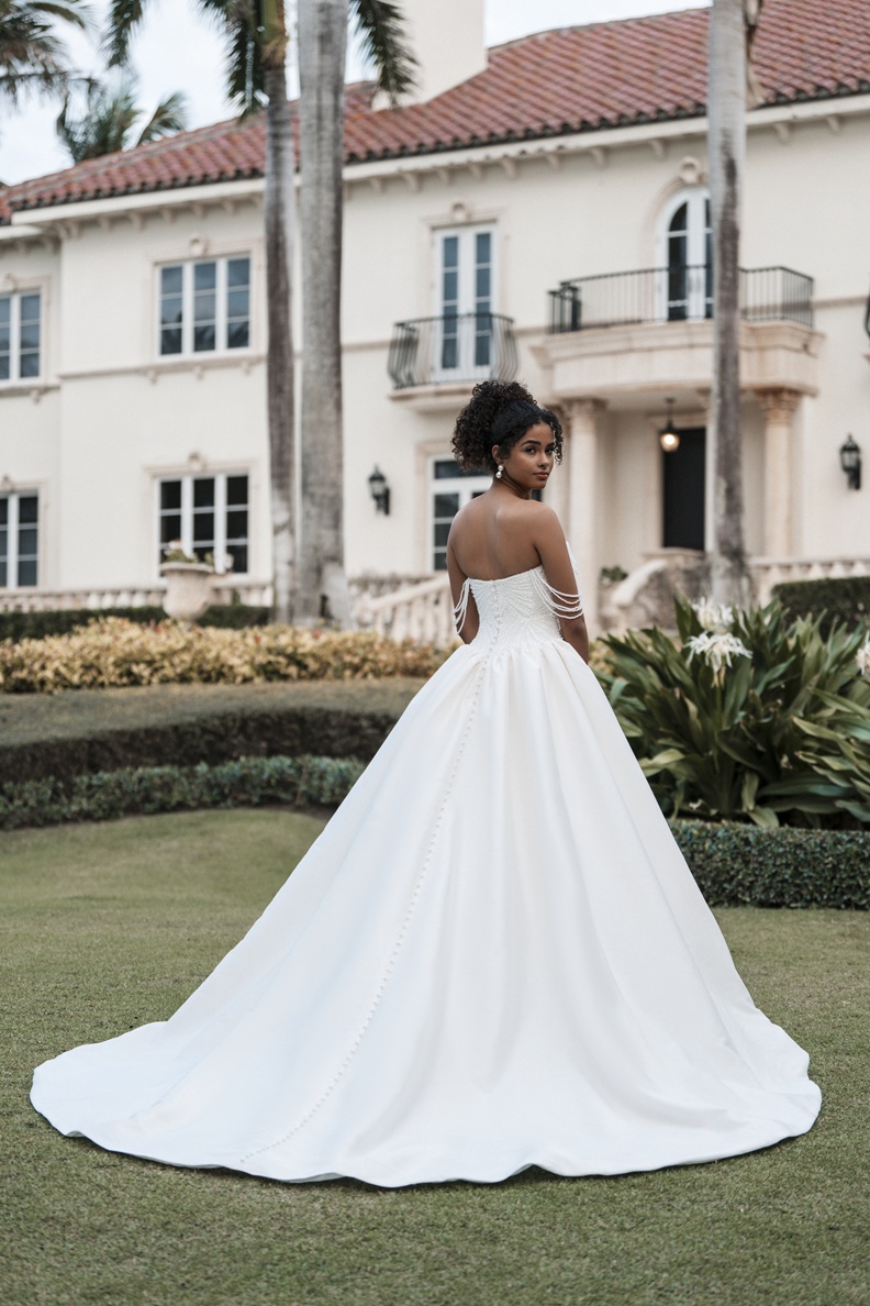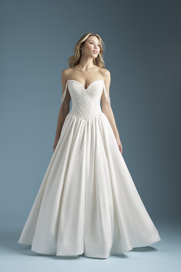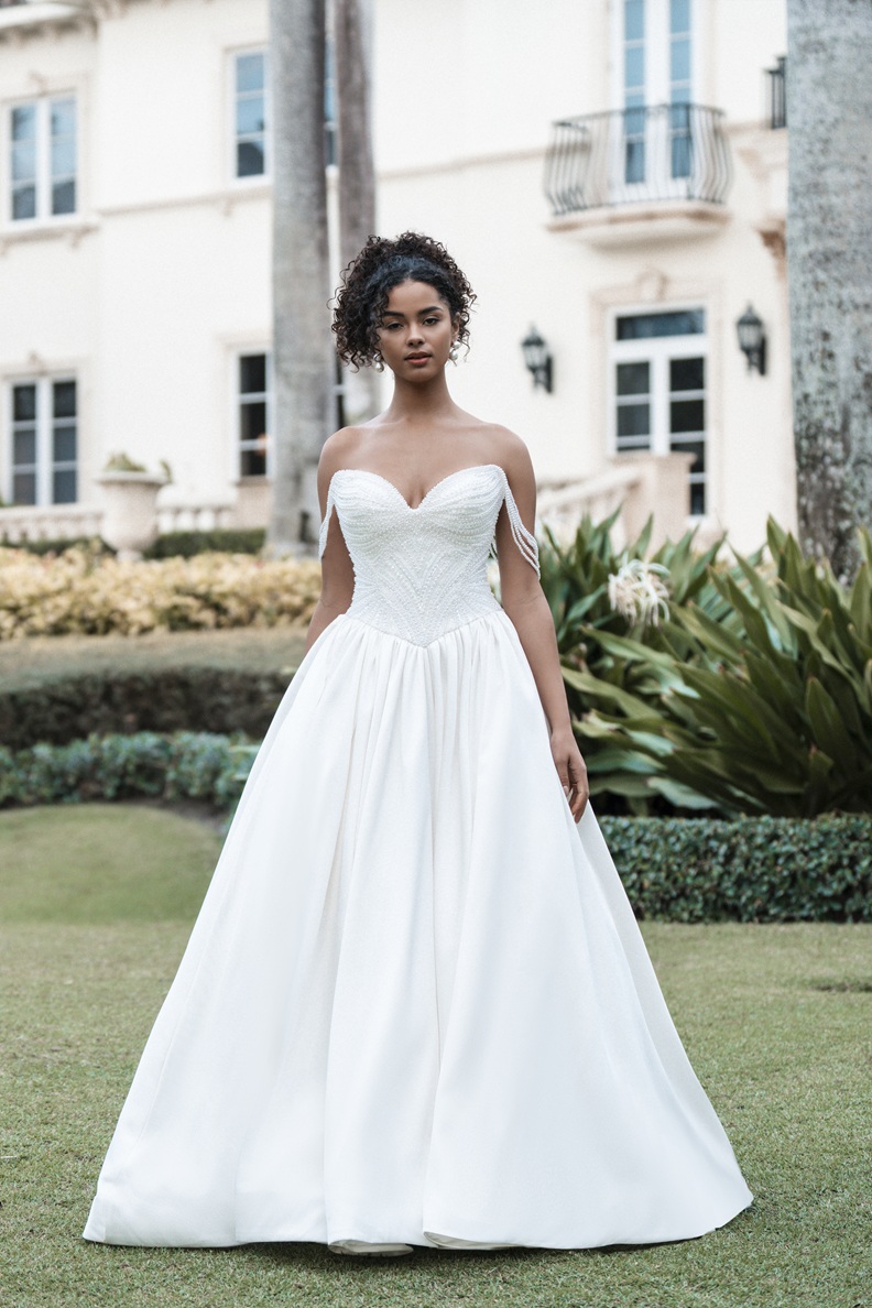 This pearlescent Mikado ballgown features a sculpted sweetheart neckline with detachable pearl off-shoulder beaded straps. A defined Basque waist gives way to a gathered skirt for maximum fullness and dramatic movement.