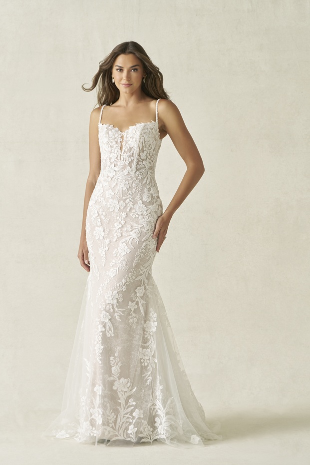 This shimmering sheath gown combines modern allure with delicate detailing. Beaded and sequin lace appliques trail over layers of sequin and sparkle tulle, catching the light with every movement. The V-neck bodice and slender spaghetti straps create a graceful, feminine shape, while the low back and natural waist enhance the gown’s sleek, sculpted silhouette. Elegant and luminous, this design captures the perfect balance of texture, shimmer, and sophistication.