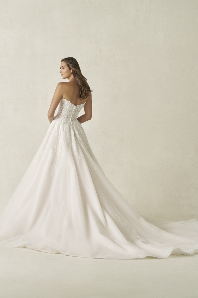 Radiant and romantic, this strapless ballgown features sequin and bugle-beaded lace appliques accented with silver stitching over layers of glitter tulle. The fitted bodice glimmers softly in the light, balanced by a voluminous skirt that moves with airy grace. Designed with a natural waistline, this gown captures Allure’s signature blend of texture and sparkle. Pair with Sleeves Style A1418SL, sold separately, for a dramatic finishing touch.