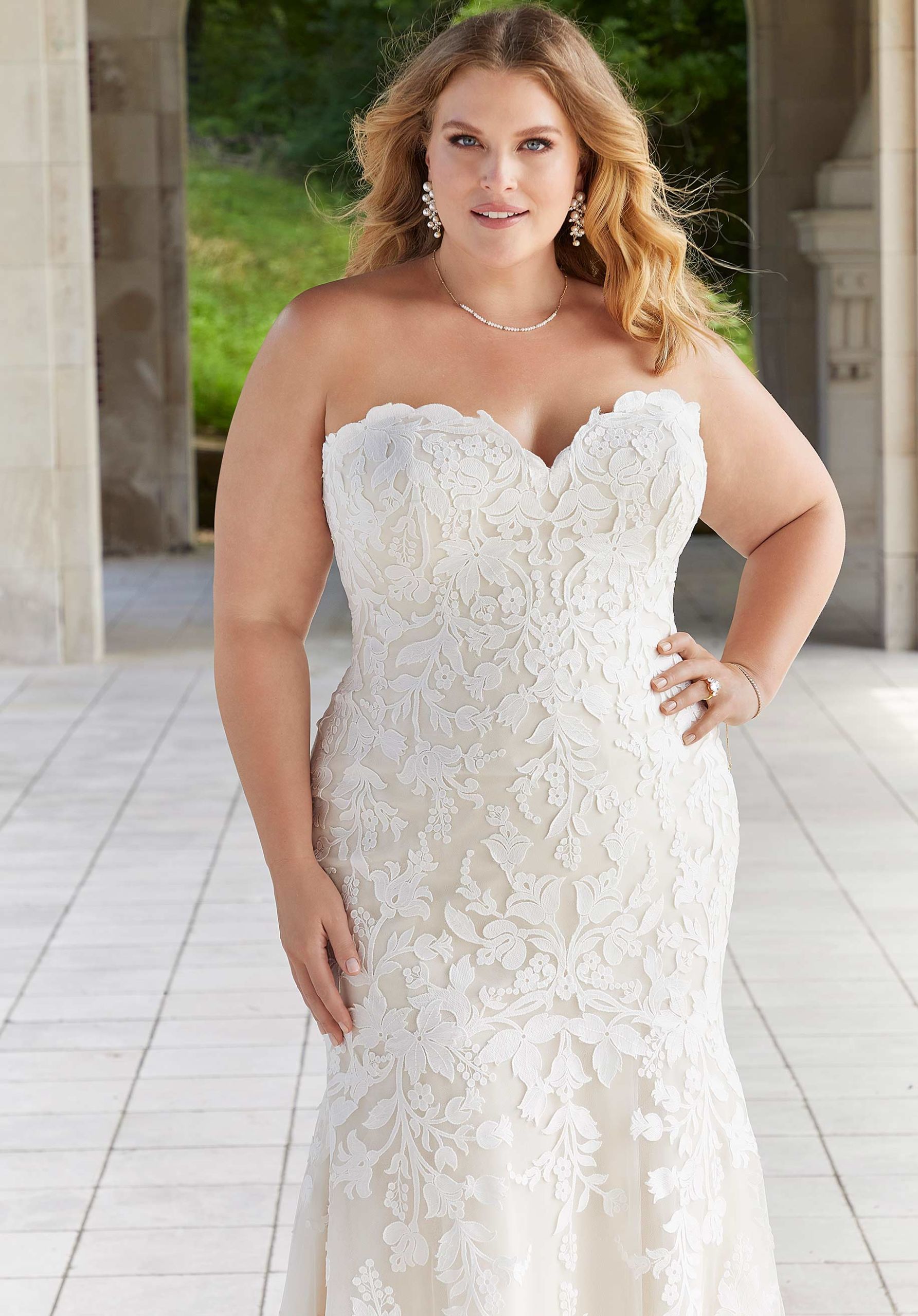 Our Elizabeth wedding dress is blooming with beauty featuring whimsical allover embroidered floral appliqués. The fit and flare silhouette perfectly hugs the body, accentuating your shape, while the lovely sweetheart neckline and detachable, off-the-shoulder sleeves add a touch of romance. We love the subtle illusion back detail and the sheer petal train to match the botanic inspiration.