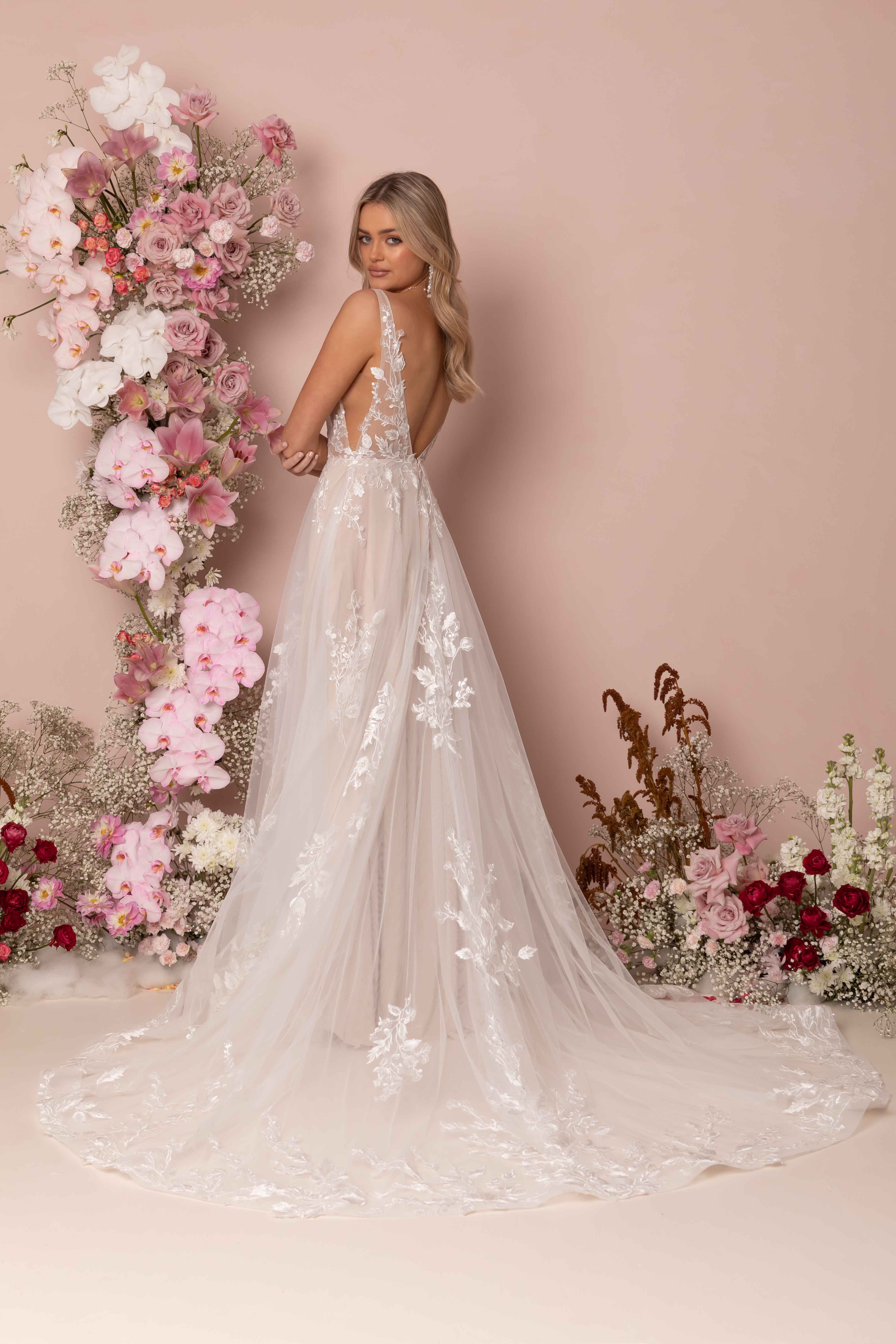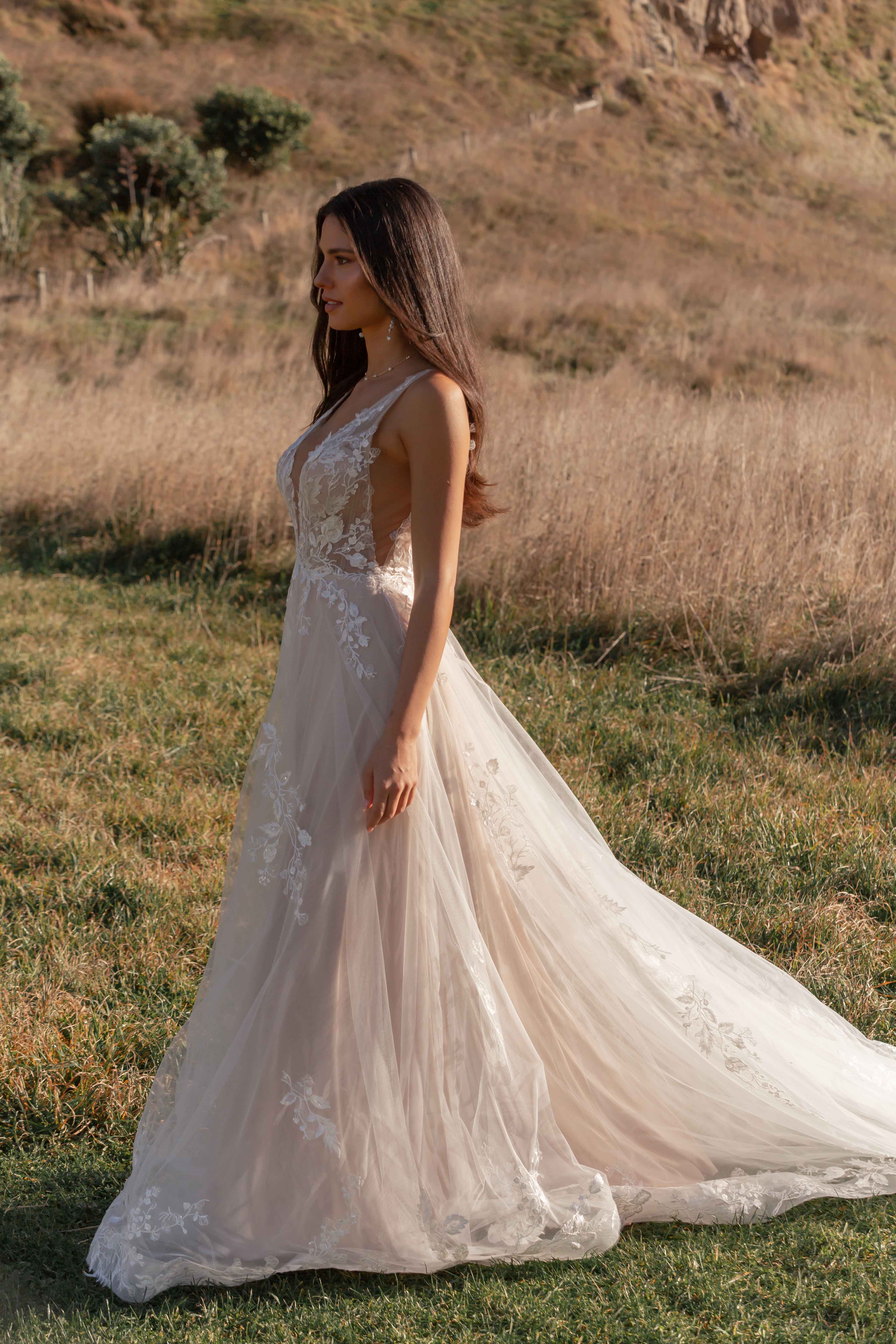 Kara is a dream of romantic lace and elegance, designed for the whimsical bohemian bride. This classic A-Line fit flatters brides of all shapes and sizes, with strategically placed floral accents to highlight the bust and waistline. The sequin and embroidered floral lace motif bodice; features a plunging V neckline and deep V back secured with illusion lace for refined elegance. Whilst the 8-piece boning, cup construction offers all-day support and confidence. Comfort also comes from the stretch jersey lining, making it a breeze to dance all night long or walk down the aisle effortlessly. Ideal for the bride opting for a hair updo to show off the elegant open back design. The full circle skirt with 25” illusion train trimmed with horsehair ensures the skirt maintains its structure and flow at all times, making it easy to be photo-ready.