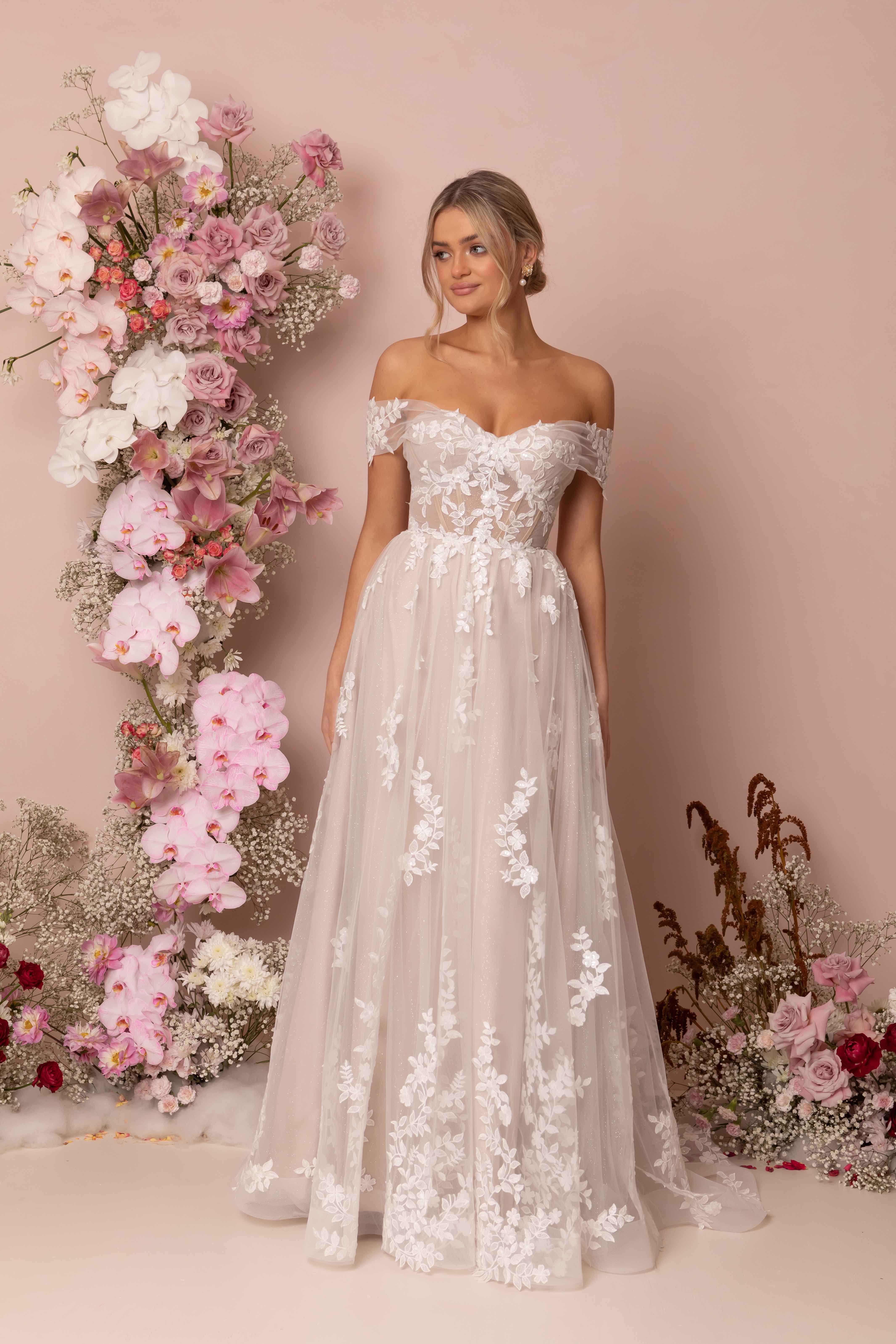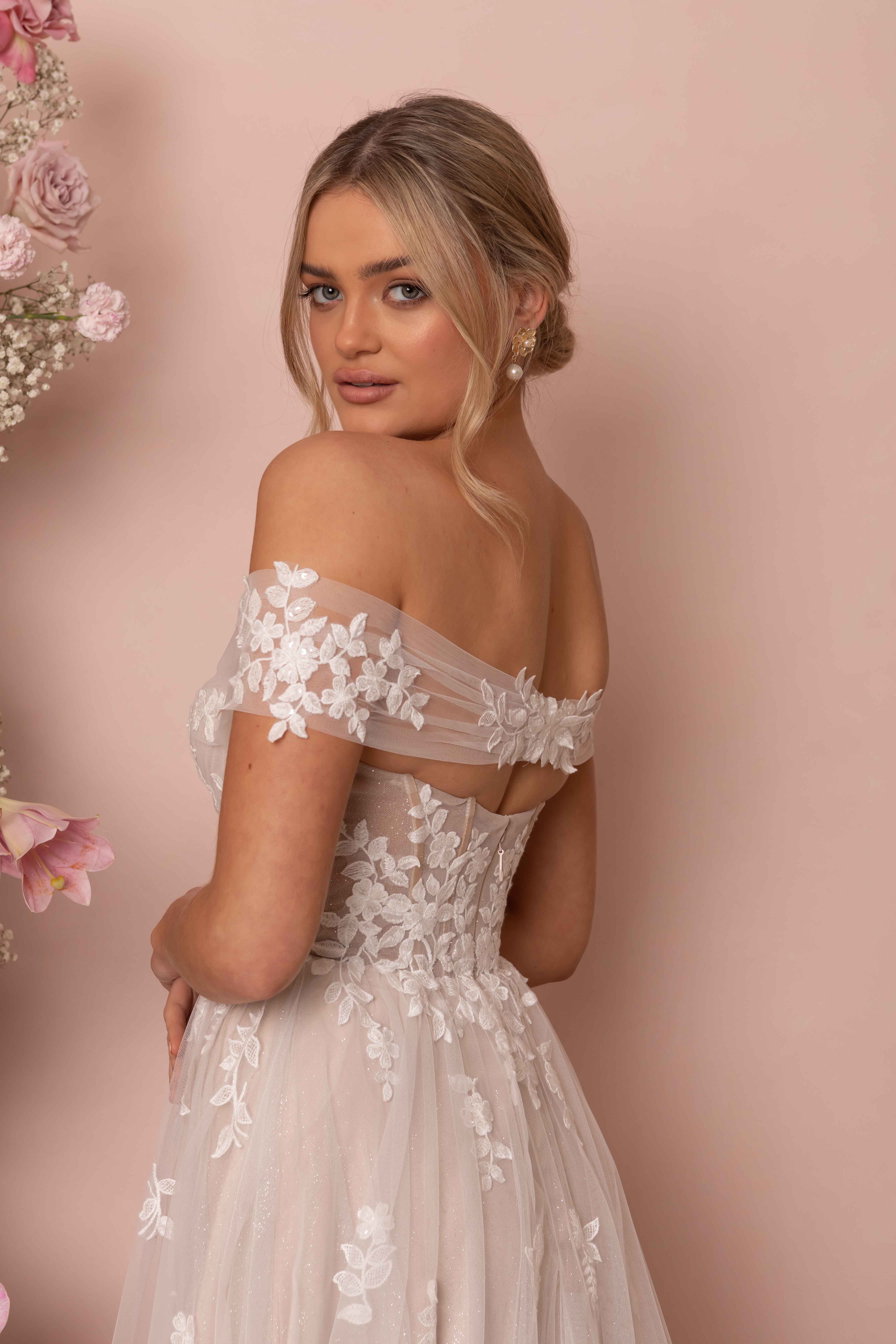 Katiya is wildly feminine and effortlessly romantic with her eyes focused on the end of the aisle and her fairy-tale ending. Delicately crafted from sequin and embroidered lace motif with soft glitter tulle, Katiya sparkles beneath the lights and shines all night long. Highlight your decolletage with a soft sweetheart illusion bodice, thick off-the-shoulder straps and delicately placed lace motifs. This sensational gown has a 3/4 circle skirt gathered at the waist to create a full and flowing skirt and 25” illusion train. The detachable train creates a moment of drama to add to the grandeur of Katiya. Katiya’s harmonious blend of design and function ensures for all day support and comfort, with the 15-piece exposed boning, cup construction, as well as the stretch charmeuse lining.