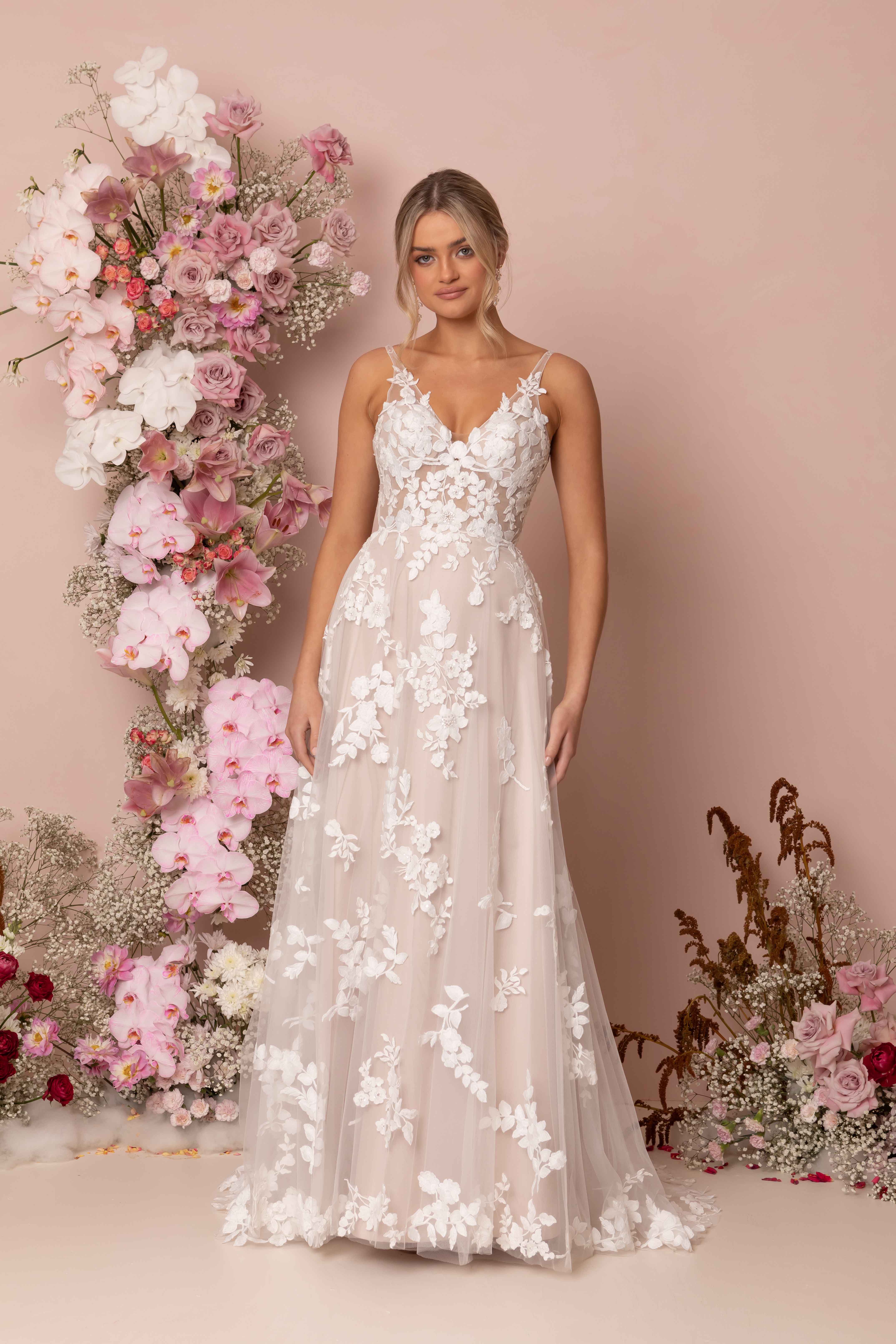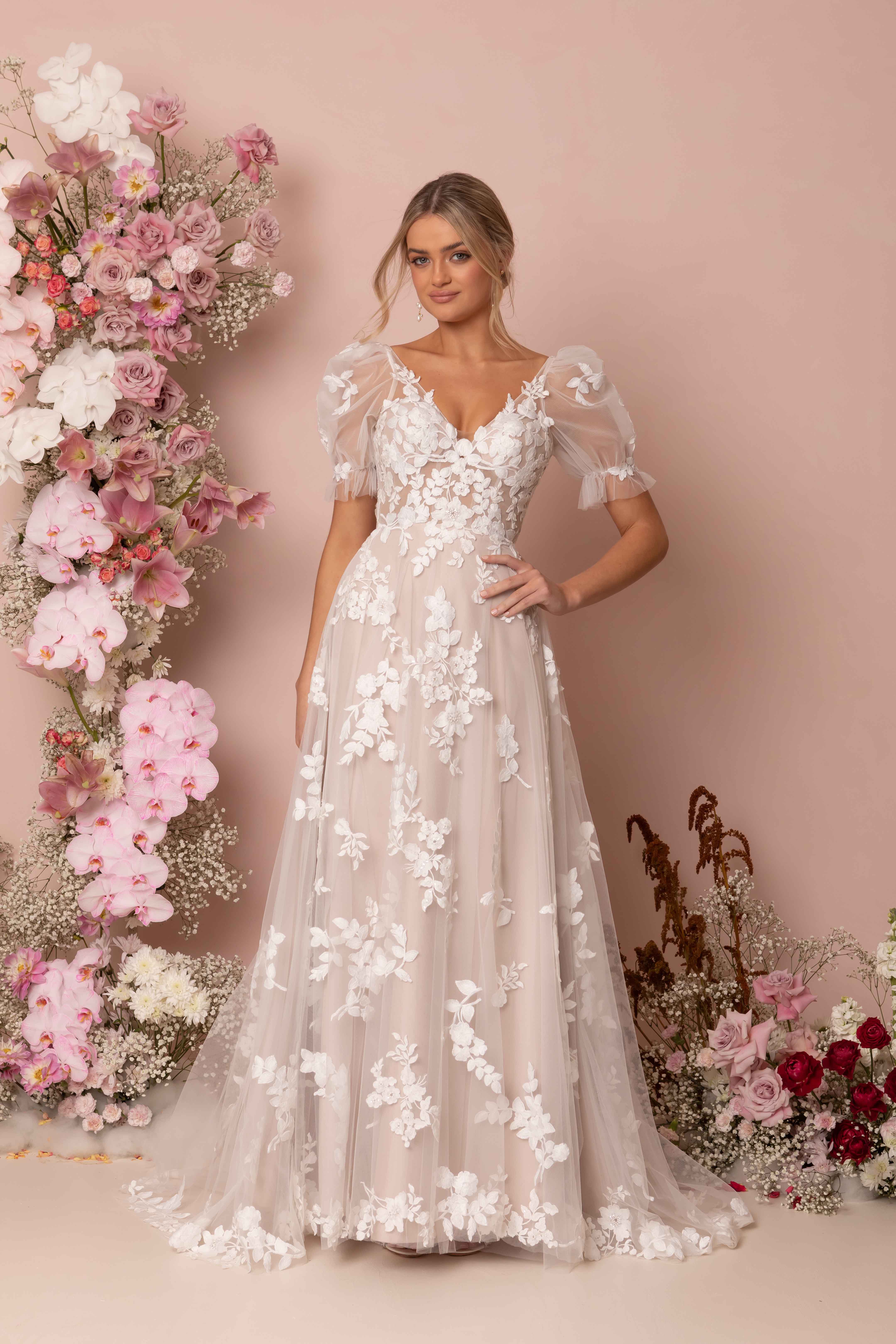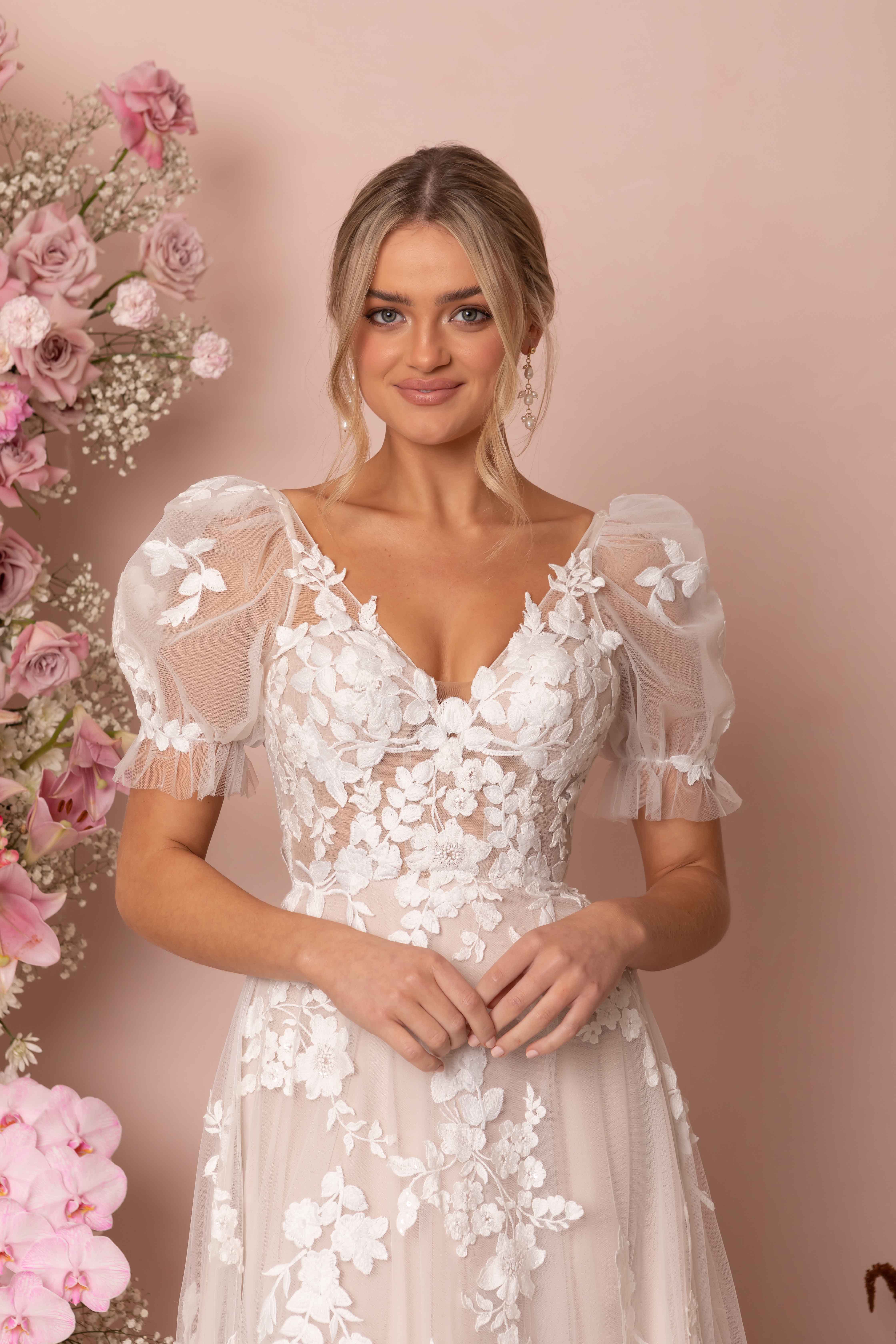 Katrine is a poetic symphony of the modern editorial bride and the delicate feminine romantic. Her classic A-line silhouette is created with a fitted illusion lace bodice featuring a V neckline, illusion shoulder straps and a low back. Botanical sequin lace spills from the bodice into dispersed florals along the 3/4 circle skirt and sweeps across the hemline and the 25” train. The chic detachable short puff sleeves crafted from a sheer tulle and lace motif, add an element of modesty and elegance. The thoughtfully constructed 12-piece boned bodice, bra cups and stretch charmeuse lining, provide all-day support and comfort.