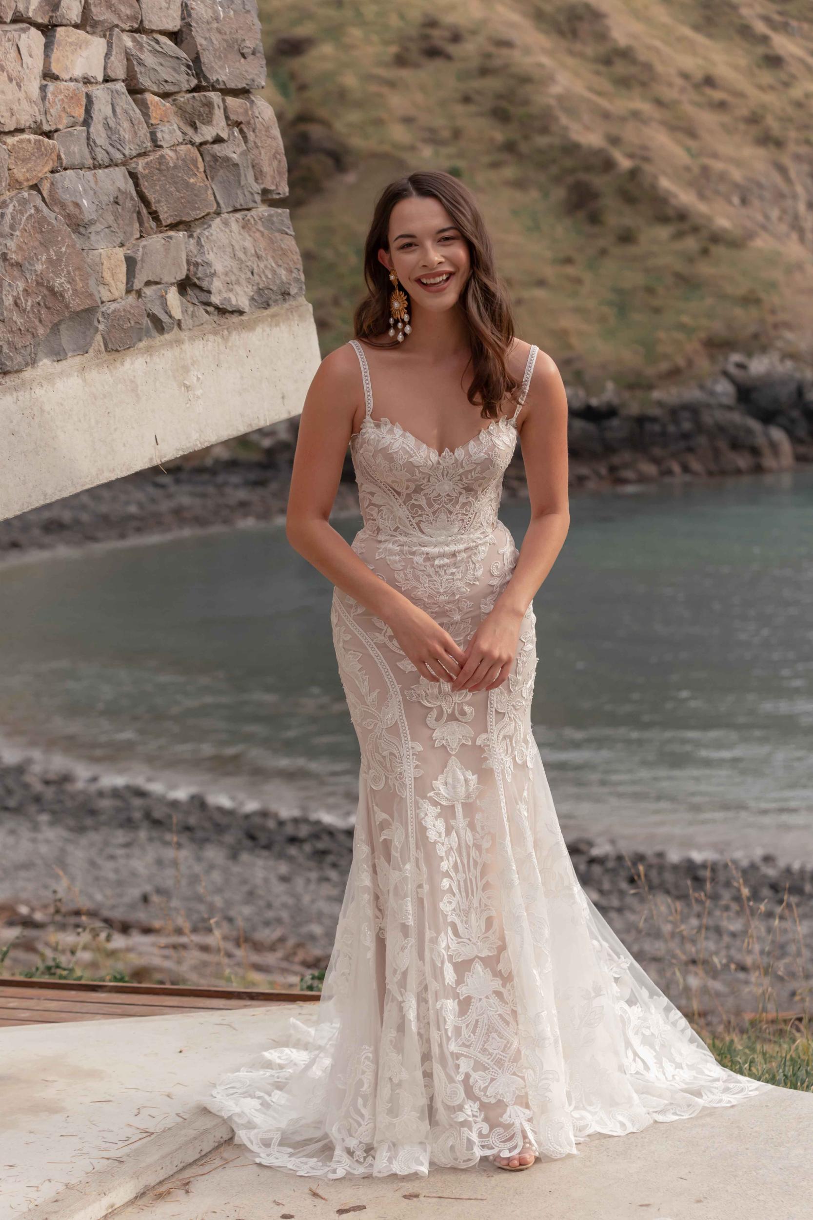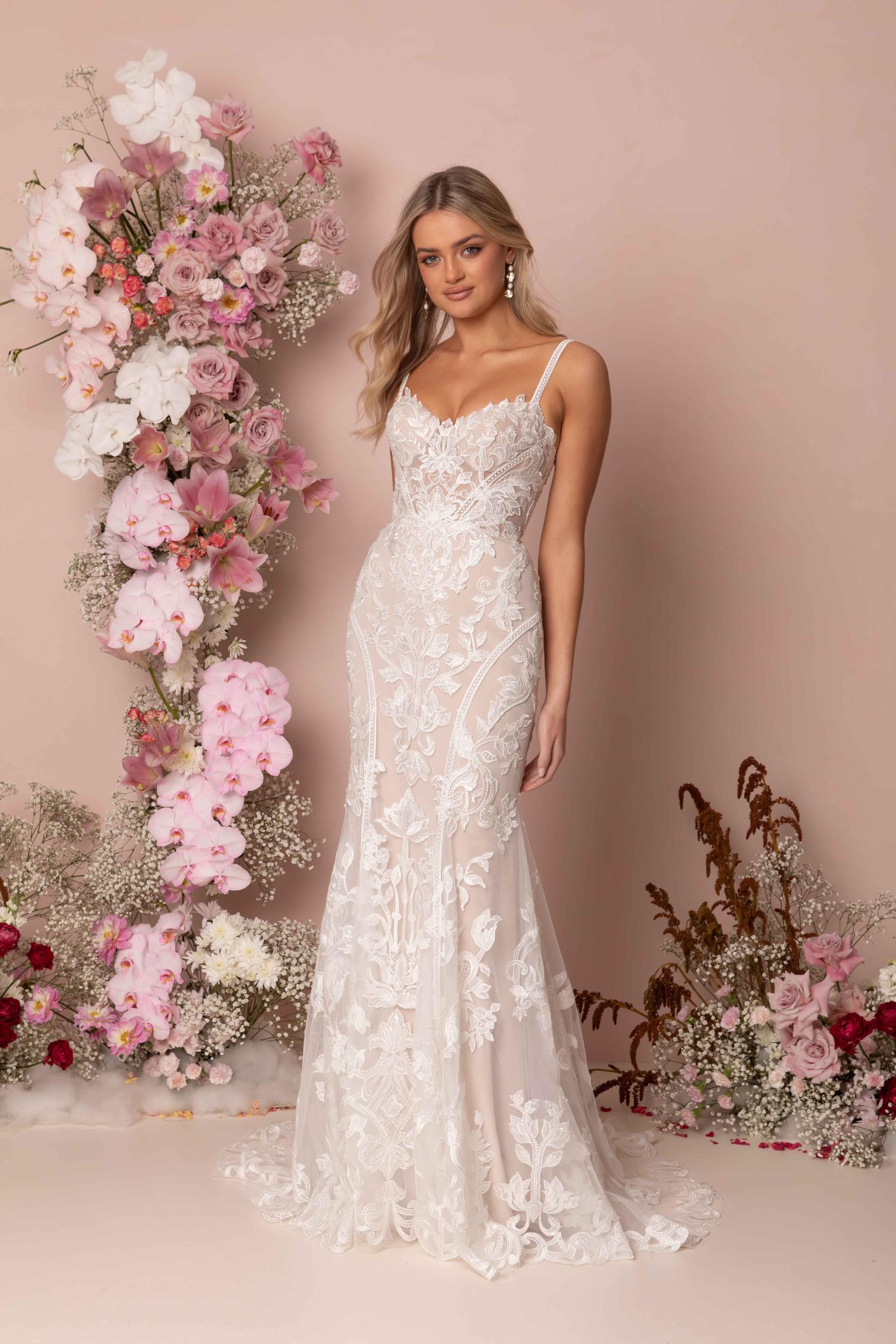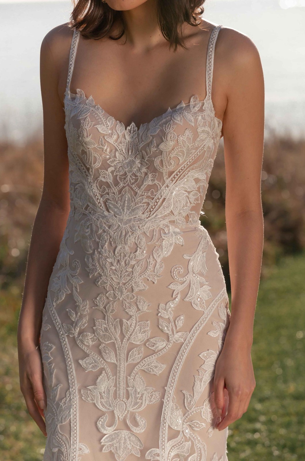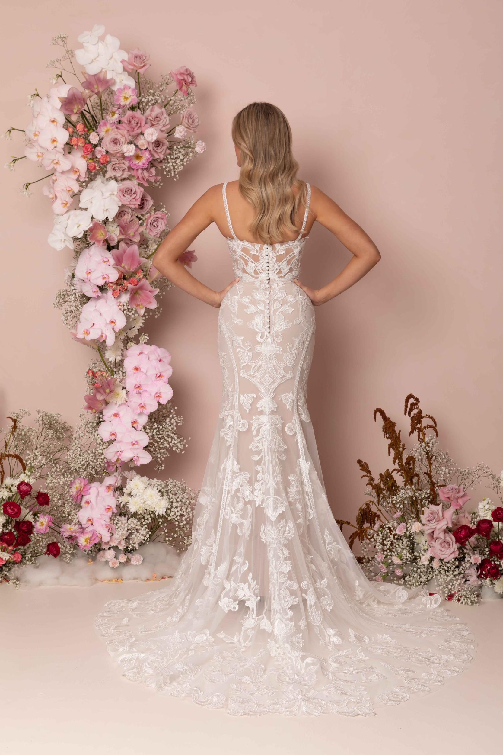 Curve hugging and ever flattering, Krysta is the gown for the unapologetically bold bride. Ornately embroidered lace motif adorned with delicate sequins are intentionally placed to enhance the feminine form. This design is all about shape, with vertical trim embellishments highlighting the waist and hips to create an enhanced hourglass figure. The sweetheart illusion bodice is built with fitted cups and 14-boning for lift and bust support suitable for all sizes. This fit and flare style gown is completed with button detailing down the centre back and a 25” train, perfect for an Italian soiree. For all-day comfort Krysta is lined with stretch jersey.