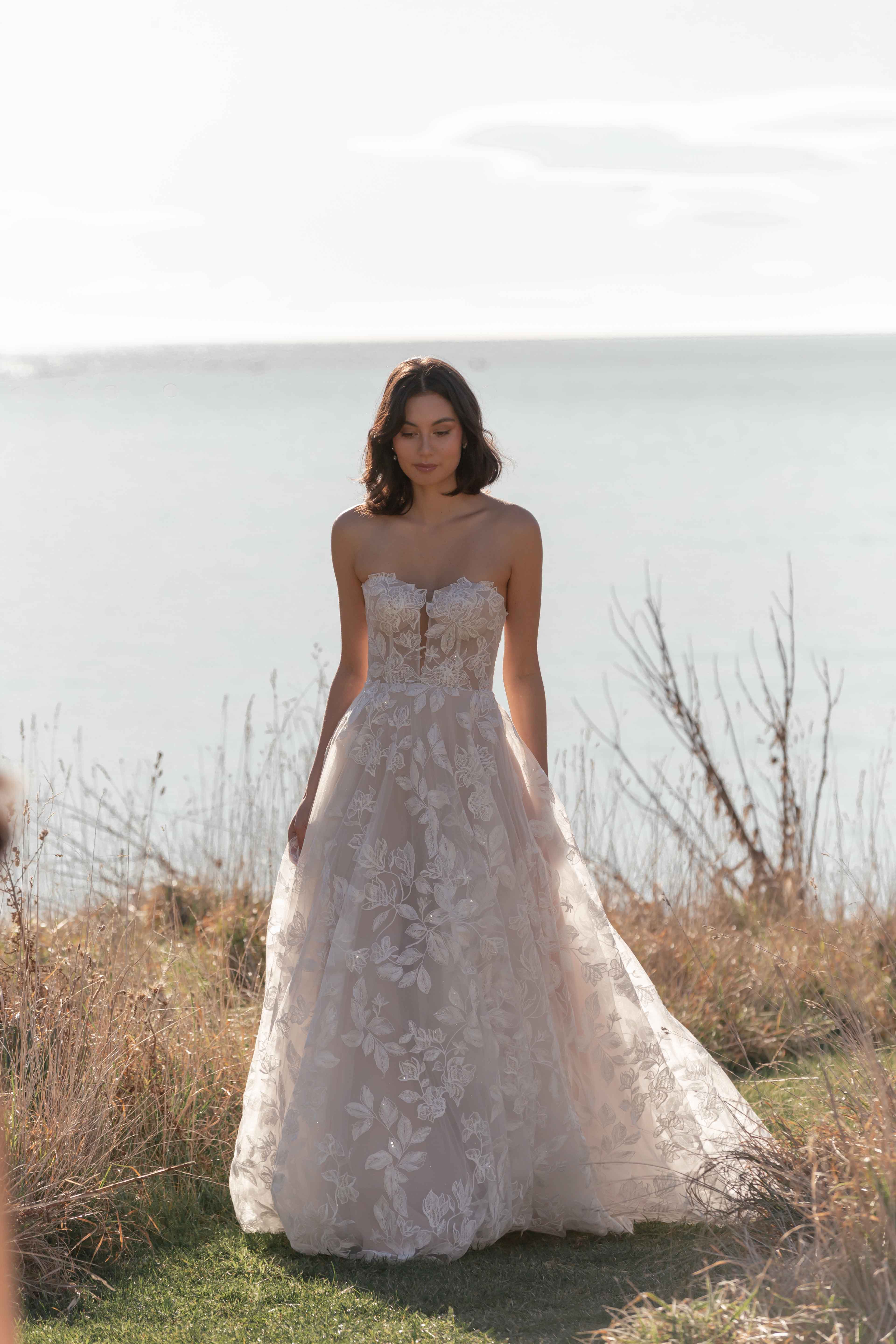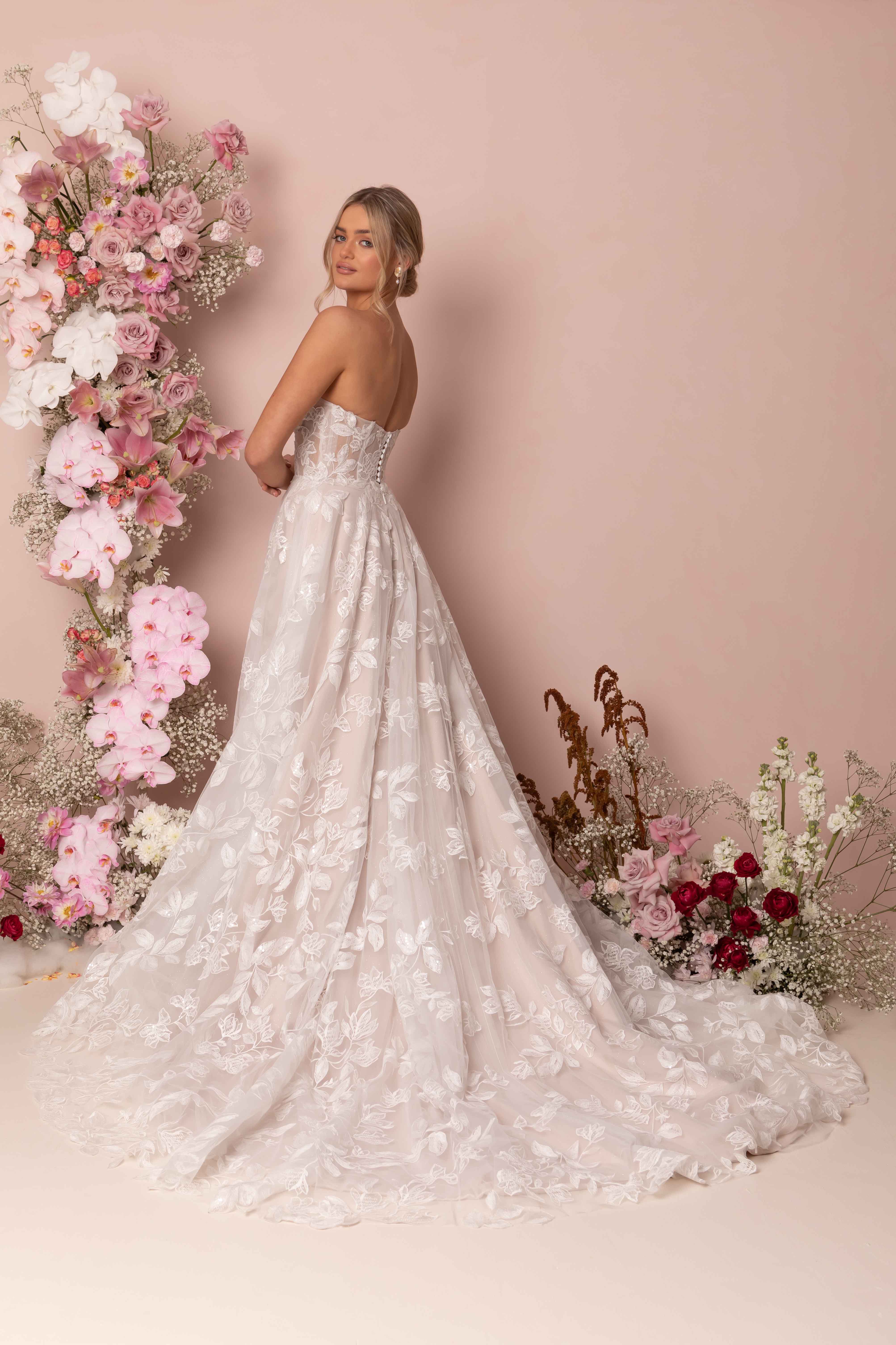 Striking and bold florals are the focal point on the Kyann gown. Her floral sheet lace cascades the length of the gown and the glitter tulle shimmers in the light. Her sweetheart neckline, illusion bodice and buttoned back bodice are hints of subtle elegance. The simple strapless A-line silhouette complements the extravagance created by the all-over floral and sequin detail. The full circle skirt, 30” train and matching veil (sold separately) create another dimension of cohesive grandeur. Feel comfortable and supported all day long with soft stretch charmeuse lining, fitted cups and 14-piece boned bodice.