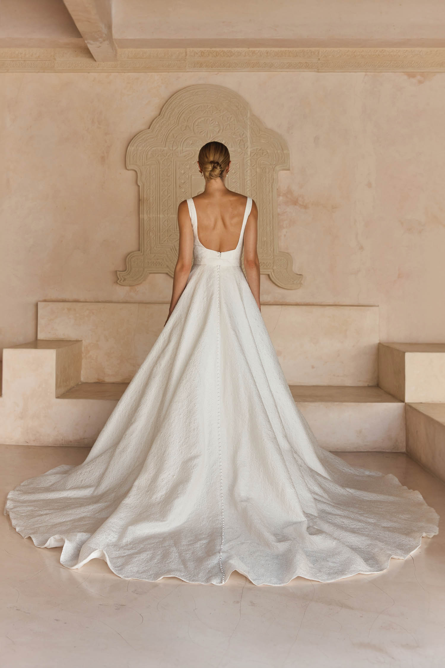 Through the back, we see the same square shape and features centre back buttons running down the centre of the skirt to her hem.