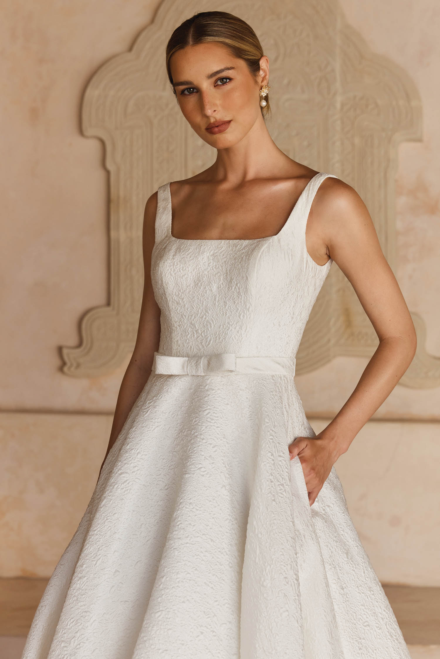 Her light as air A-line skirt features princess seams and handy side seam pockets which we know all brides love.
