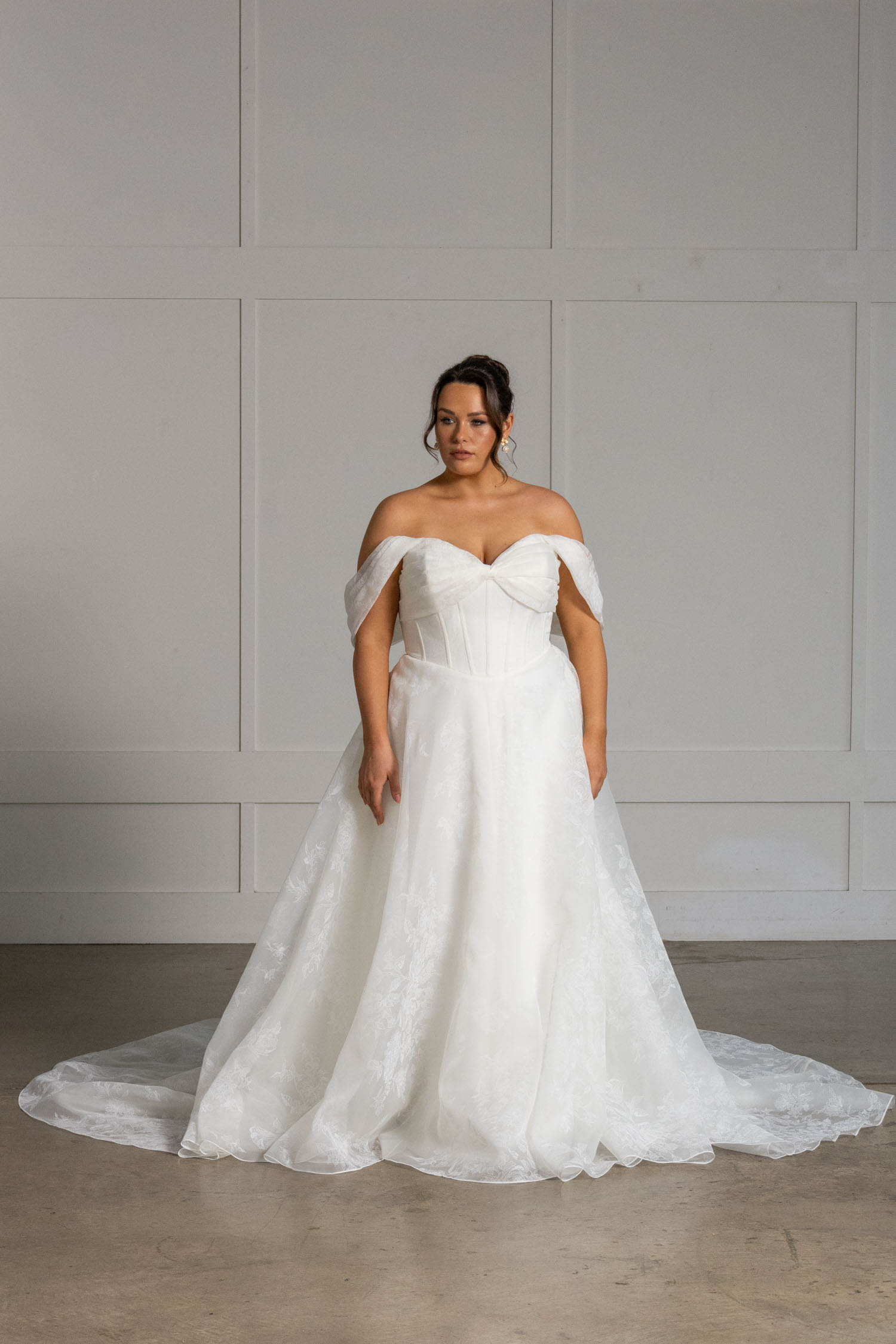 She has impeccable support and fit with our signature boned construction and added internal band to take the weight of the gown, staying firmly in place for all-day snug comfort.