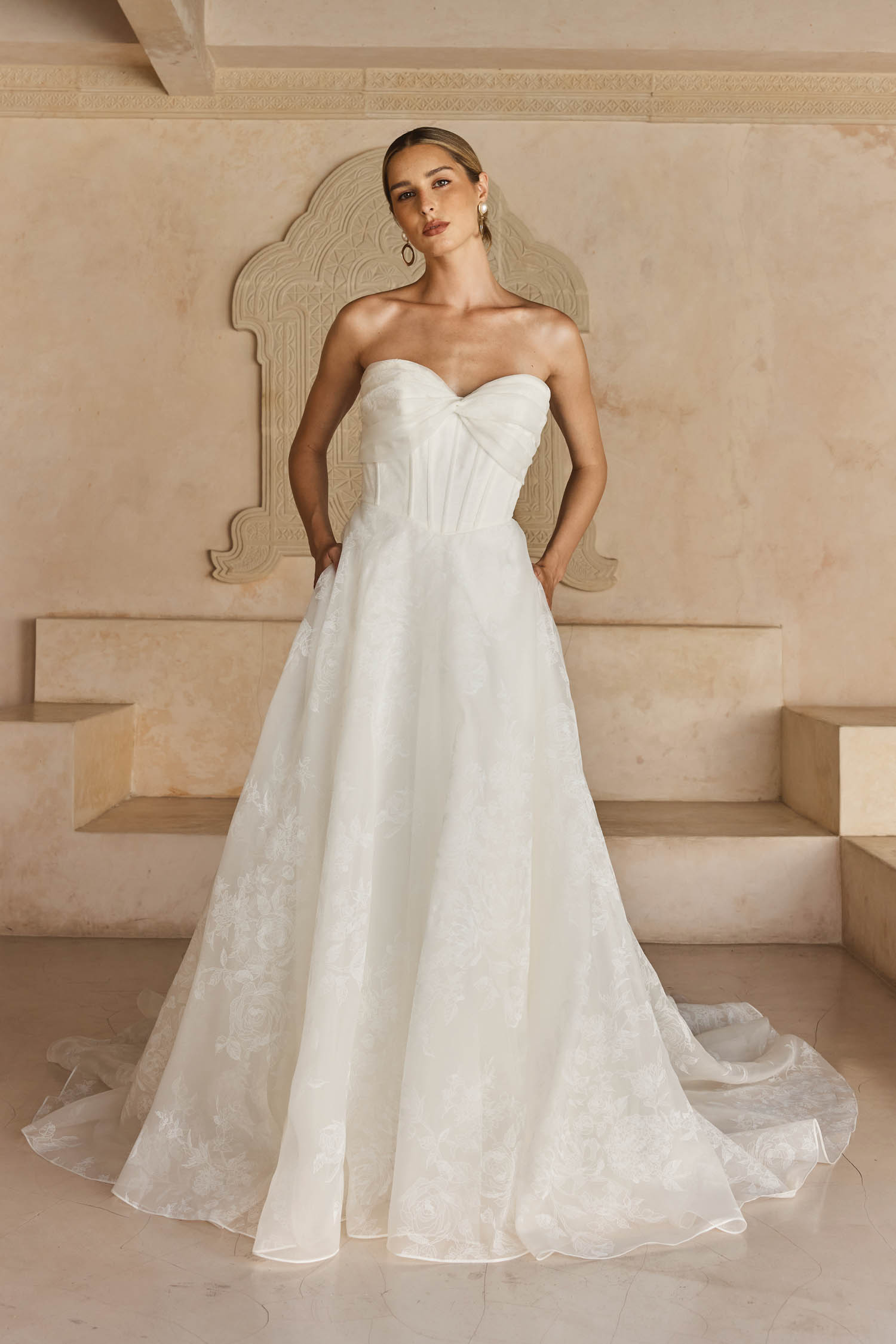 Perfect for our brides wanting a clean, chic look with a modern romantic twist. Her strapless, sweetheart bodice features a flattering twisted bustline and exposed corset boning.