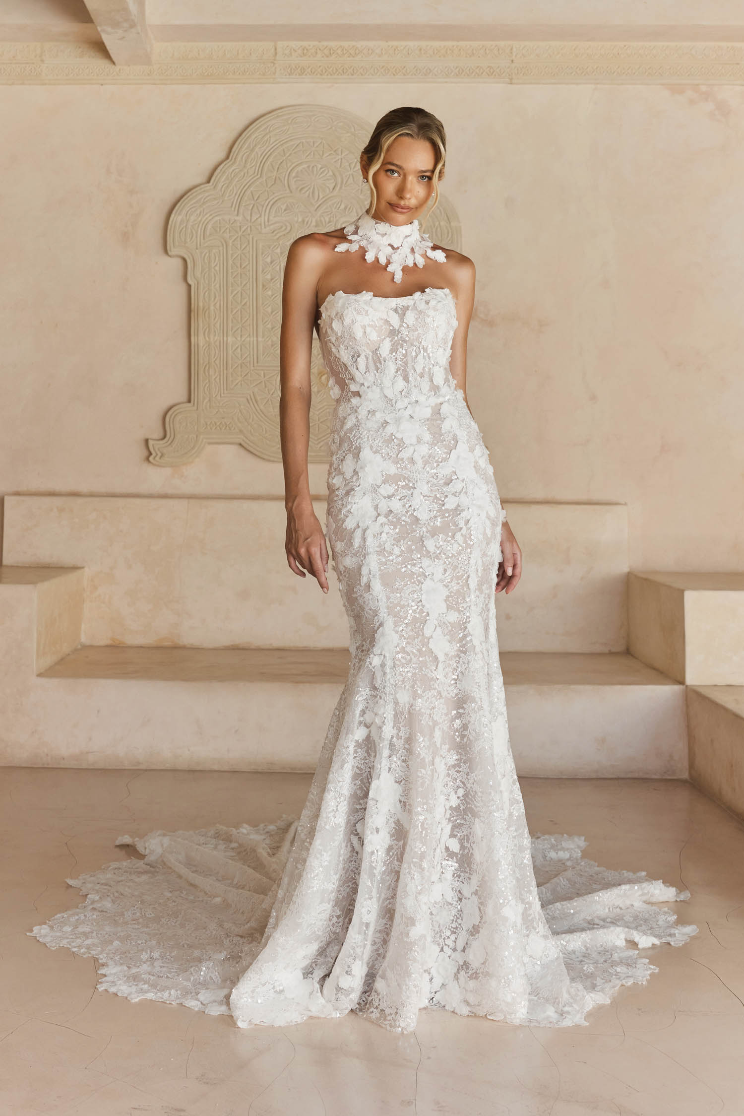 or some figure-hugging glam we have our Leith wedding dress in either all-over lace, or a crepe option