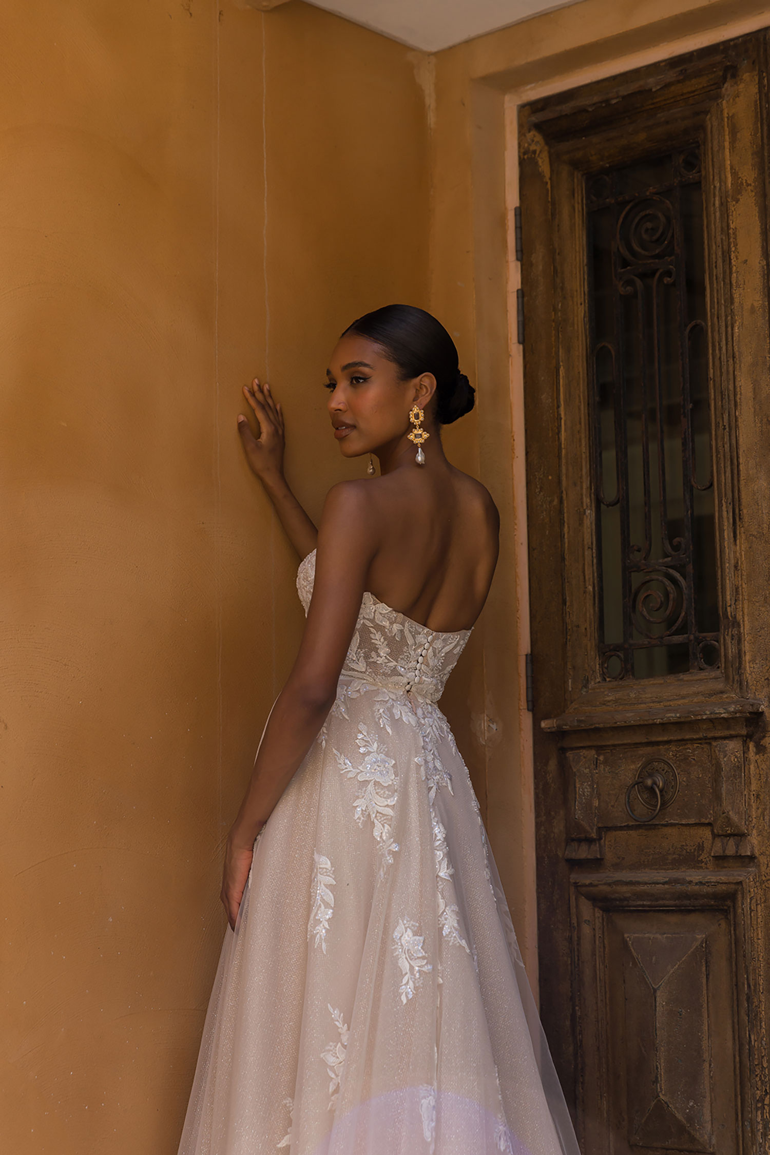 Inspired by late night adventures on Tuscan streets, Pandora is the wedding dress for the bride looking for princess-style grace and elegance. She features a strapless illusion bodice and a full-circle skirt finishing with a grand illusion train. It’s all about her statement details with motif lace along her bodice and skirt, adorned with sequins and beads for extra sparkle. Comfort comes easy with a charmeuse lining and boning for added support and definition.