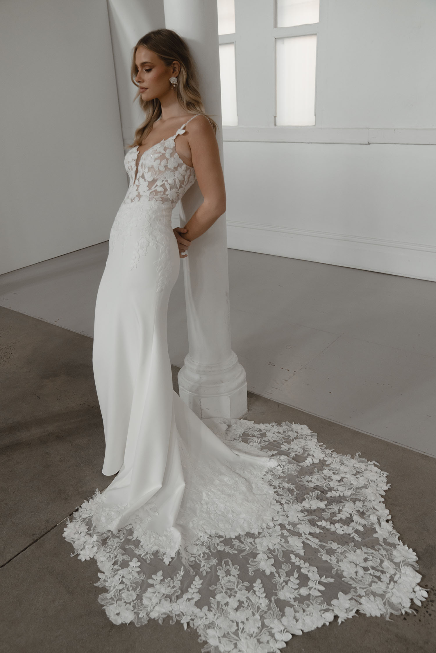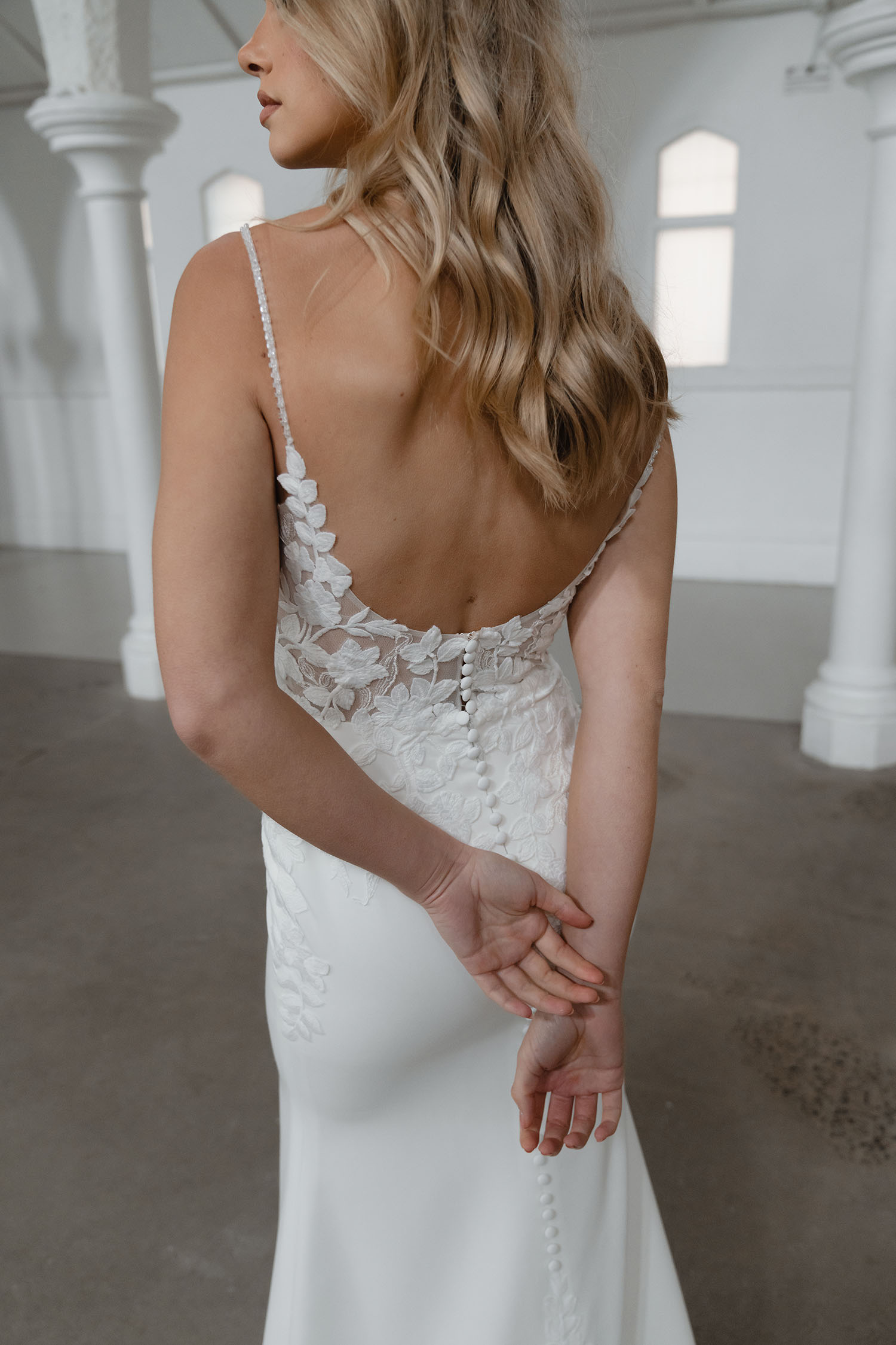 Presenting Samson, the epitome of modern minimalist elegance. As a cornerstone of this season’s ‘Epilogue’ collection, Samson speaks to the contemporary bride who seeks the essence of understated beauty. Her lace illusion bodice, resplendent with intricate floral details, leads to a captivating deep plunge V neckline and delicate thin straps. The fit and flare silhouette gracefully embraces the bride’s form, while the dramatic lace cutout train adds a touch of flair. With a low scoop back and centre back buttons cascading from top to train, Samson is a harmonious blend of tradition and contemporary allure, a true masterpiece for the modern minimalist bride.