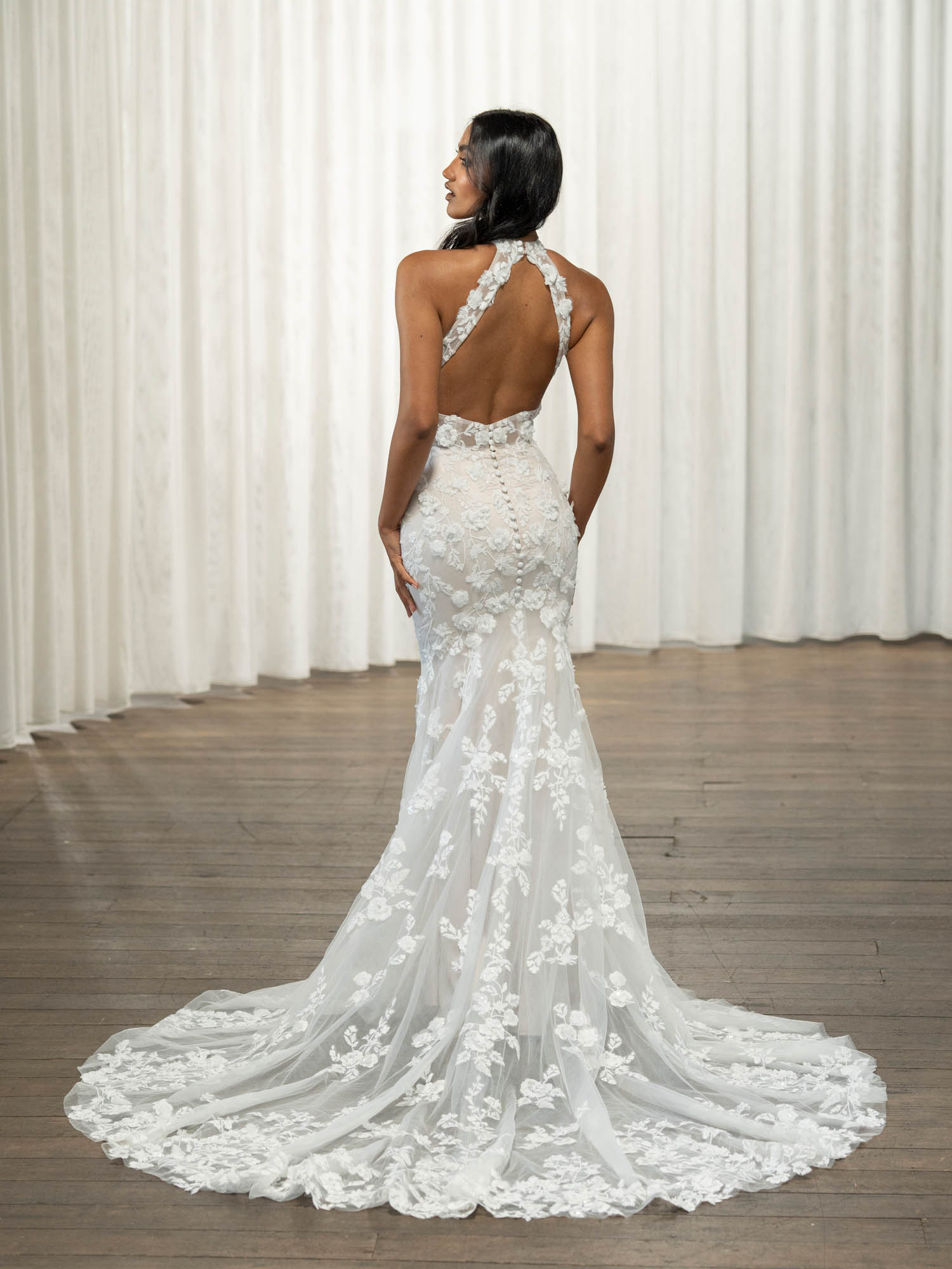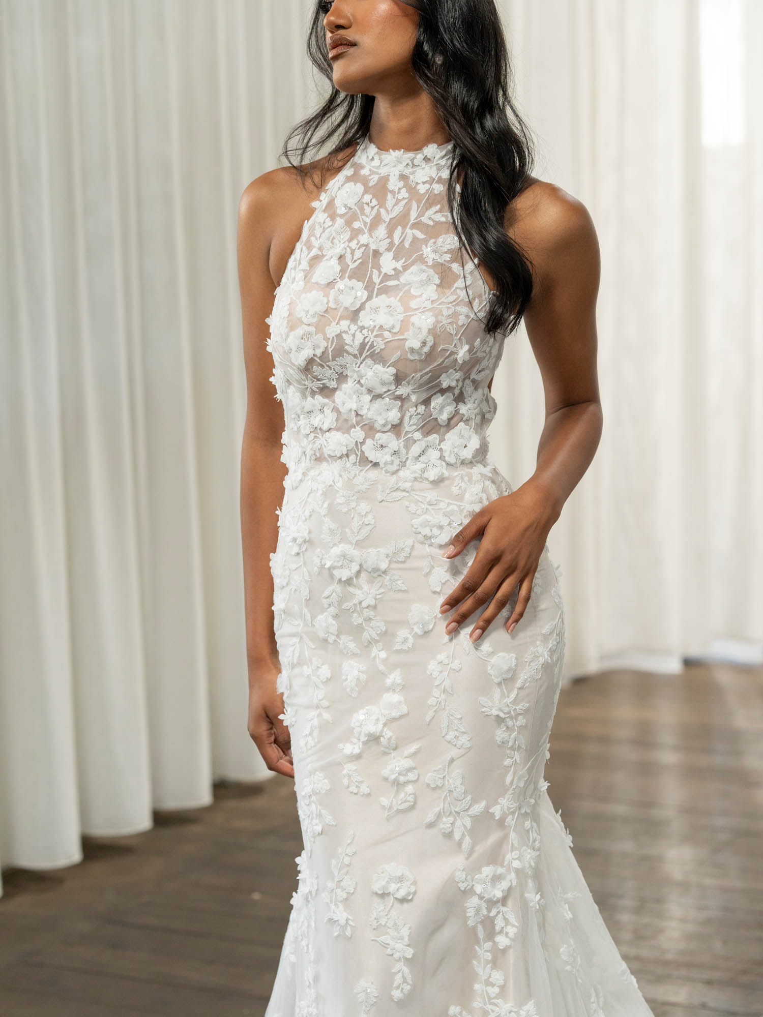 Modern and supremely flattering is our Tabitha gown from our Madi Lane Ceres collection. Her high necklace-style design is sought after and on trend in fashion circles. The fit and flare silhouette has a demure, yet shapely quality, adorned with delicate 3D floral inspired motifs. Her high neckline and upper bodice perfectly fits the feminine form supported with boning construction in her illusion bodice. The embroidered sequined lace motifs are placed heavily on the bodice for coverage in a linear and shaping fashion down the skirt to accentuate the curves and create an effortless sexy mermaid silhouette. You’ll love her deep open back with illusion lace straps that add contrast to the high neckline. Centre back buttons line the skirt vertically as a finishing touch. Feel fabulous in this striking wedding dress, with show-off shoulders and a unique contemporary design