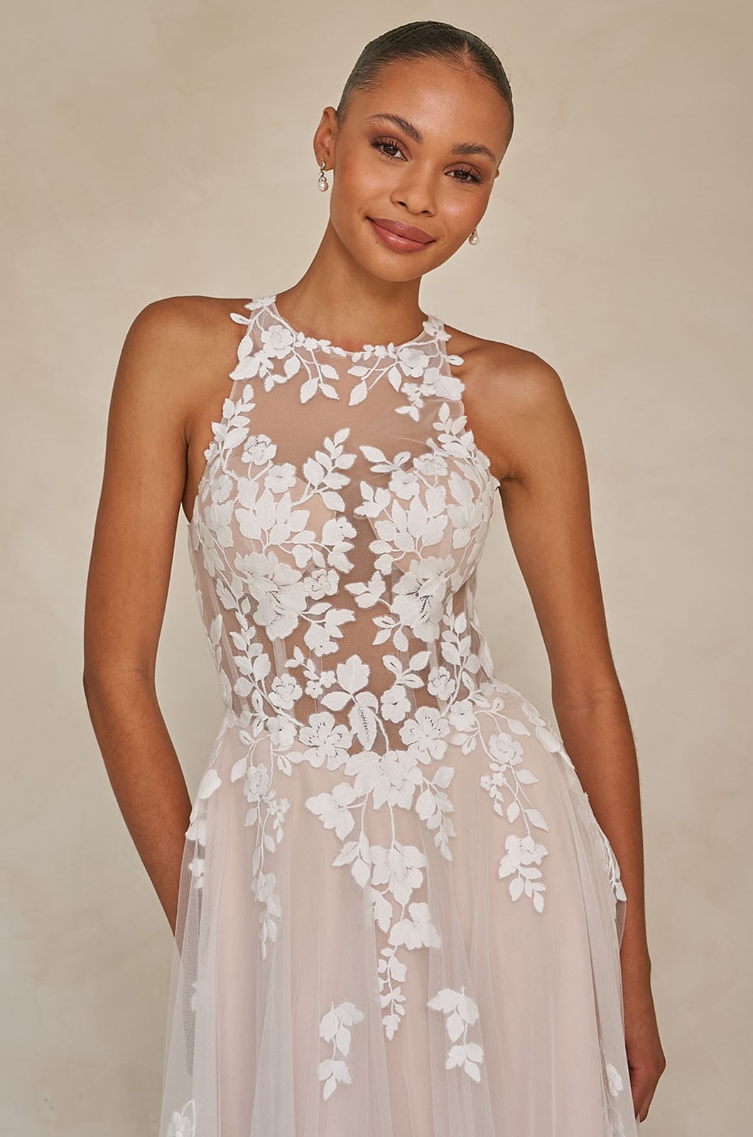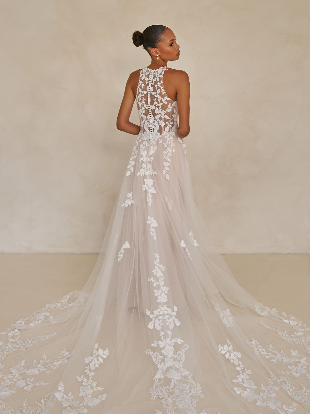 Layers of embroidered tulle cascade into an A-line skirt, its gentle movement accentuated by strategically placed floral motifs. Both flattering the figure and evoking the feeling of windswept springtime gardens.