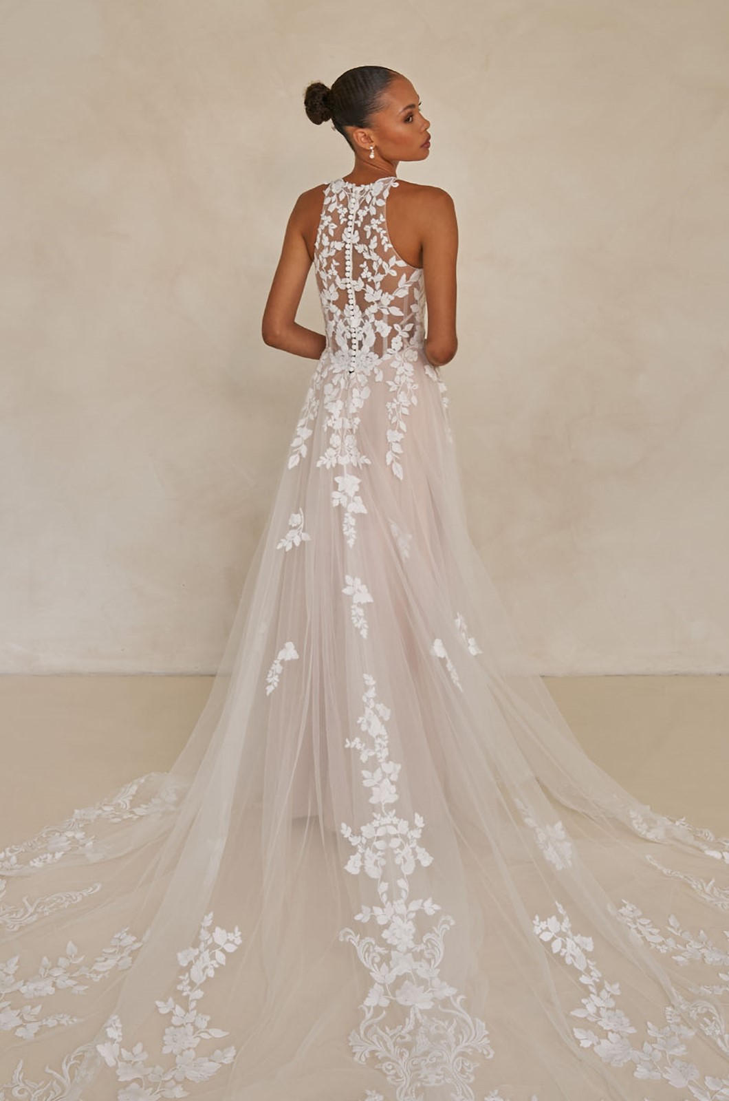 A modest high neckline lends an air of timeless poise, while a sheer illusion bodice brings a contemporary edge. Balancing tradition with a whisper of whimsical.