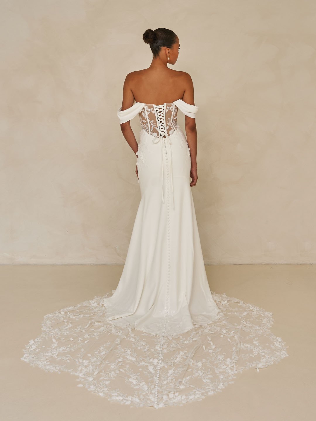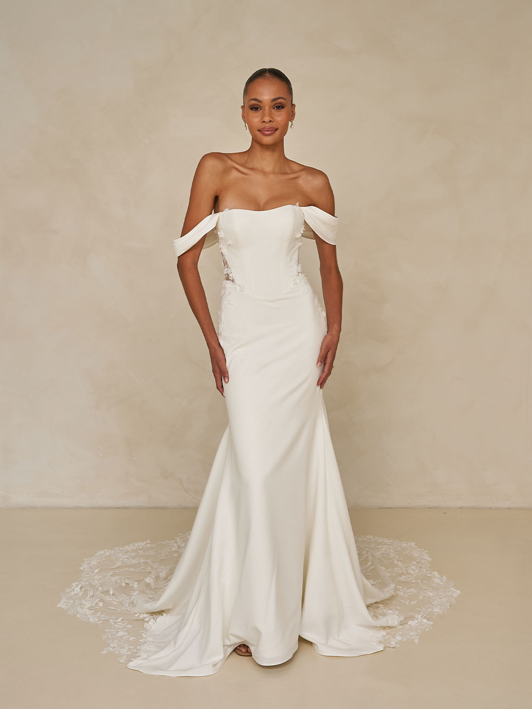 The Watson wedding gown embodies timeless sophistication with its clean, architectural silhouette and delicate romantic accents.