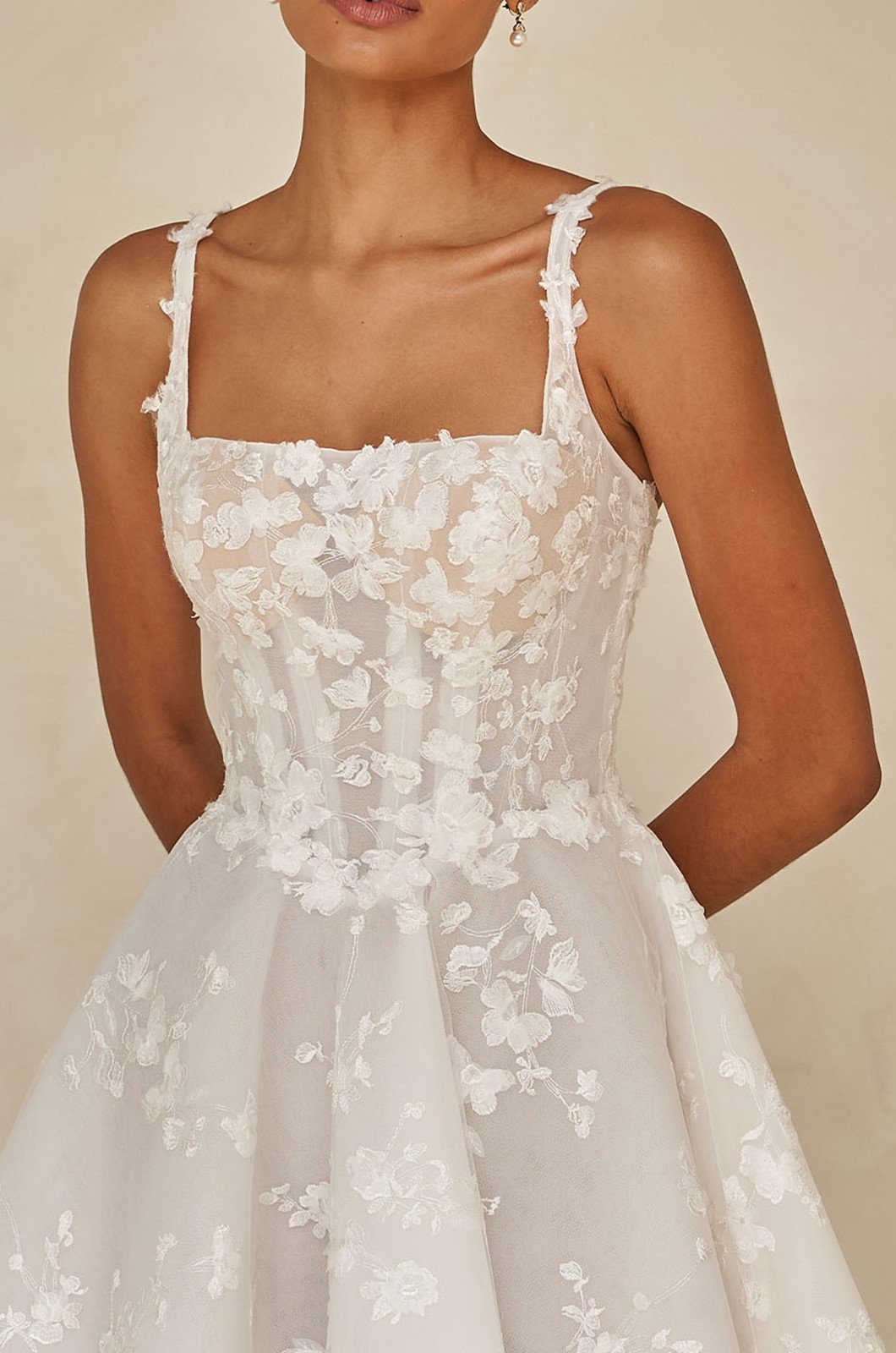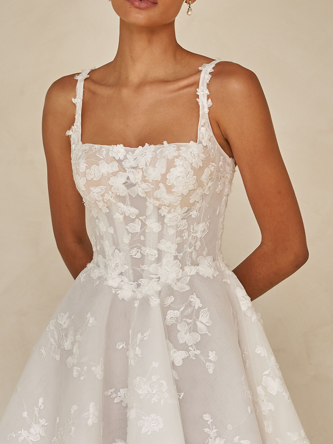 This flirty lace mini dress features a modern square neckline, sculpted Basque waist, and delicate 3D floral motifs.