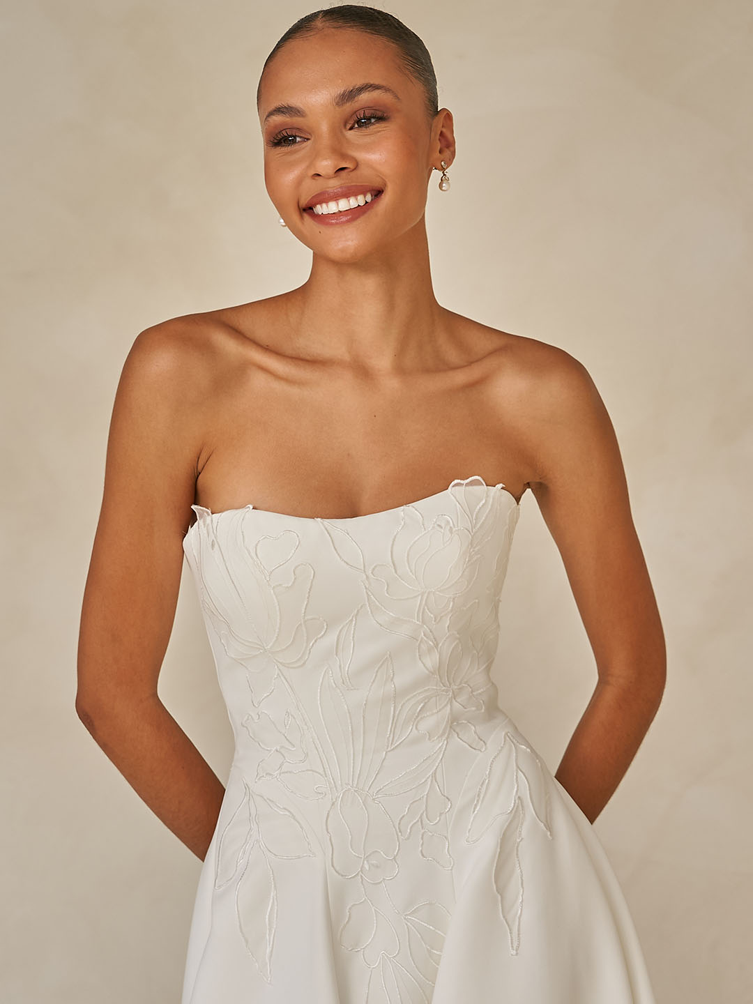 The strapless neckline adds a fresh, feminine touch, perfectly complemented by the detachable tulle neck scarf. A delicate detail that elevates the look while preserving its understated sophistication.