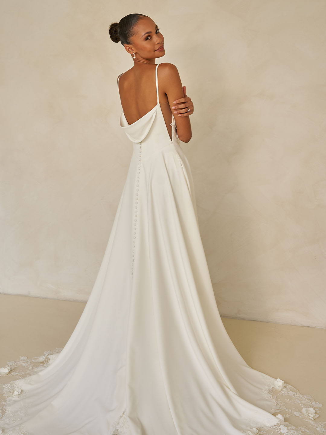 From the waist, the skirt flows like liquid silk, pooling into a breathtaking illusion lace train where the 3D florals reappear. To create harmony from bodice to hem. At the back, a low scoop gives way to a detachable cowl. Offering a romantic, statement finish while preserving the wedding gown’s clean sophistication.