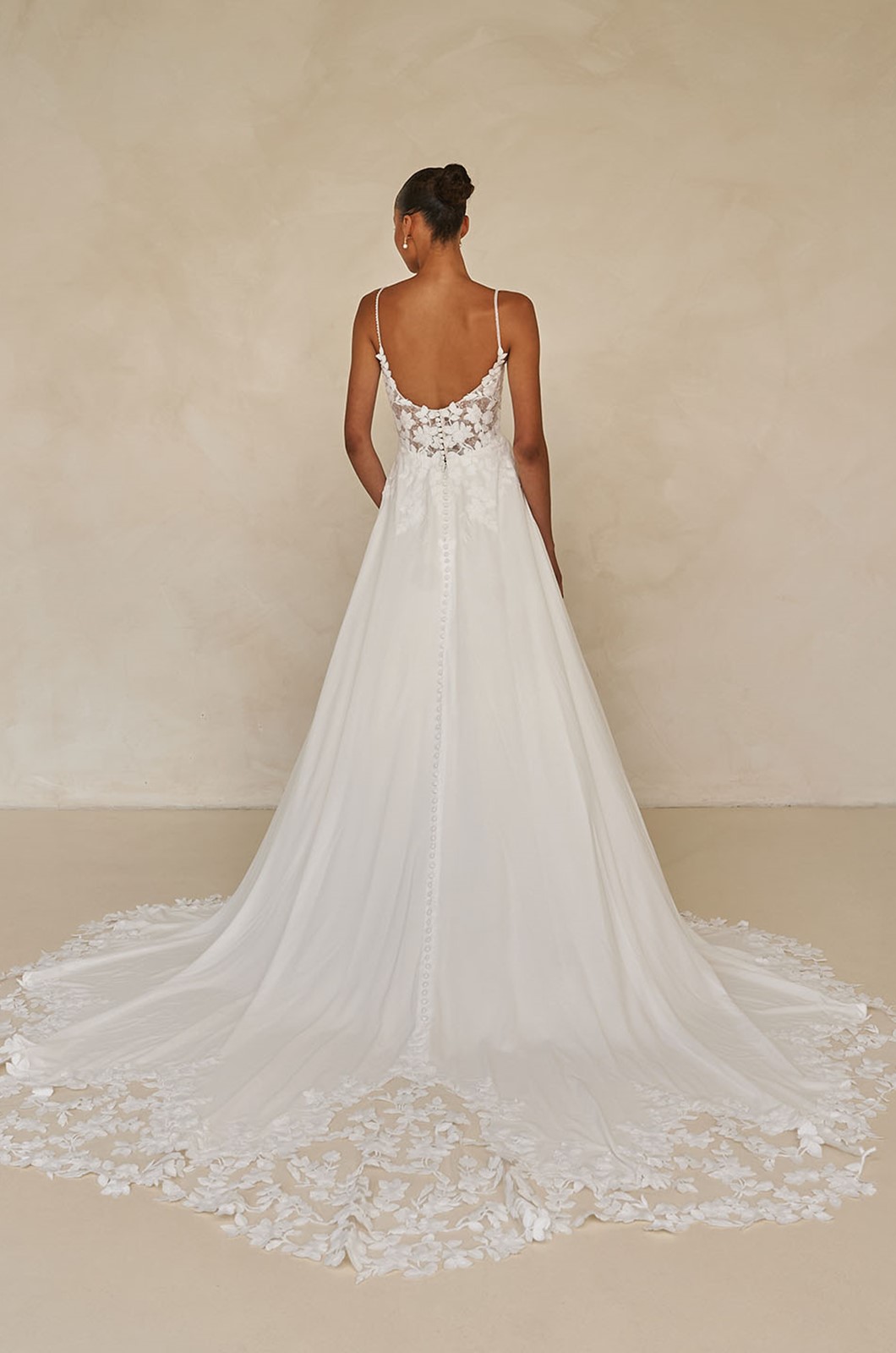 Lace motifs drift gently across the bodice and cascade over the waistline. Meeting a row of covered buttons and a shaped lace illusion train that trails behind like a whisper.