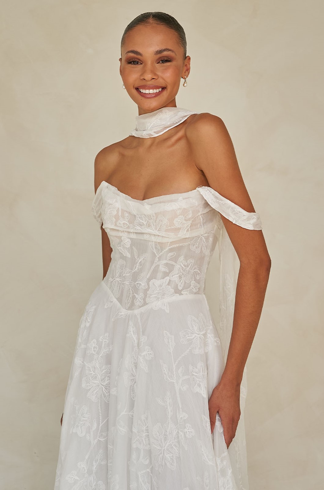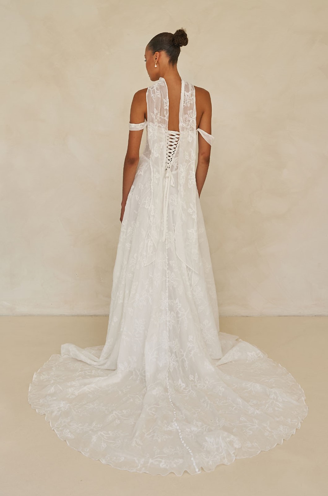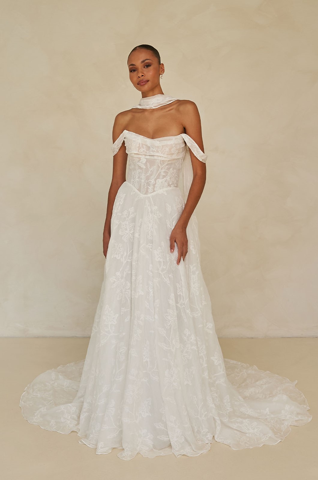 Wilder comes complete with a matching neck scarf—an effortlessly chic accessory that elevates the entire look. This delicate addition adds a touch of refined sophistication and ties the romantic, modern aesthetic together with quiet elegance. It’s the perfect finishing detail for the bride who appreciates subtle, unforgettable style.