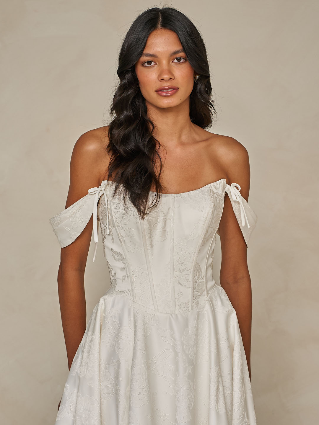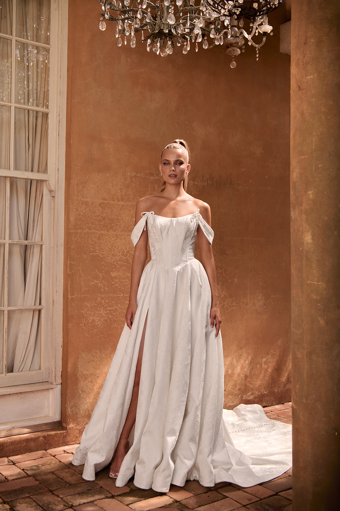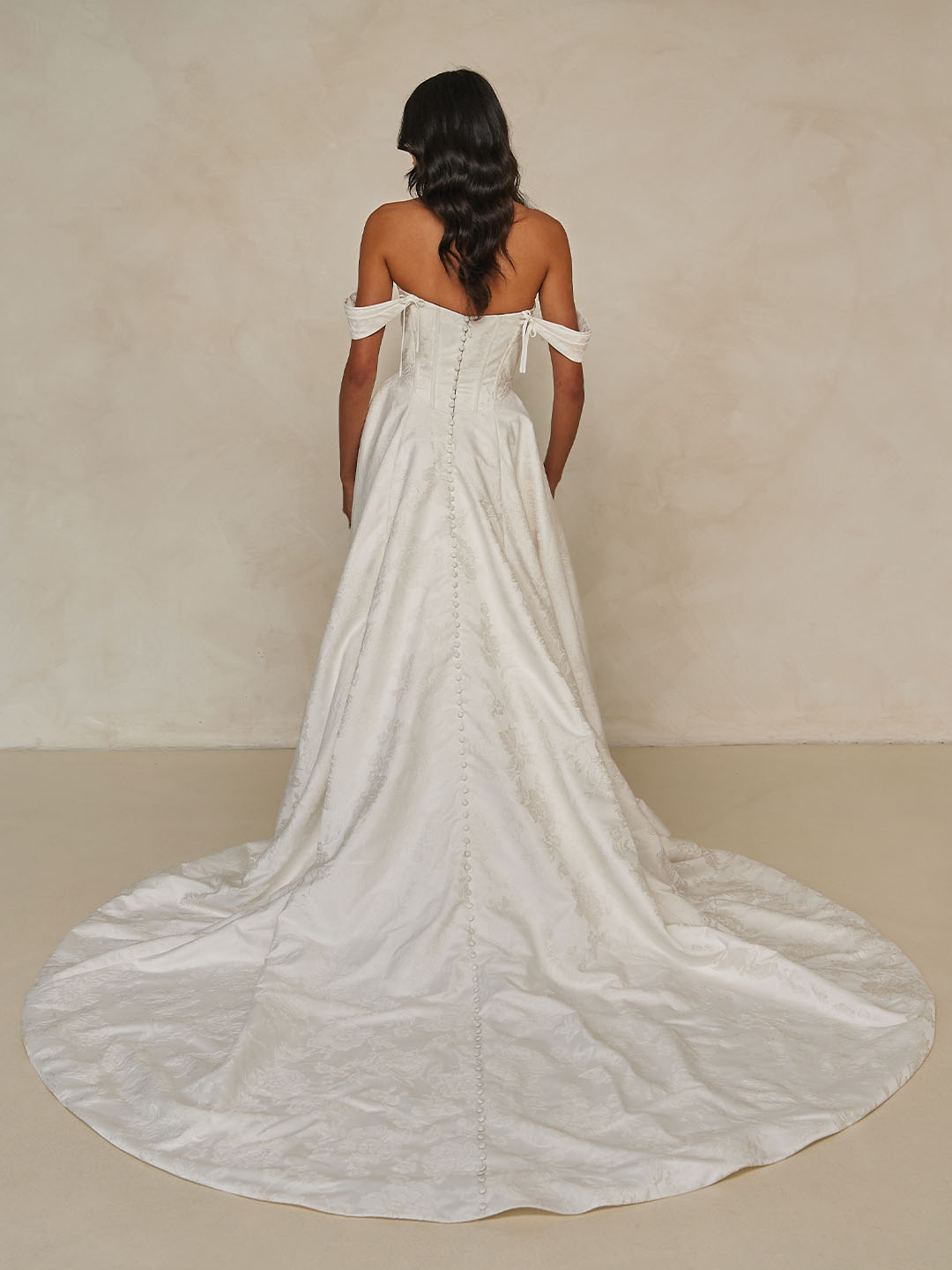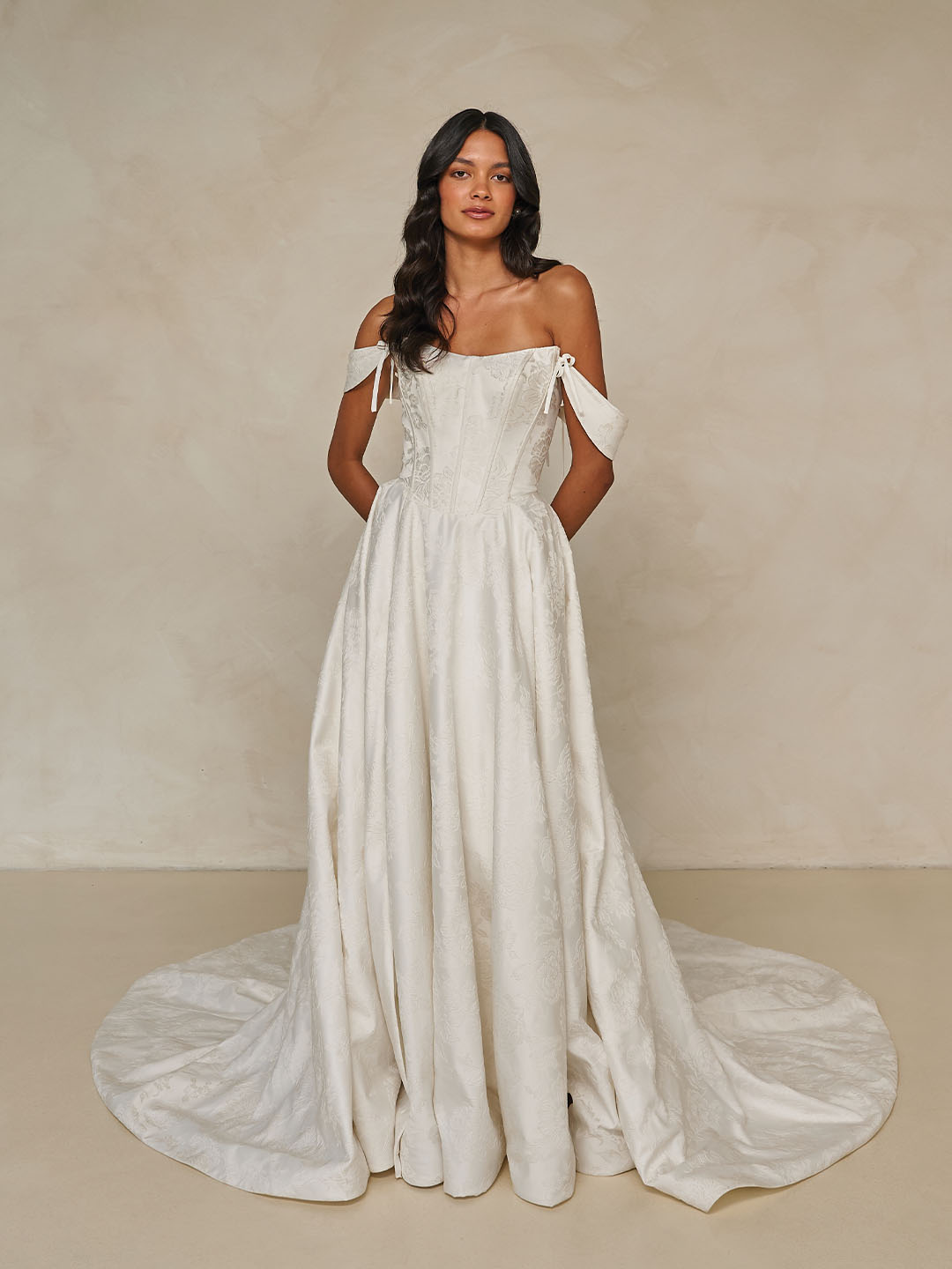 Composed of luxurious floral jacquard, the Wilson wedding dress is a homage to classic romance with contemporary vision.