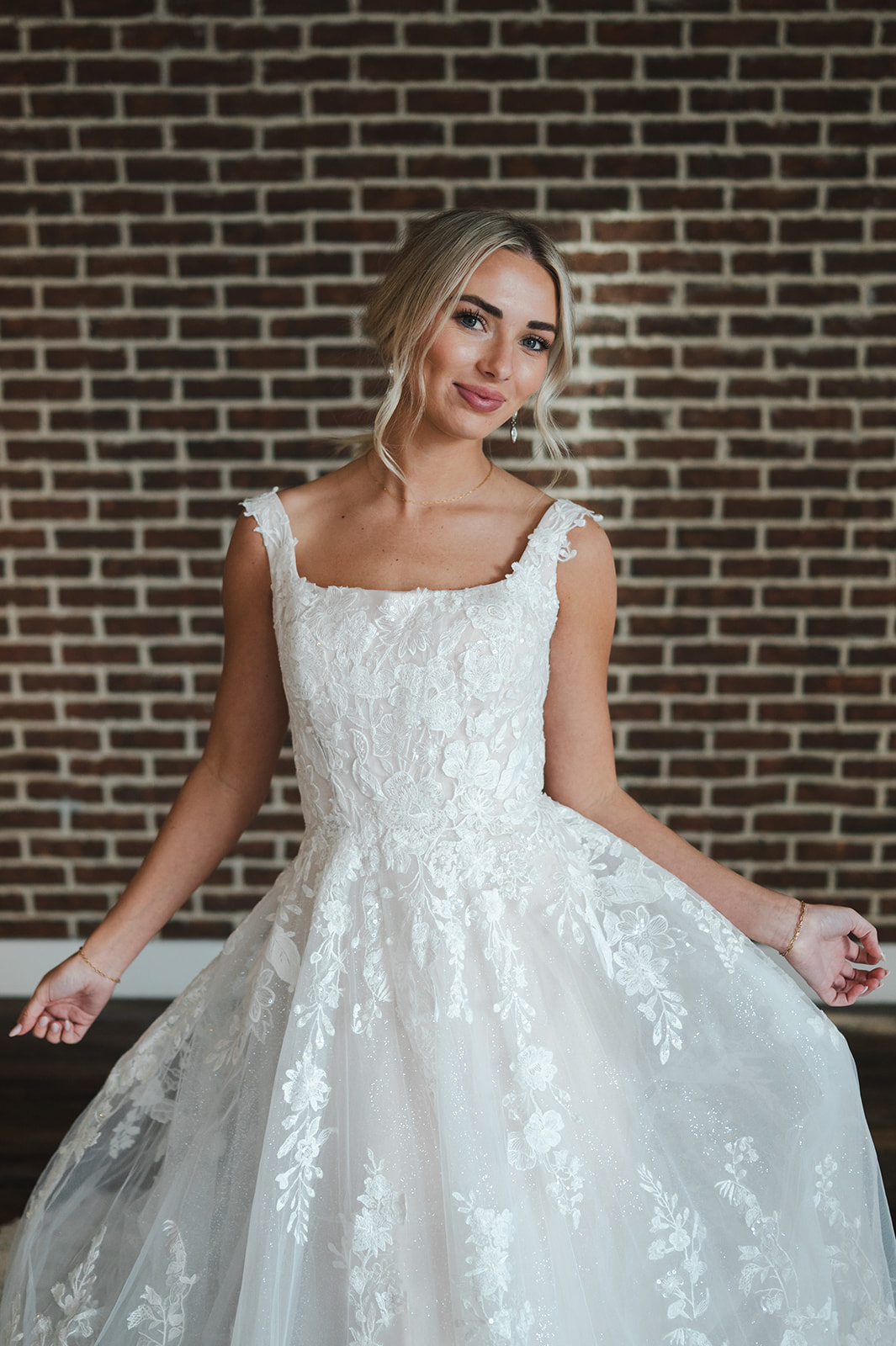 Beautiful lace blooms across the Bella gown. With a glitter tulle layer to add subtle sparkle, and a square neckline, this gown is timelessly romantic.