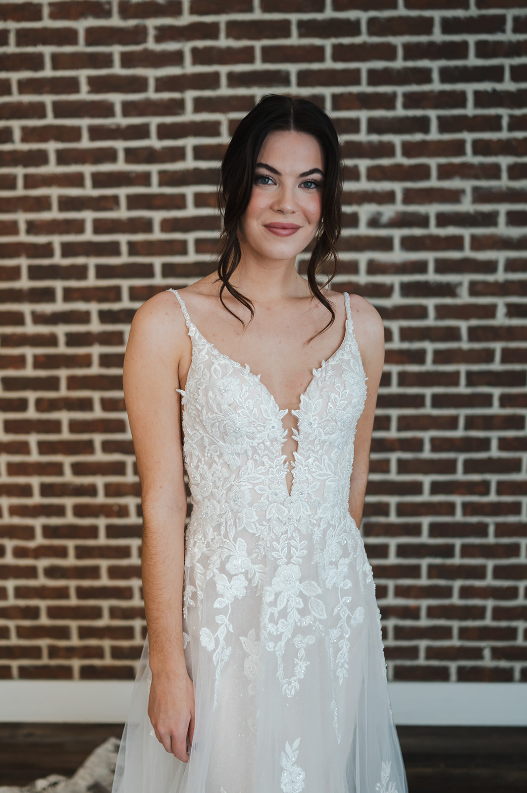 With a fitted lining and a-line tulle skirt, you get the best of both looks in the Carter gown! Beaded appliques waterfall down and accent the stunning train.