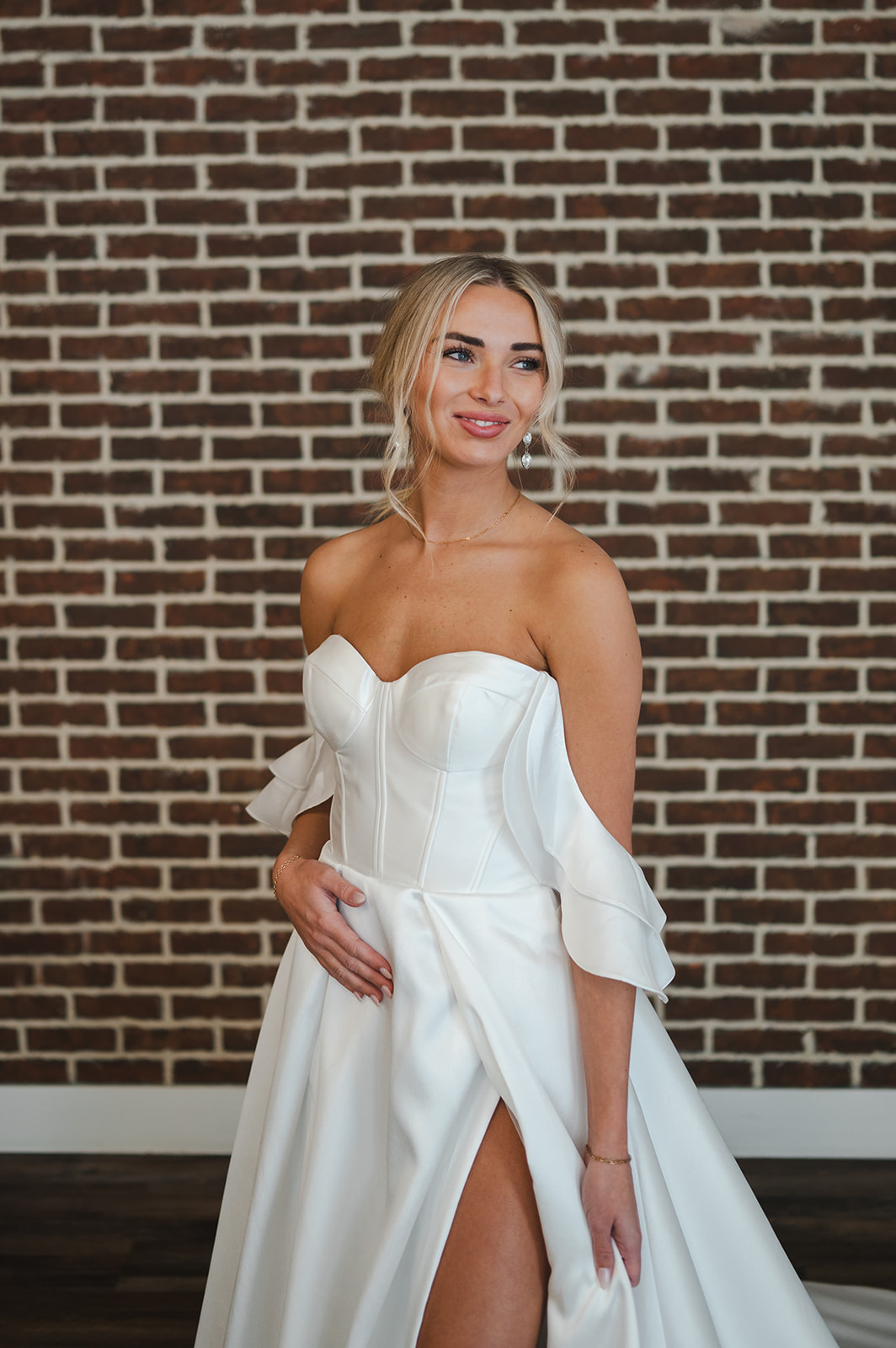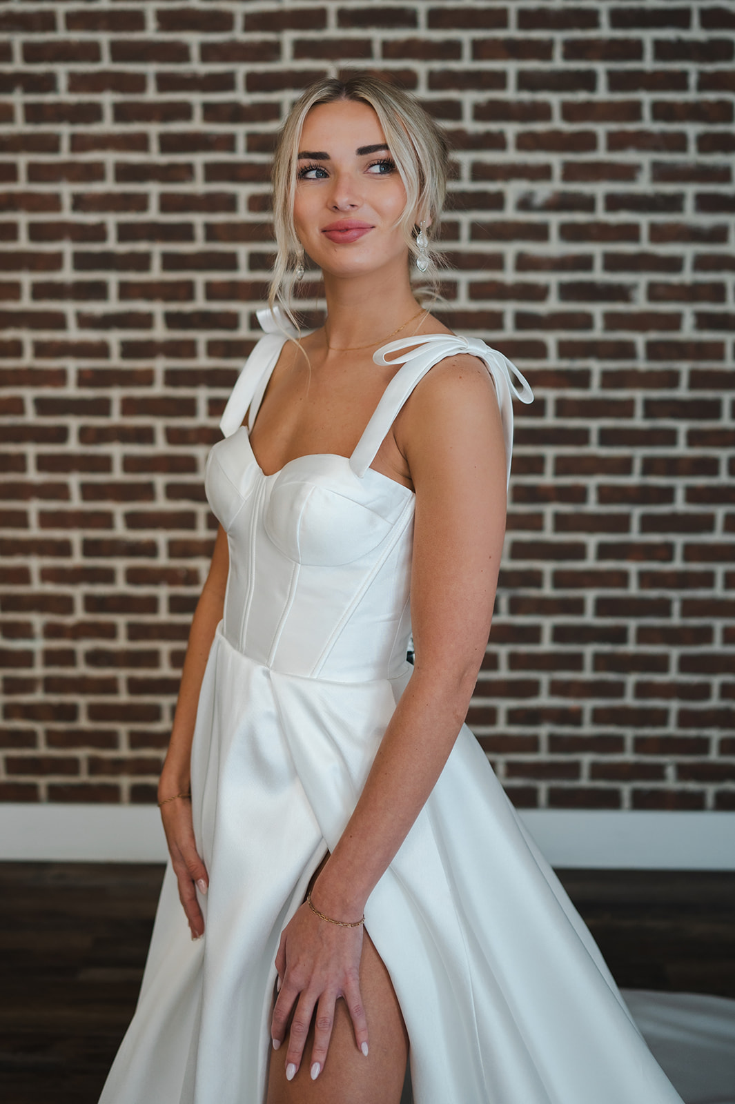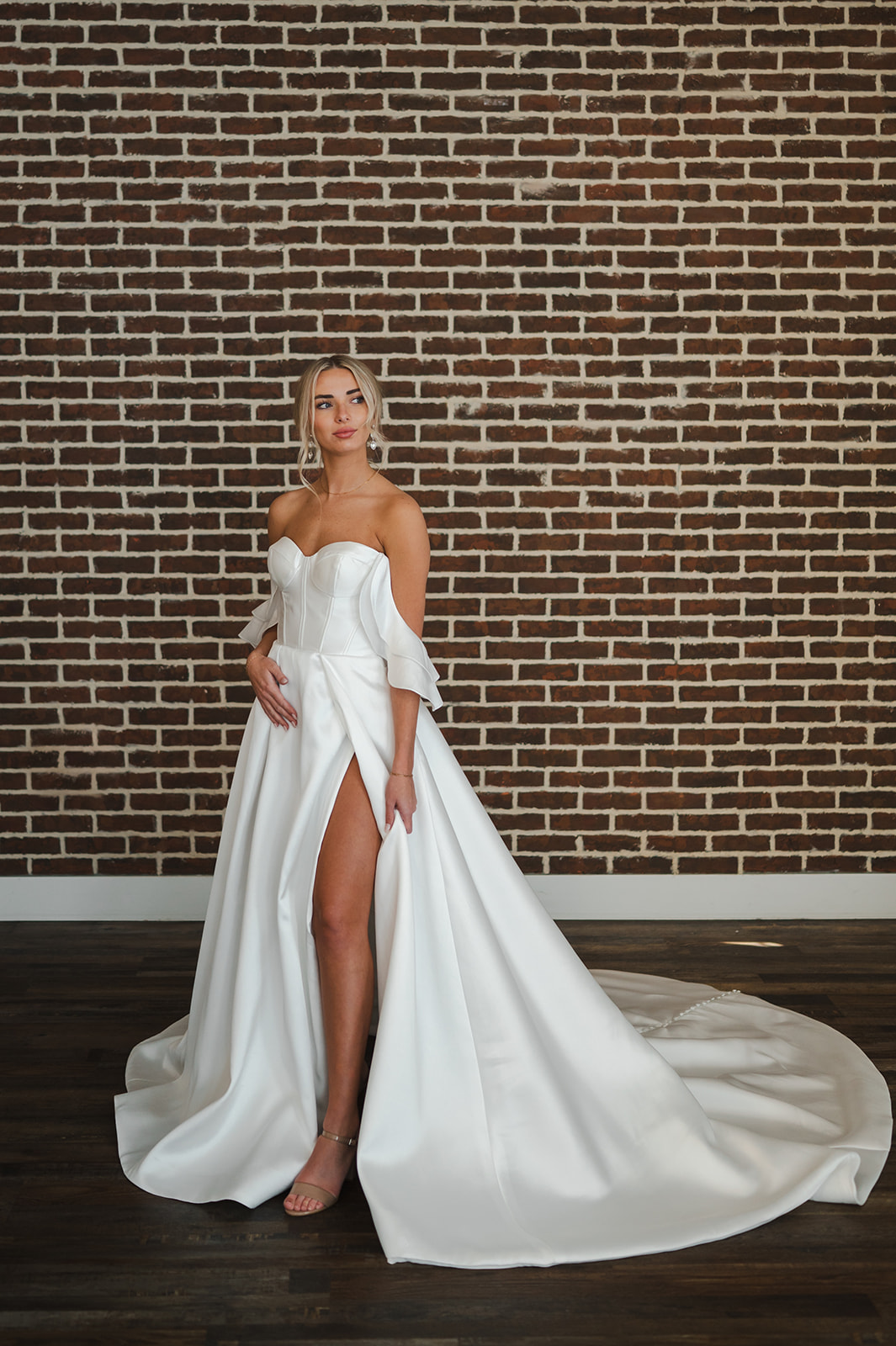Check out the details on the Ella gown! Crafted in a structured Mikado satin and completed with boning details and a high slit. Detachable straps give you the freedom to choose between bow straps, off-the-shoulder, or strapless.
