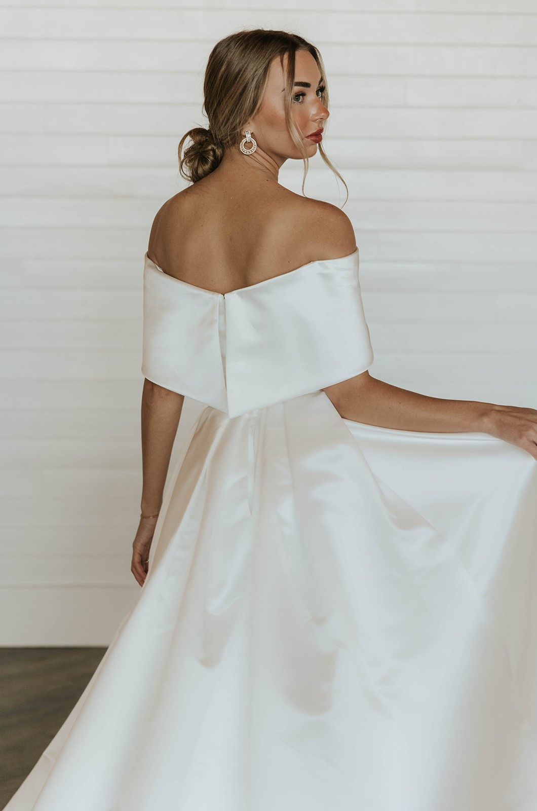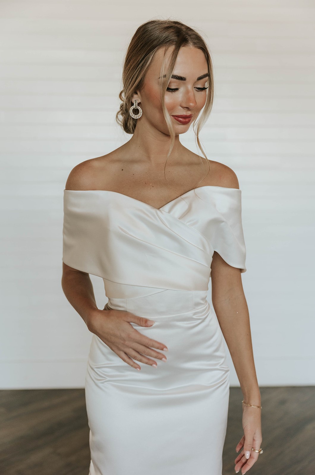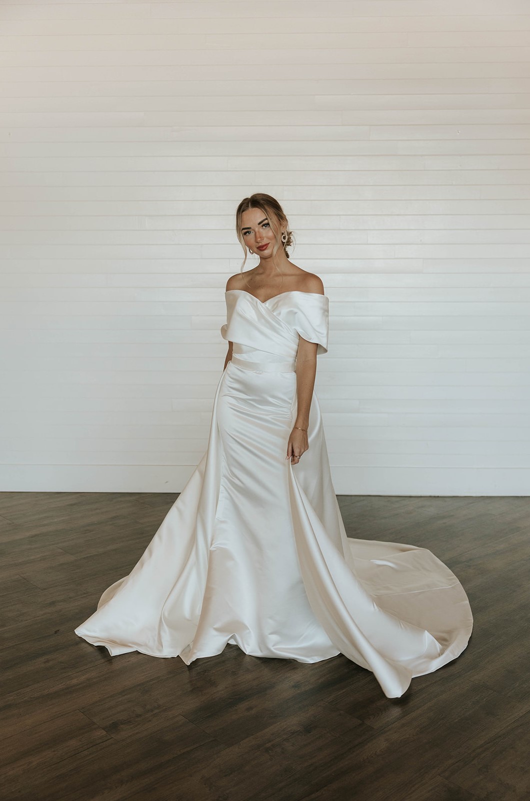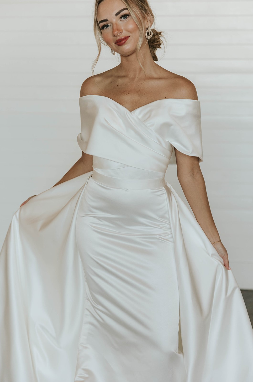 Our Eva gown features a lowered shoulder with decorated wrap. Made in a luxurious sating the detachable overskirt provides versatility to the sheath dress.