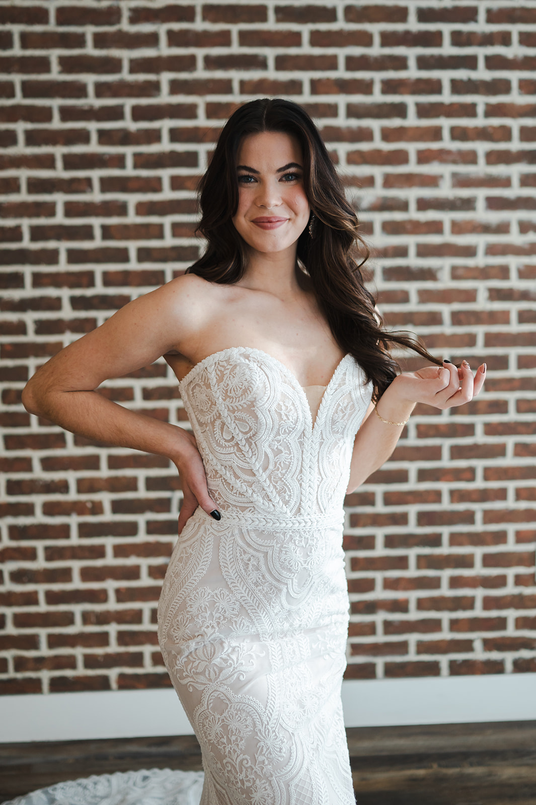 Boho brides, meet the Inez gown. Bold sheet lace adds the perfect amount of texture, with subtly beaded accents and hem lace edging around the train.