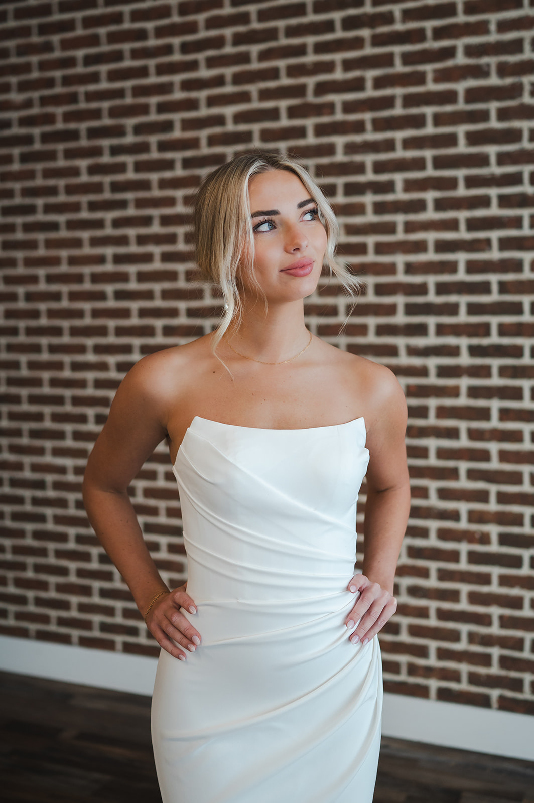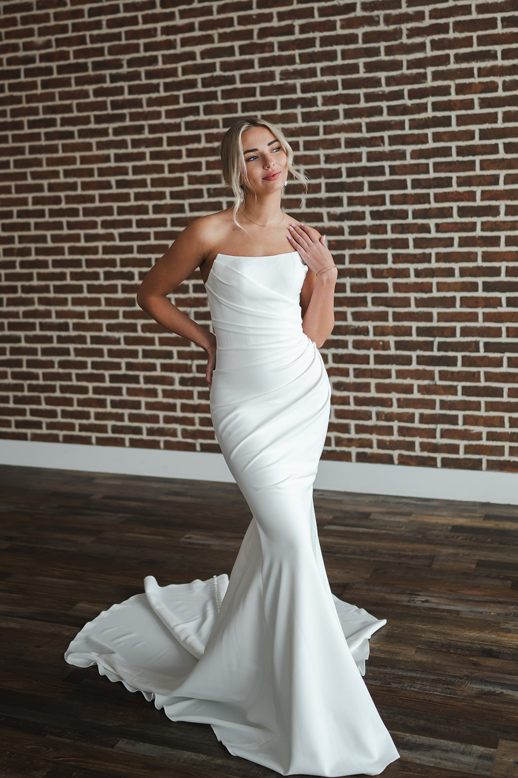 Modern styling meets timeless elegance in the James gown. Dramatic rouching adds a sculpted effect, finished with buttons down to the end of the train.