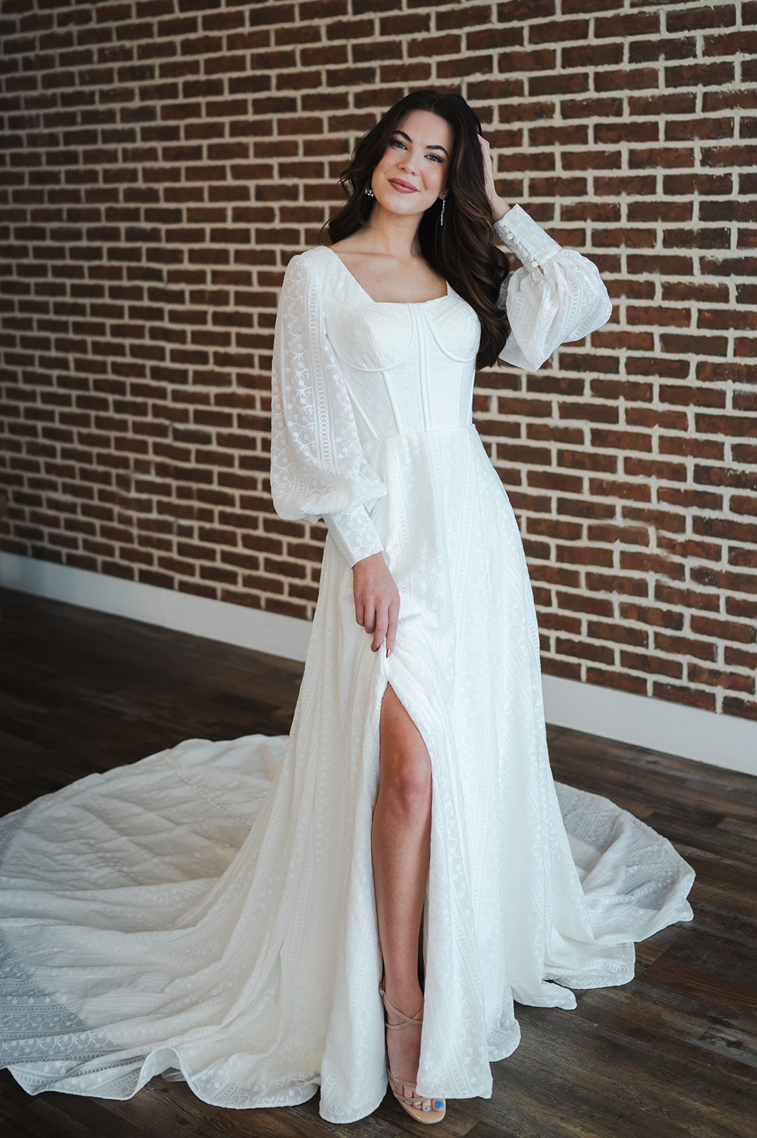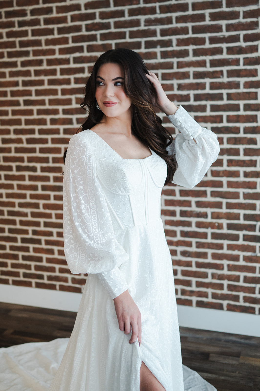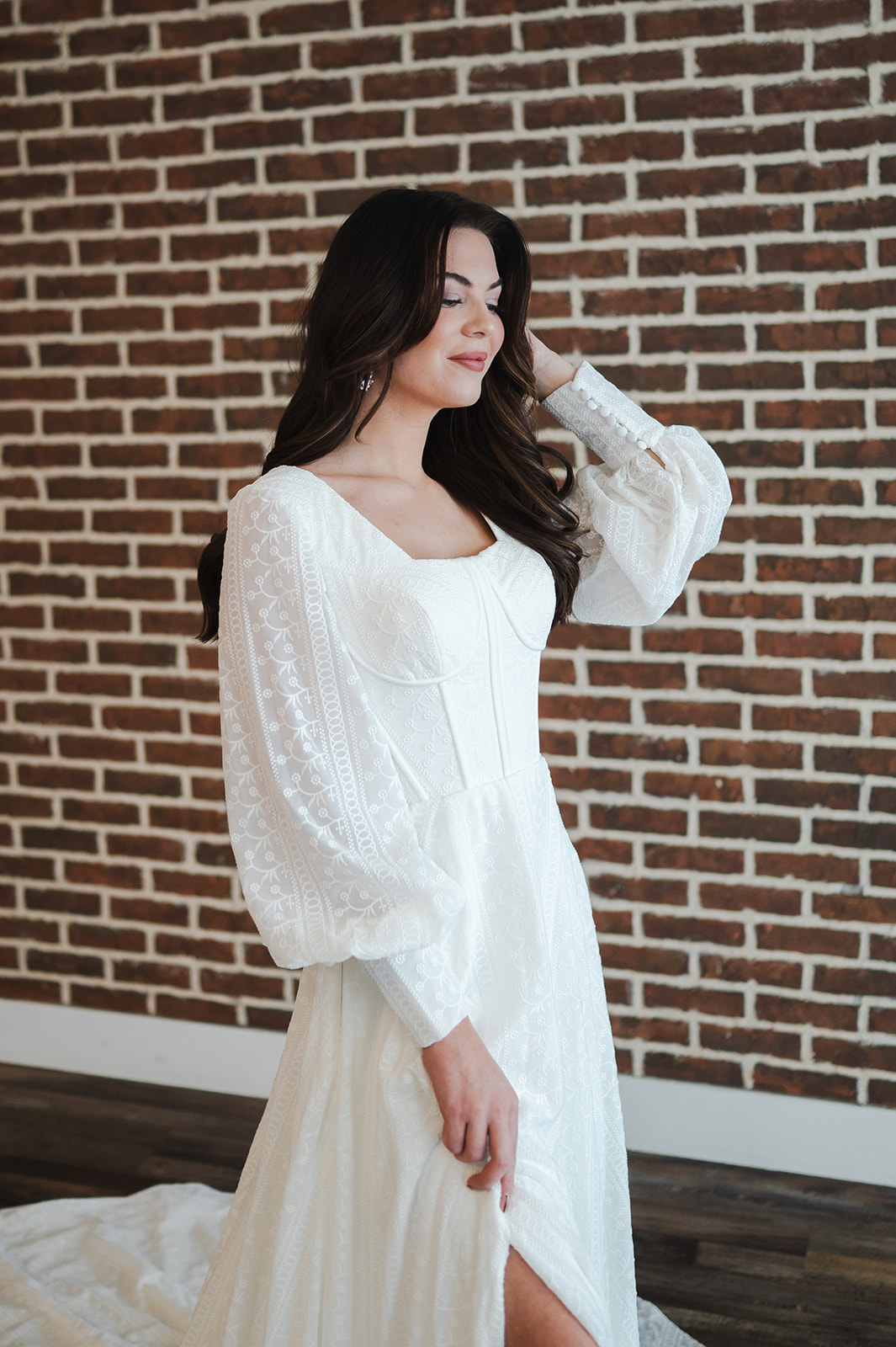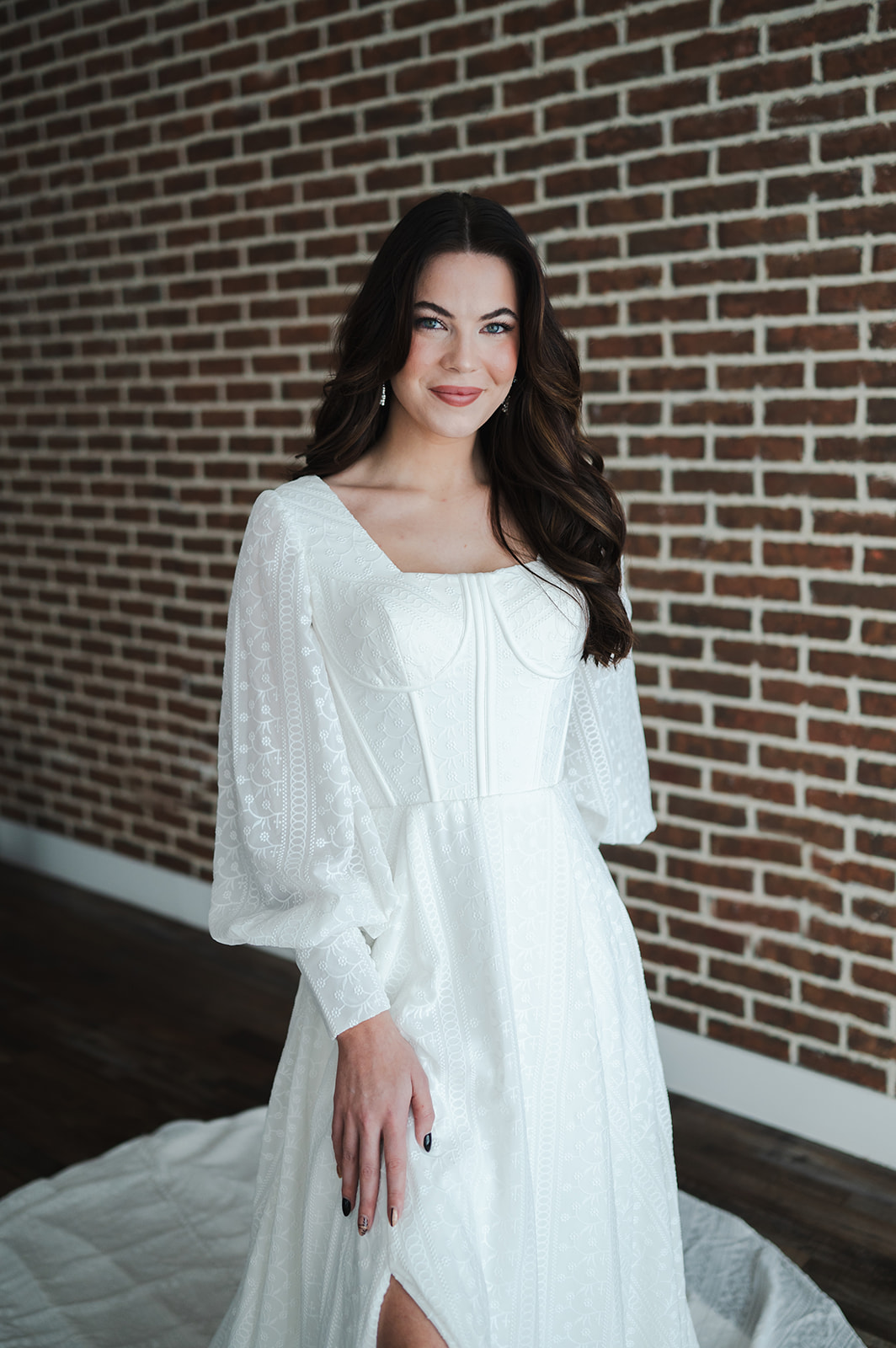 Cottagecore brides, meet the Addie gown. Featuring dainty lace fabric and breezy bishop sleeves. Finished with exposed boning and a sassy knee-high slit.