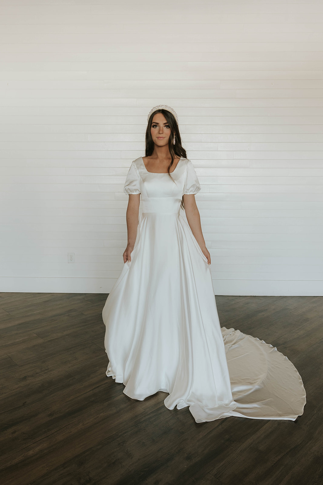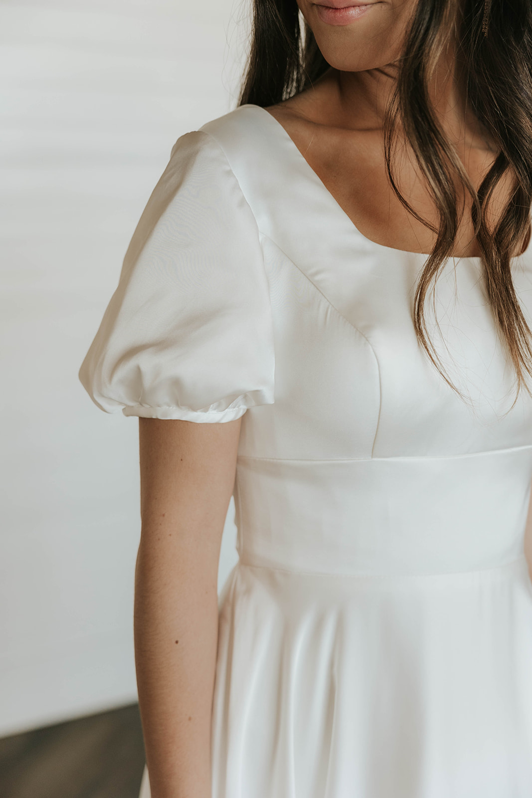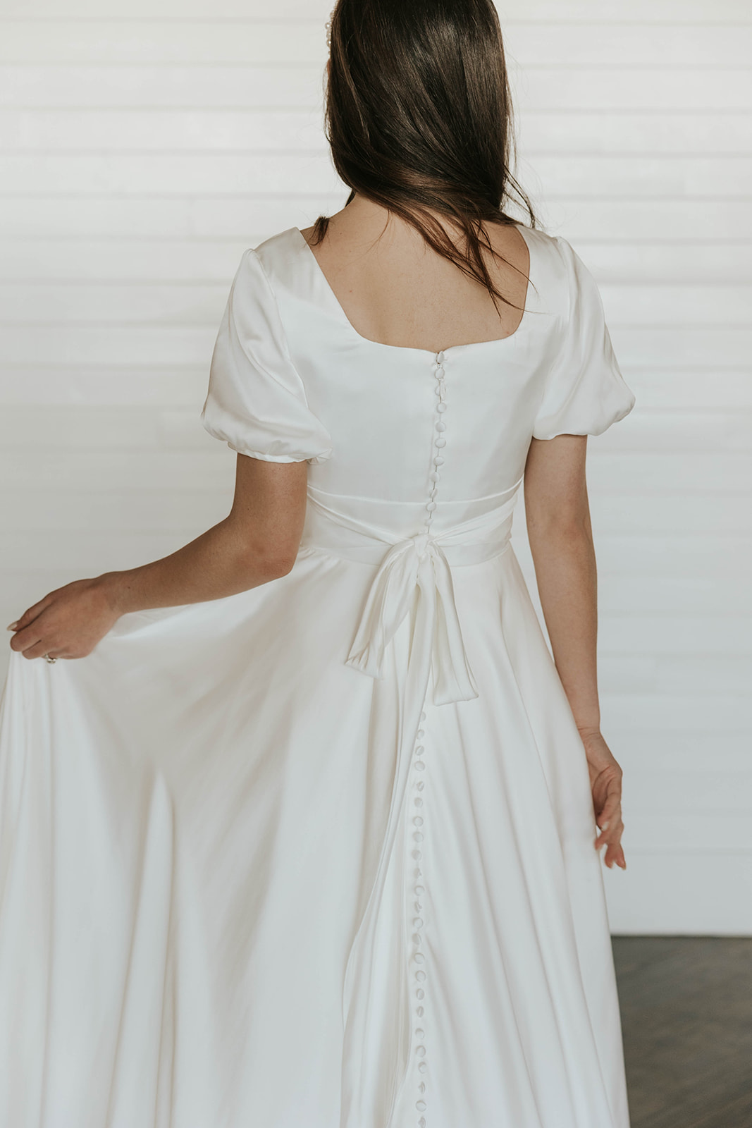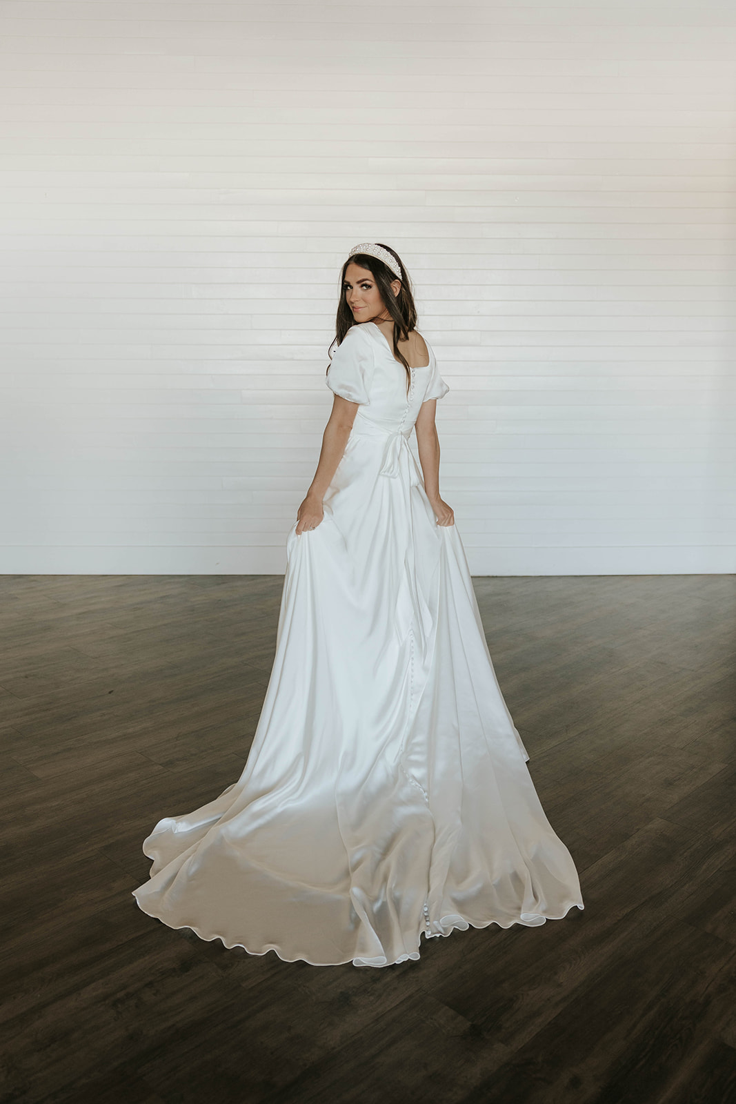 Lightweight satin makes the Georgie a flowy dream. Plus puff sleeves and a bow in the back- this gown is sweet and chic.
