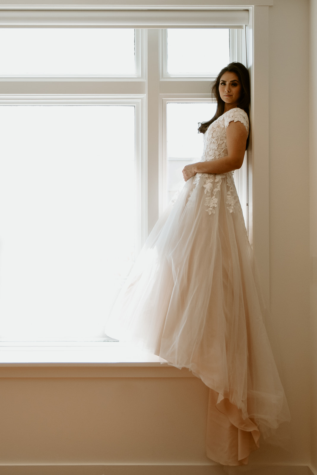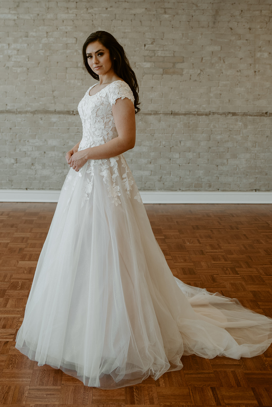 Soft lace appliques waterfall down the Harper gown, over top of a glitter tulle layer. The perfect ballgown for a princess bride.