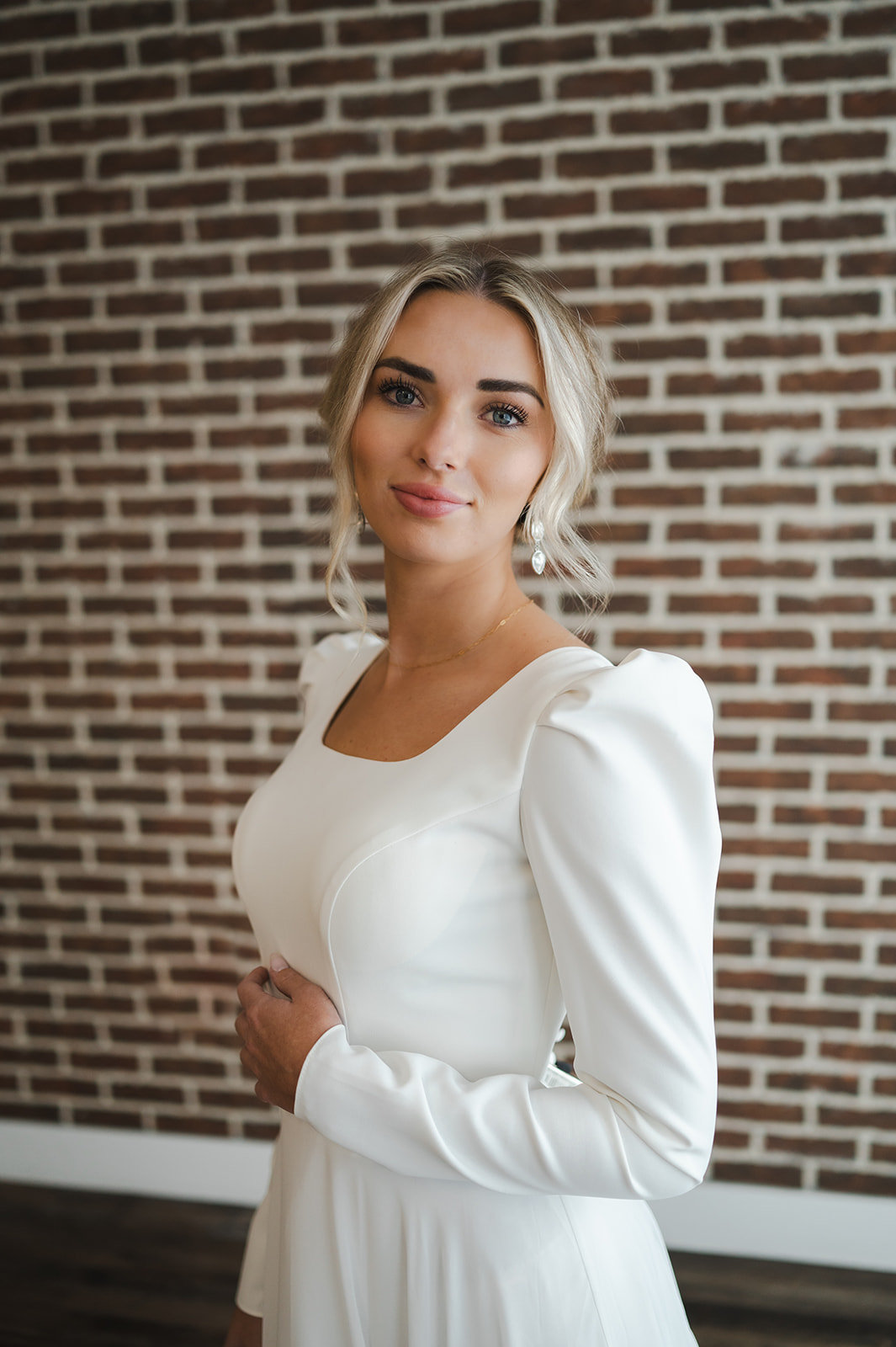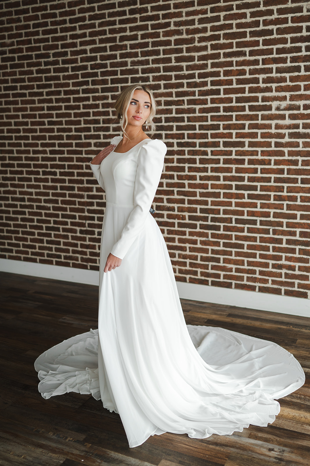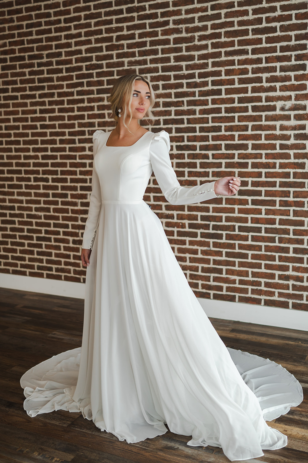 Square neck, soft chiffon, and couture puffed long sleeves make up the Iris gown. Simply elegant!