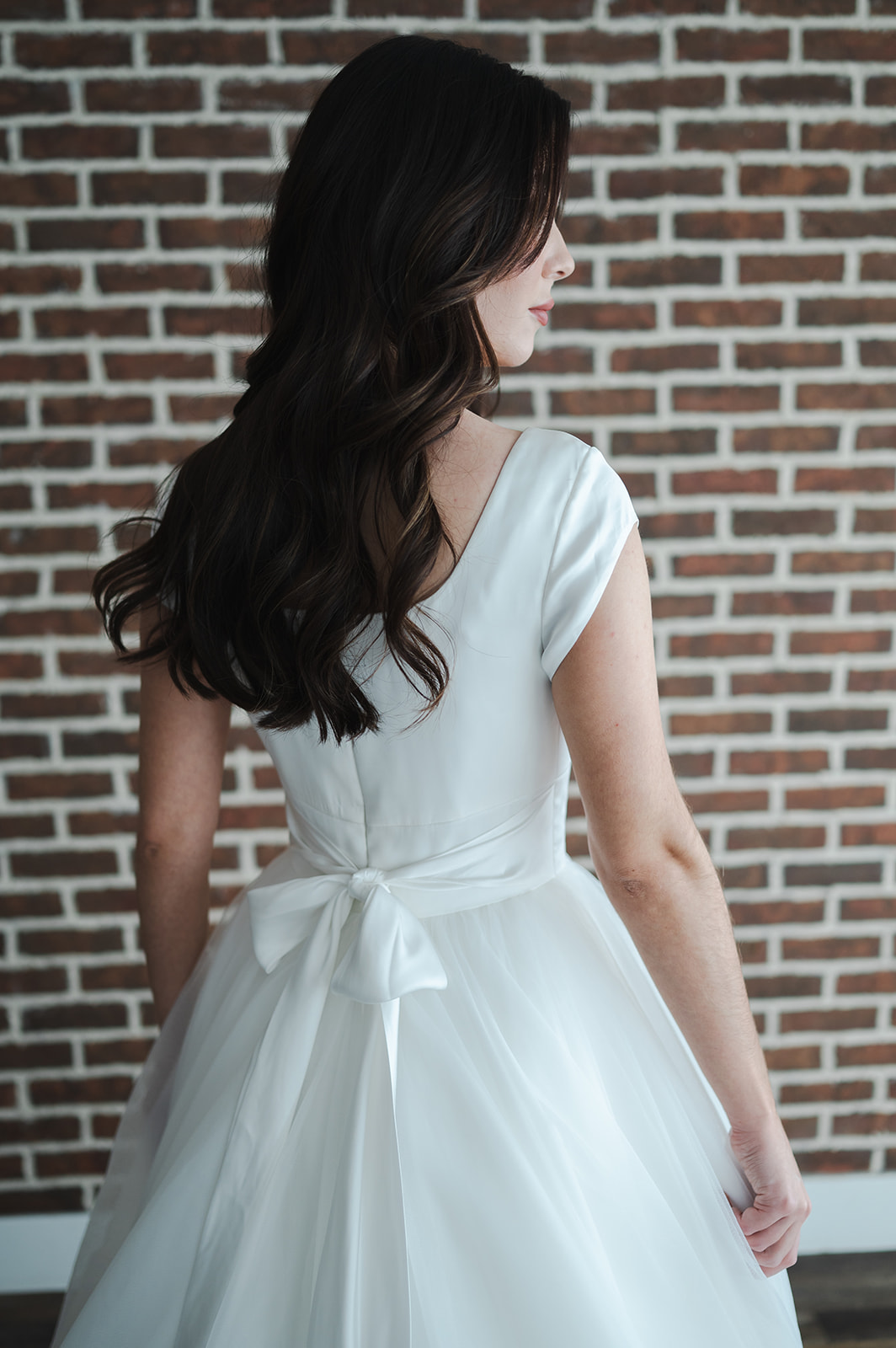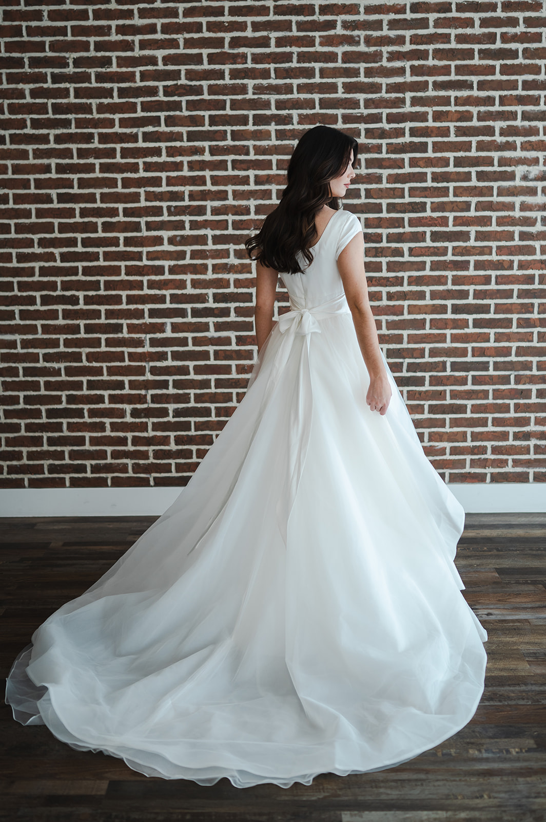 Luminous satin pairs with a ruffled English net skirt to bring beautiful texture to the Julia gown. Finished with a dainty tie-back bow.