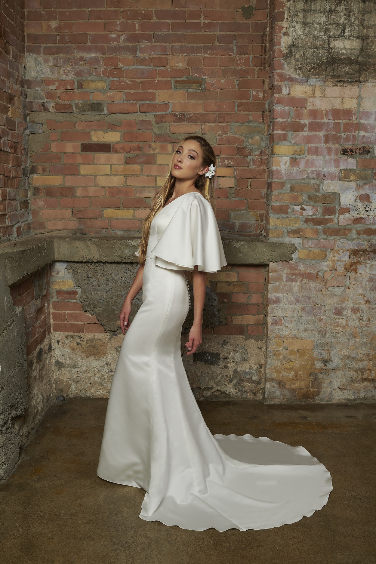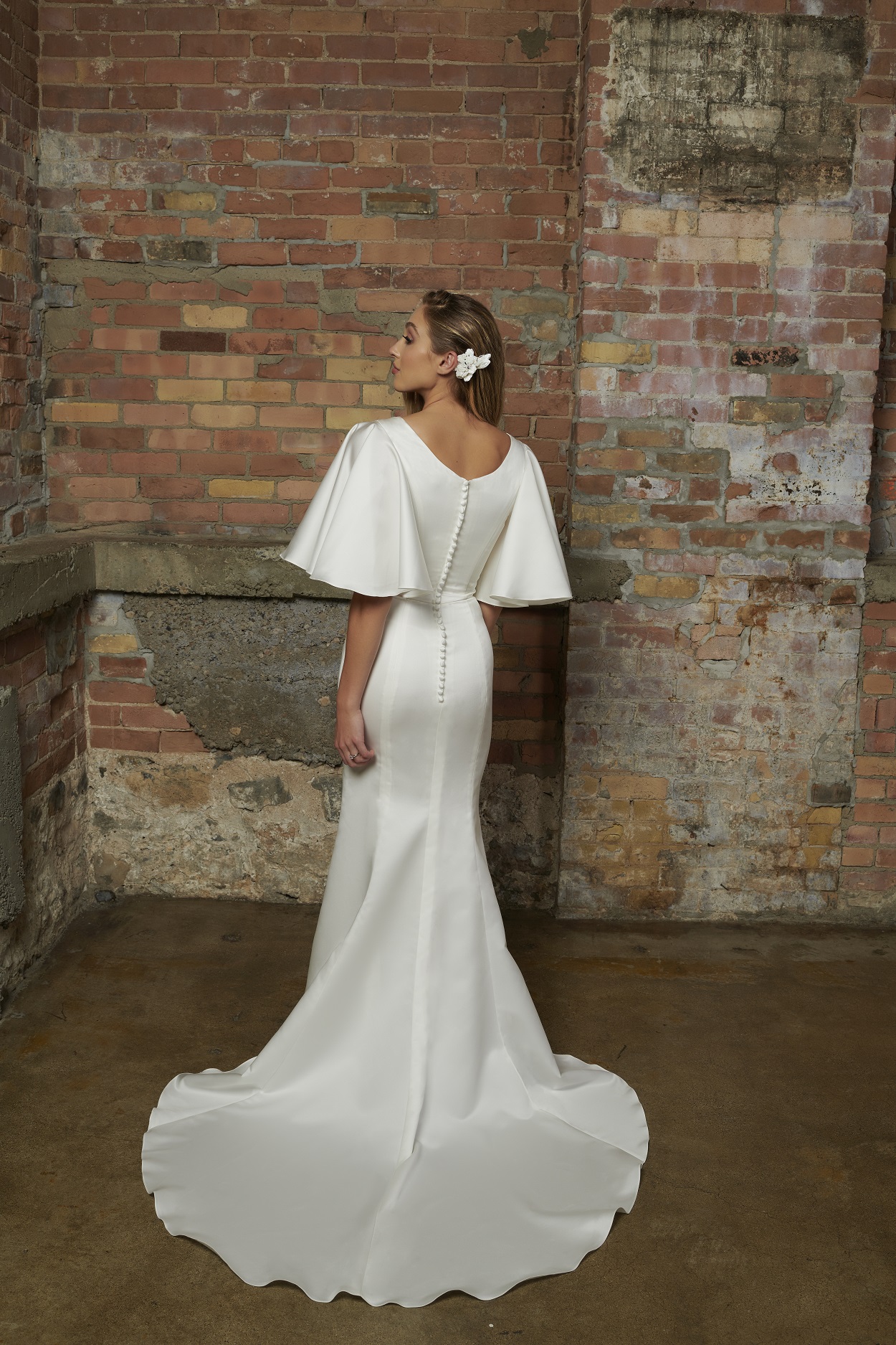 Say hello to statement making flutter sleeves with Lark ! A sleek satin fitted gown finished with buttons down the train.