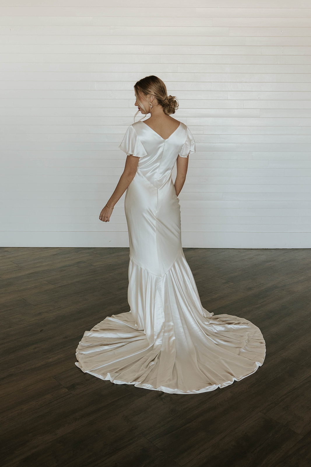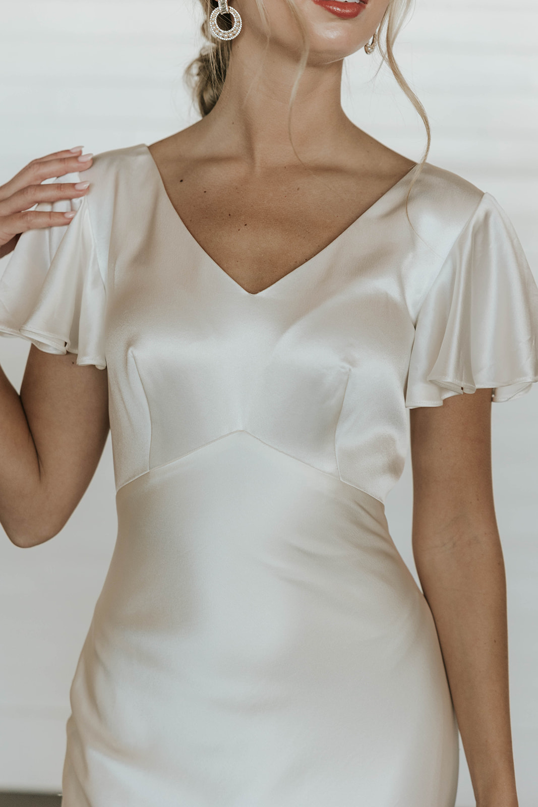 The Lindy gown is a shop favorite, and its easy to see why! Flutter sleeves, couture seamed detailing, and an elegant train, all made in a luxurious liquid satin.