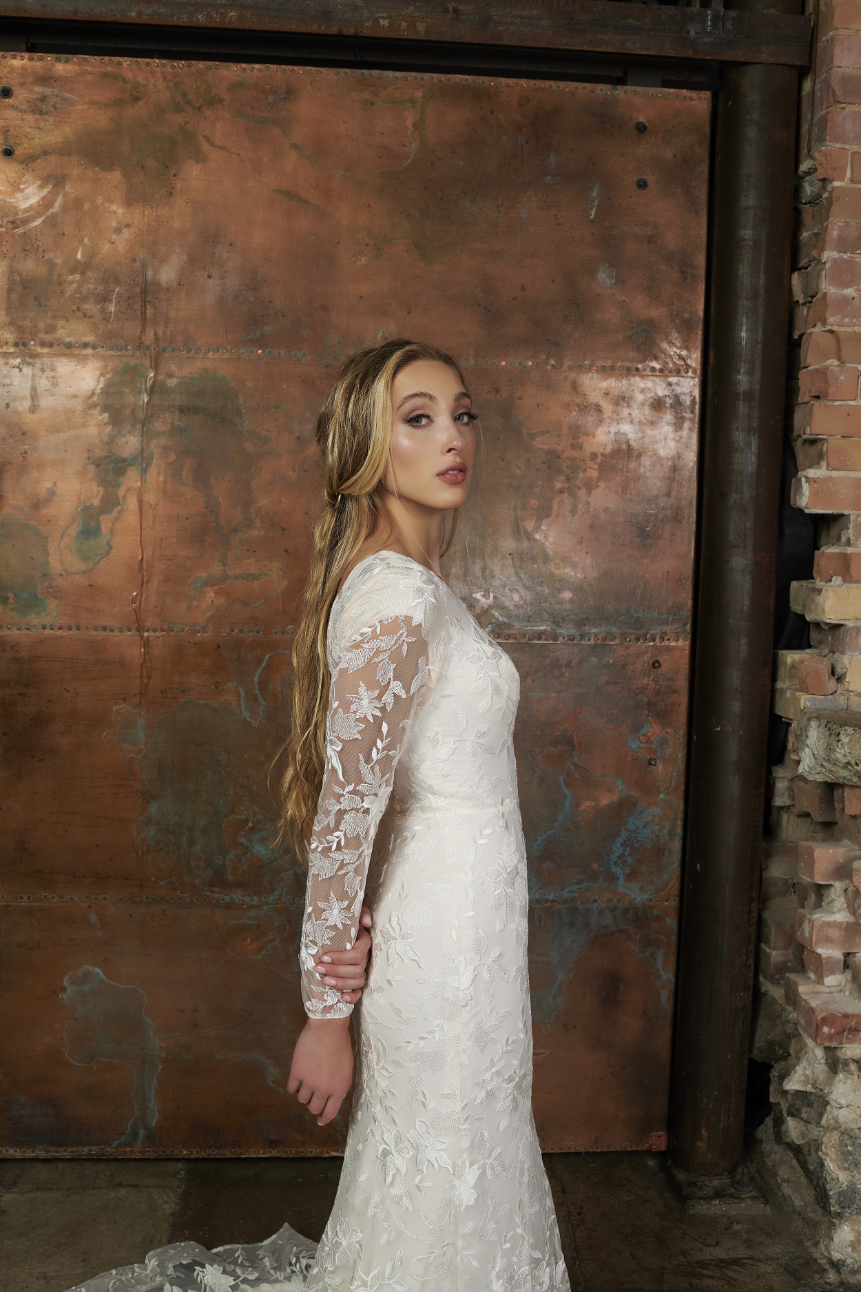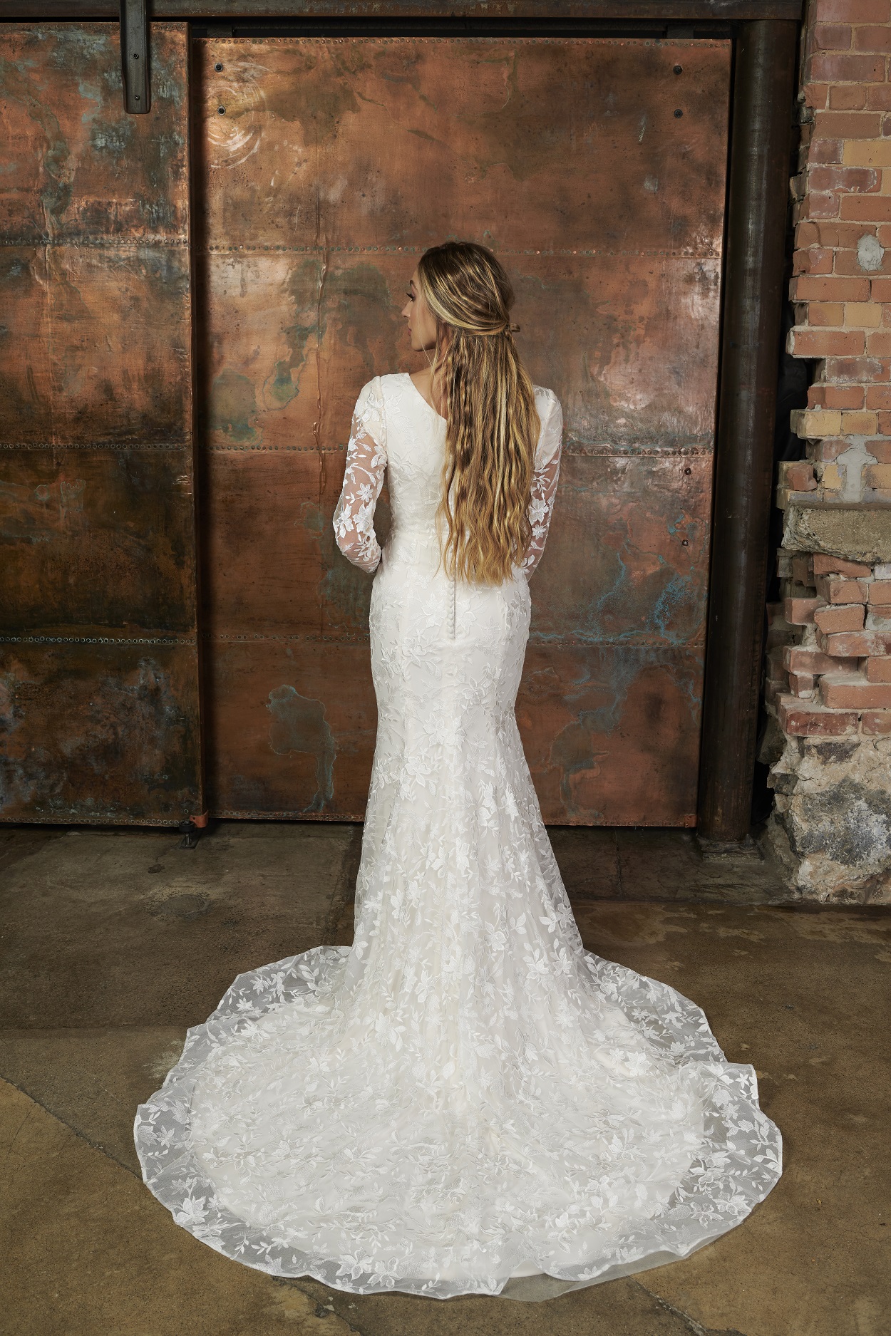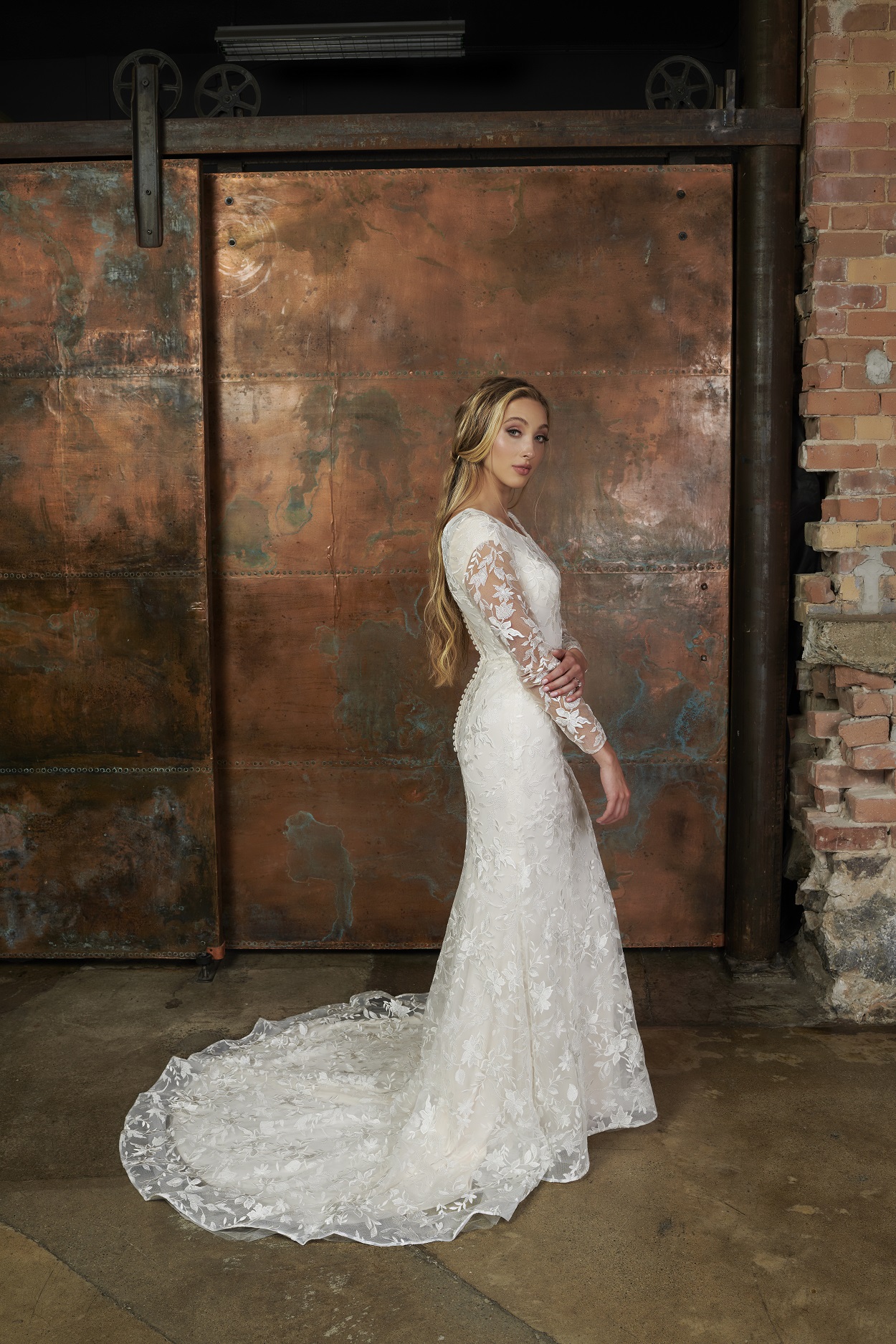 Modern floral sheet lace over soft jersey lining, plus illusion sleeves... What's not to love about the Rian gown? Buttons down to the end of the train are the perfect finishing touch.