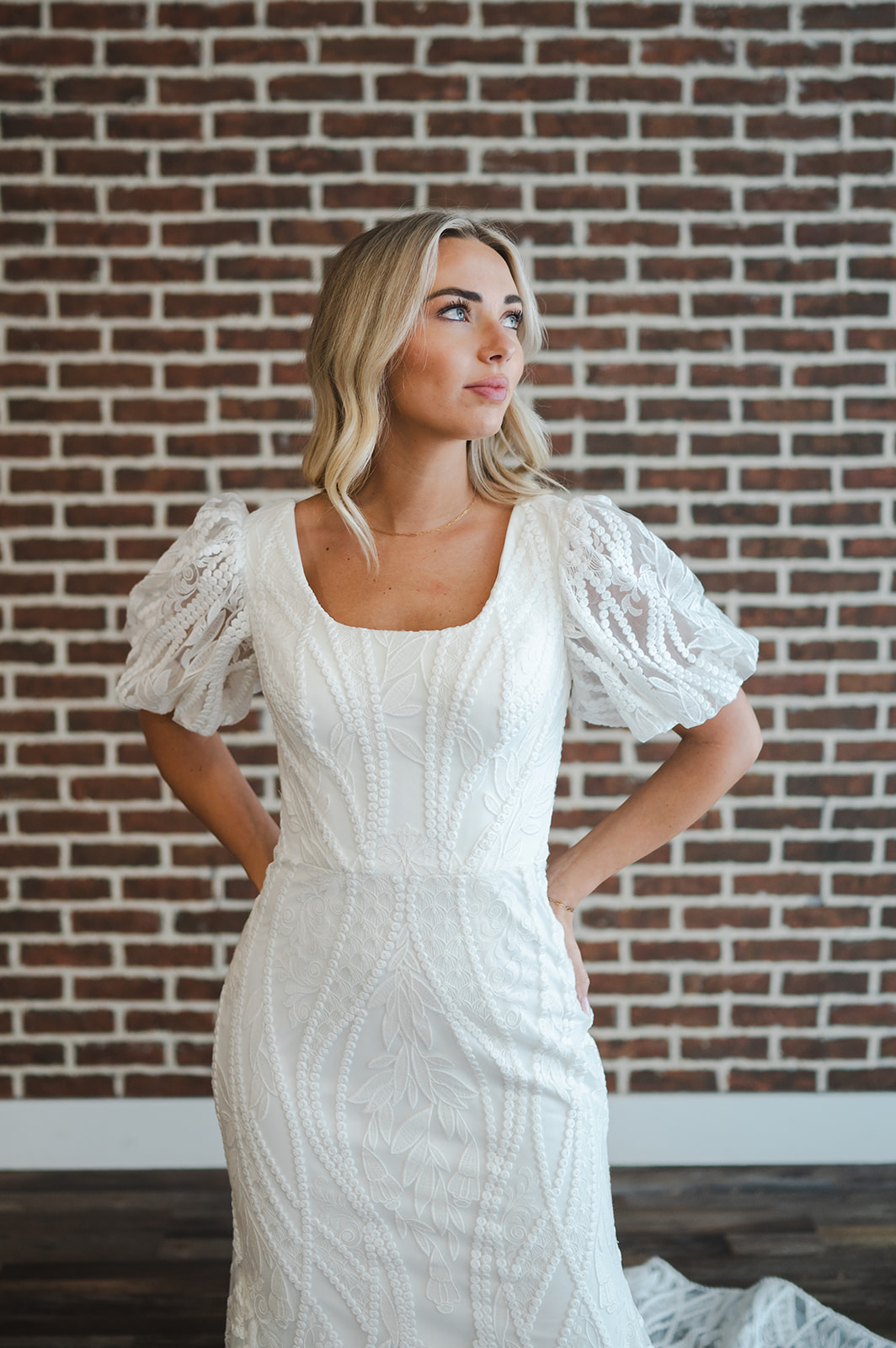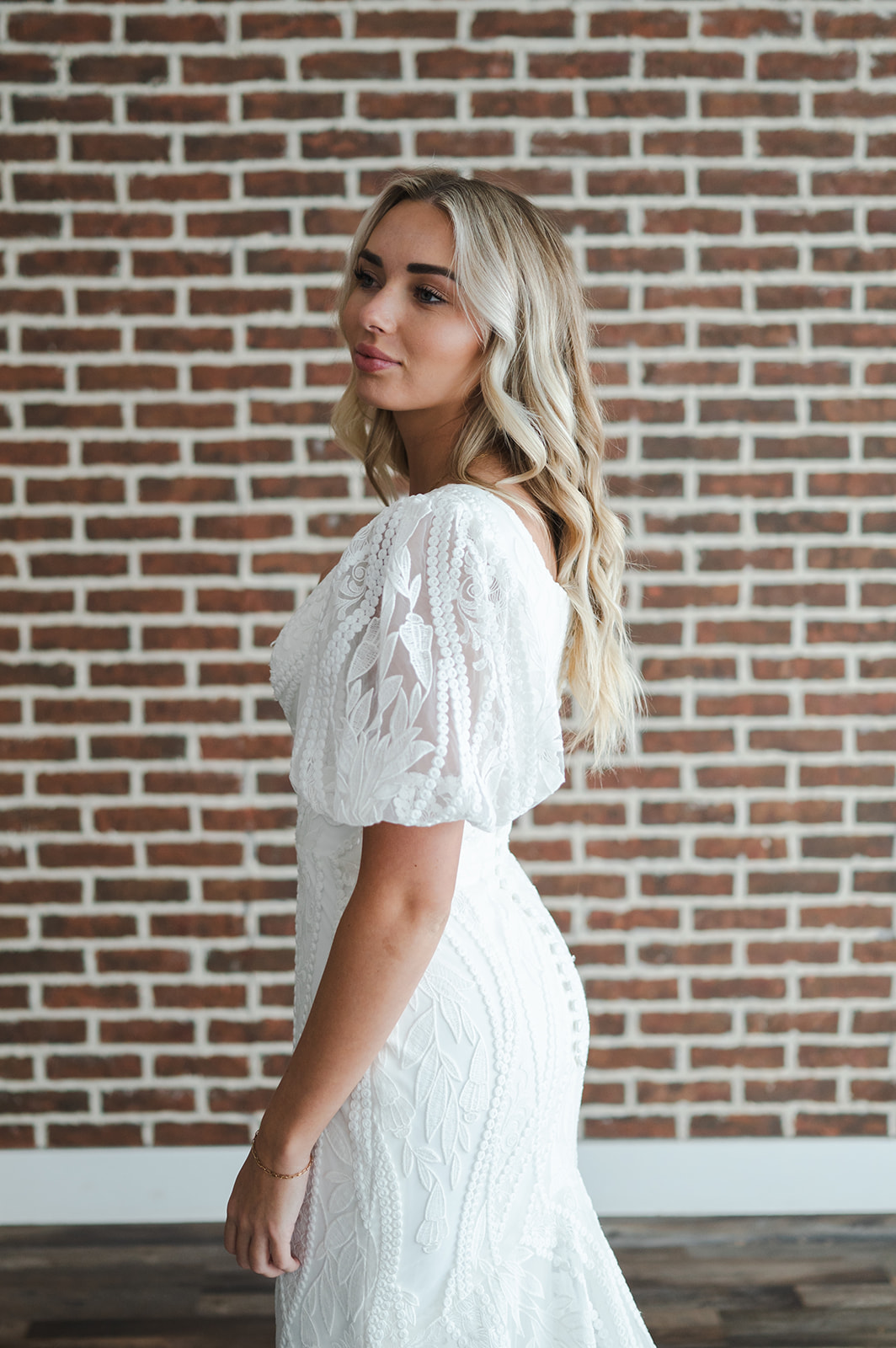 The Ruth gown has no shortage of details to love! Intricate boho lace drapes into a soft fit and flare shape, with a stunning illusion train. Finished with puffed sleeves and buttons down the zipper.