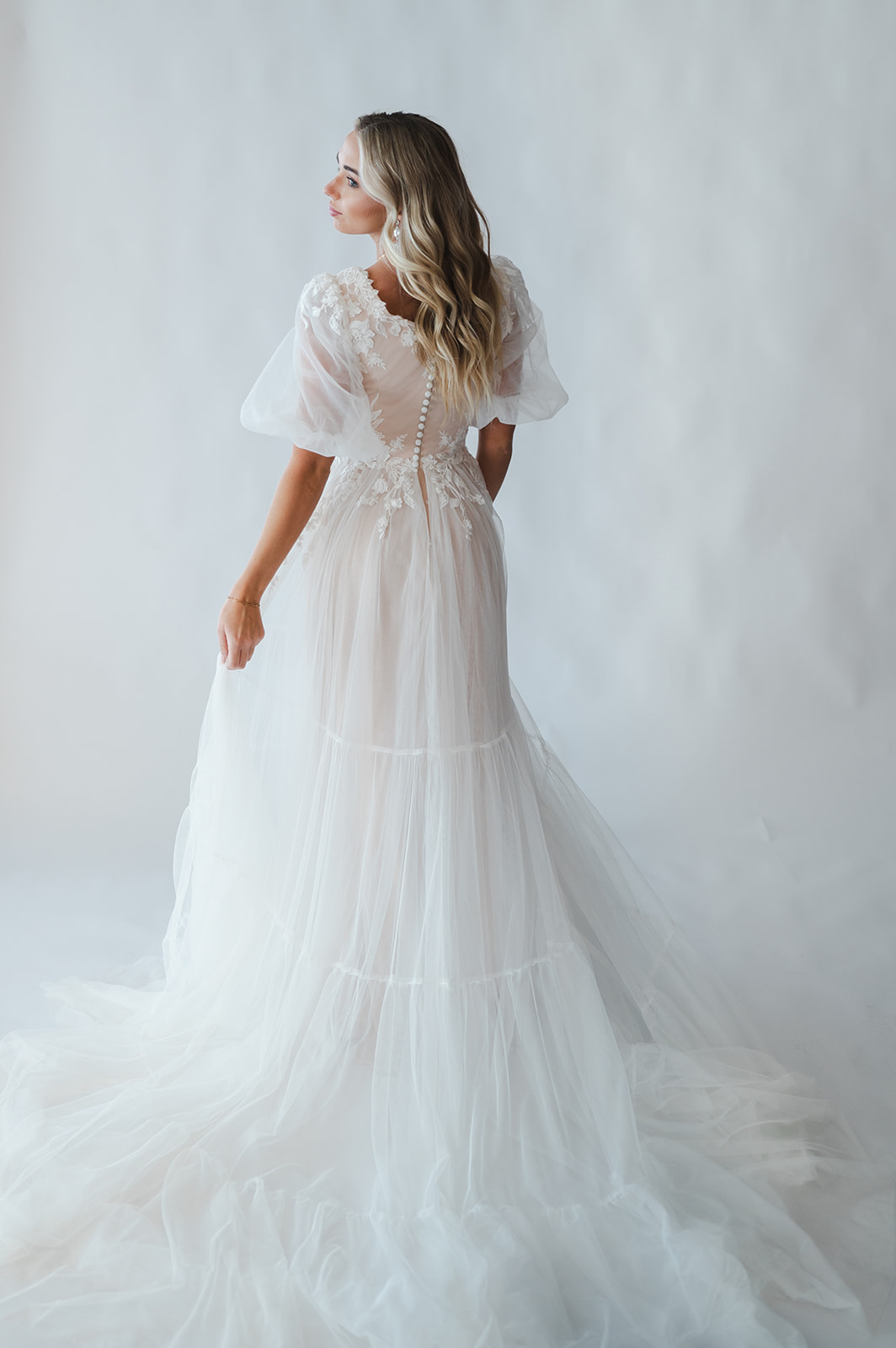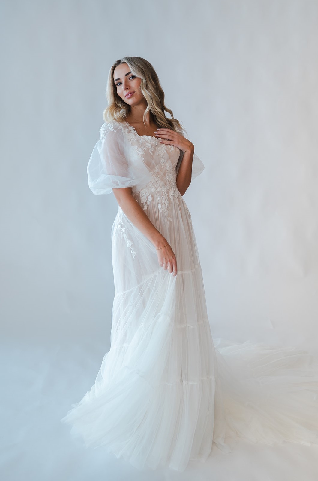 Romantic and whimsical... that's the Sawyer gown. Featuring delicate puff sleeves and dainty waterfall lace appliques down into the tiered Italian tulle skirt.