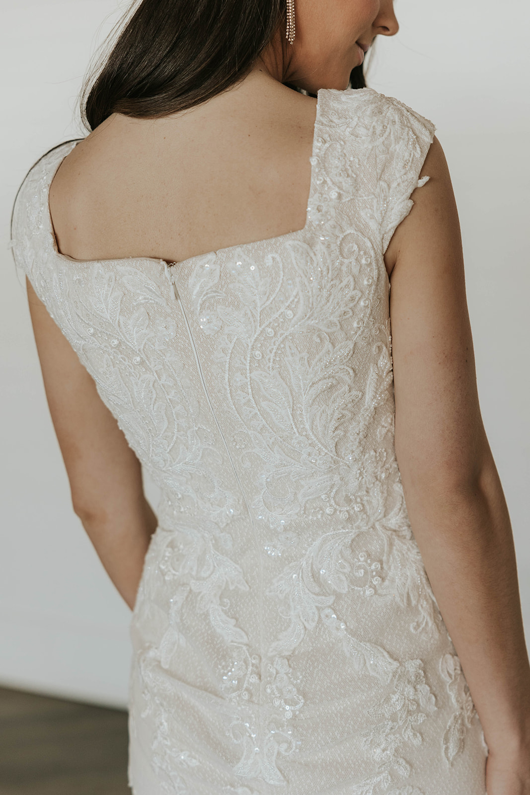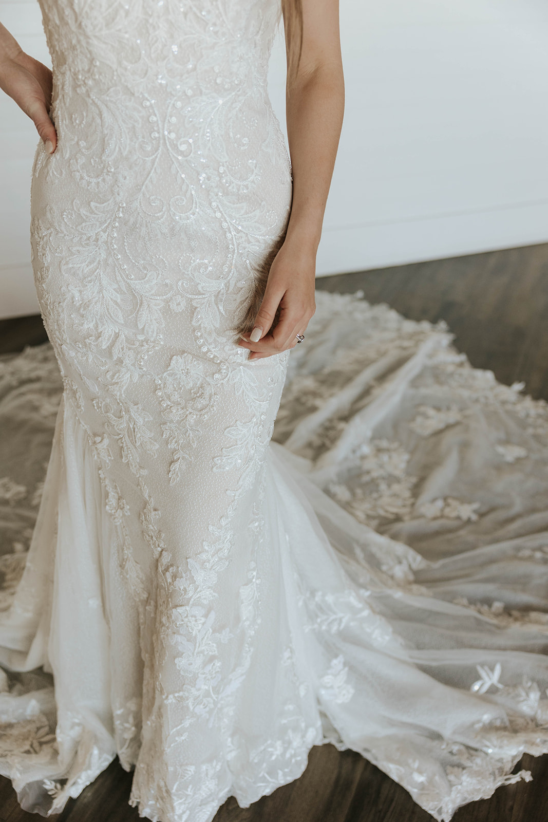 Romantic floral lace covers this fitted gown, while the stunning illusion train flares behind. Beaded detailing and a square neckline make the Serena the perfect gown for the glamorous bride.
