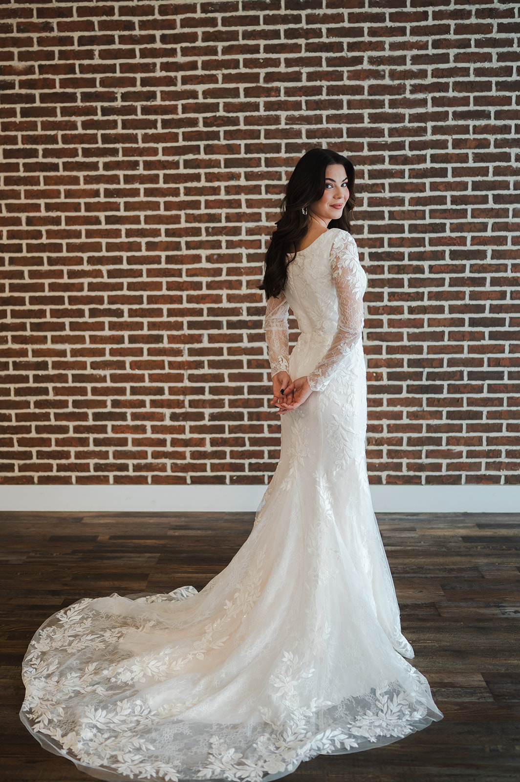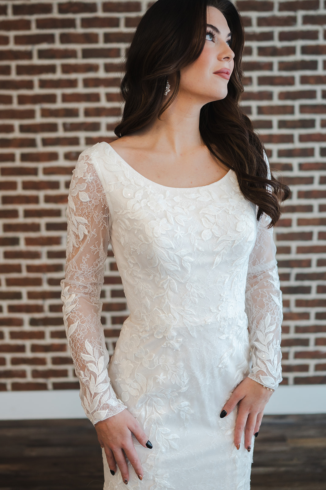 The Smith gown is perfect for the glamorous bride! Made of double layered lace with a glitter tulle underlay, lined in soft jersey and finished with an illusion sleeve.