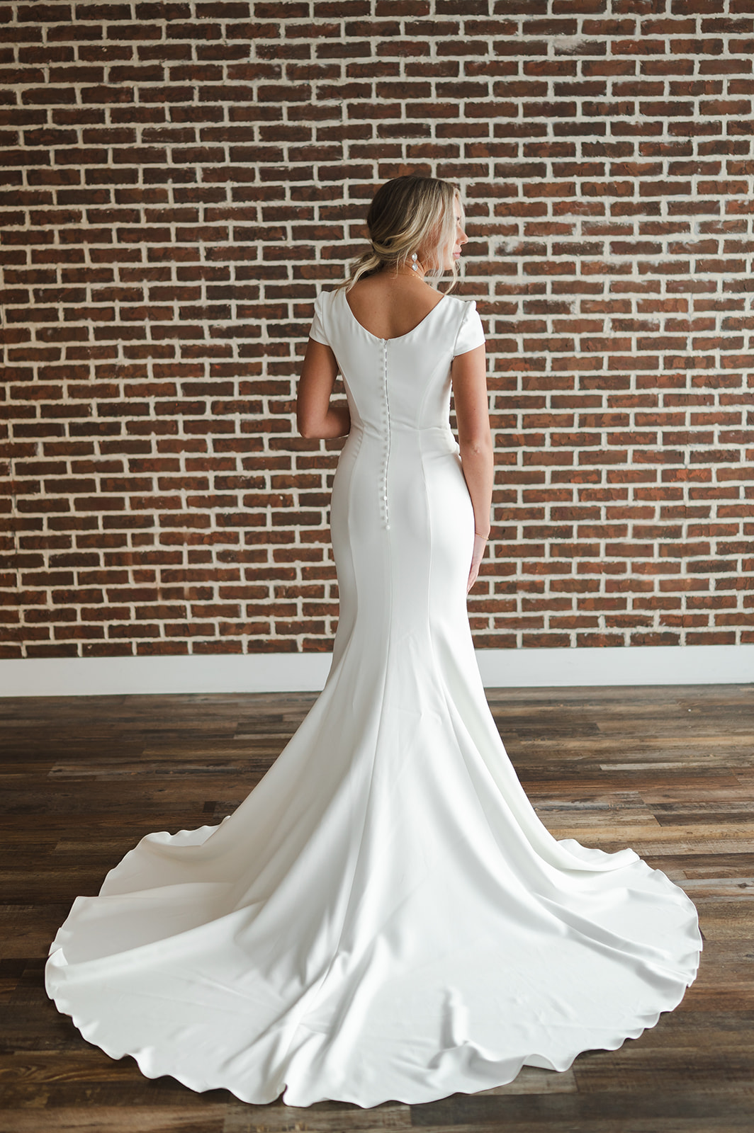 Soft crepe with structured rouching makes the Taylor gown elegant and comfortable. Finished with simple cap sleeves and button detailing down the zipper.
