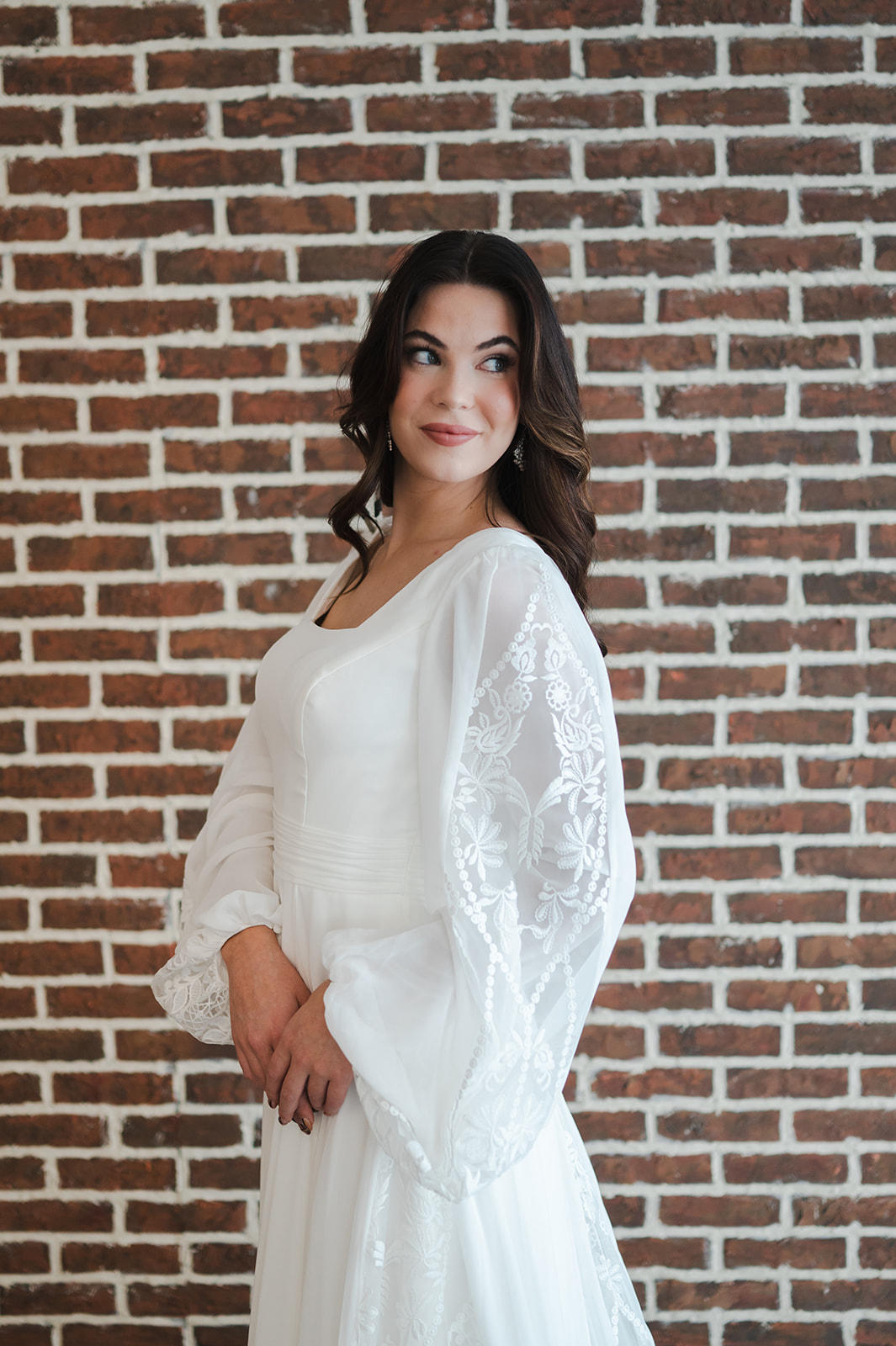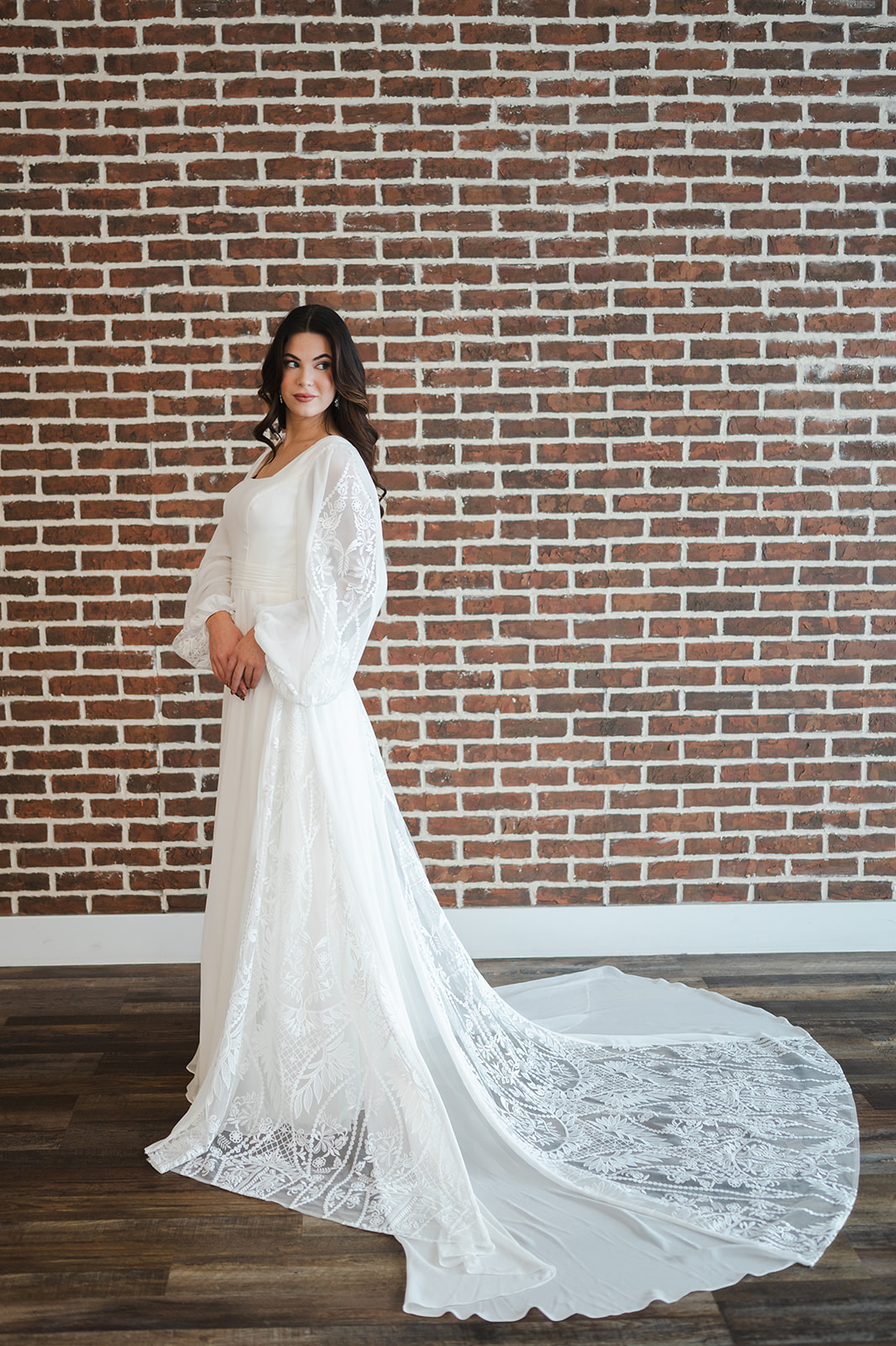 Modern boho meets classic elegance in the Willow gown. Dreamy chiffon with lace insert details, plus a pleated detailing at the waist.